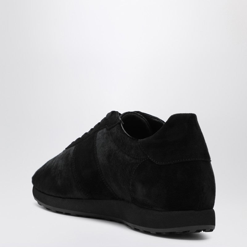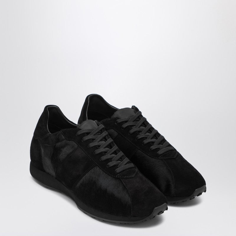 Sneakety rzędowe w czarnych kucykach z aksamitnymi wkładkami, zawierające koronkowe zamknięcie i gumową podeszwę.