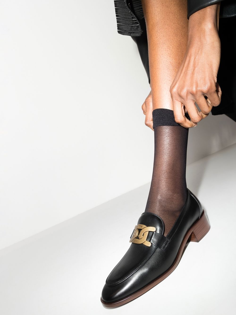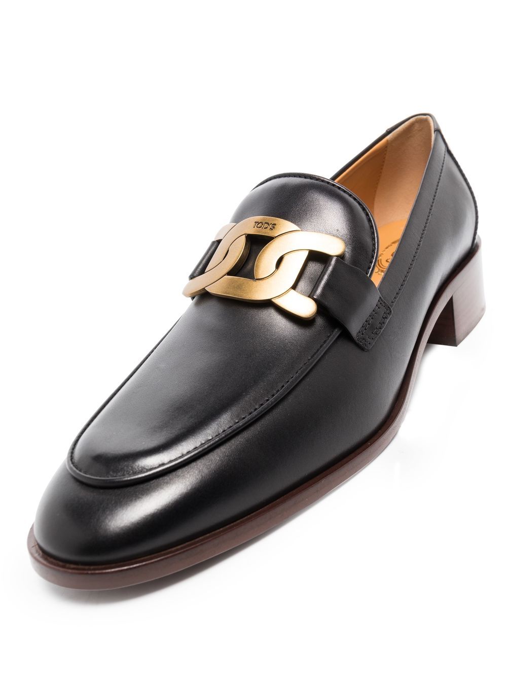 Mokasyny detali łańcucha z czarnego, skóry, ze złotego sprzętu, detale łącza łańcucha, styl władzy, okrągłe palce, płaska gumowa podeszwa i markowa wkładka.