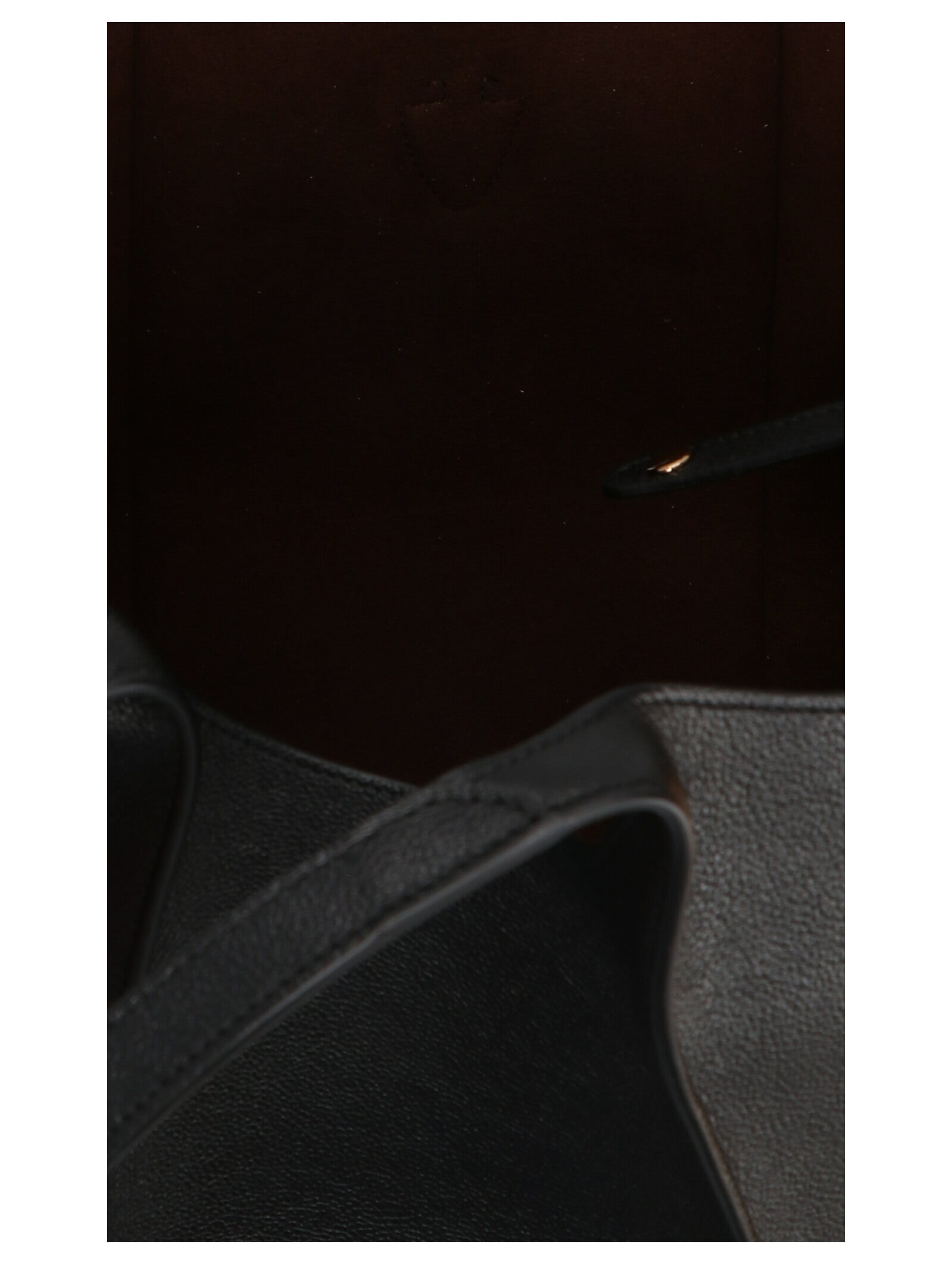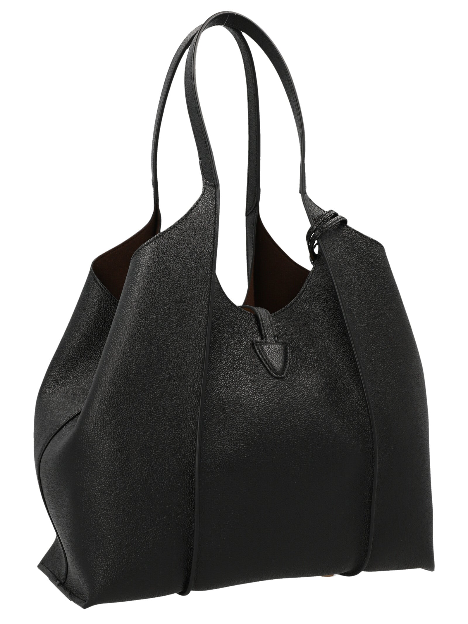 Mała „ponadczasowa” torba na zakupy w chętnej skórze z żebrbingiem, niestandardowe metalowe akcesorium wisiorek i podwójne uchwyty, duży wewnętrzny przedział z wyjmowaną torebką.