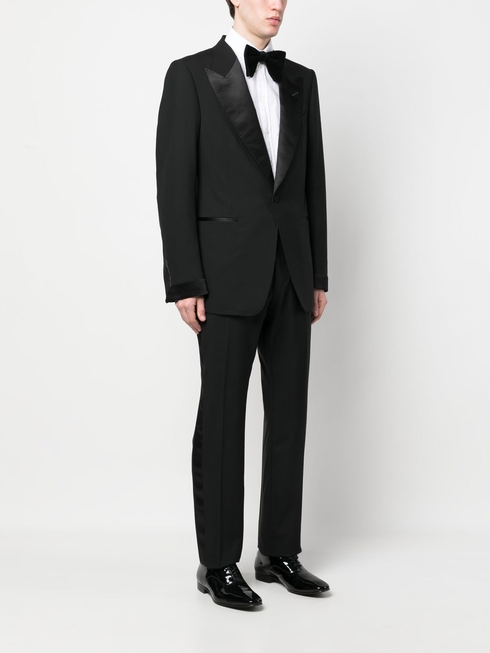 Kombinezon wełny szczytowej z Toma Forda z czarnymi, wełnianymi, jedwabnymi klapami, szczytowymi klapami, mocowaniem z przodu, dwóch bocznych kieszenia na boki i ukryte przednie mocowanie.