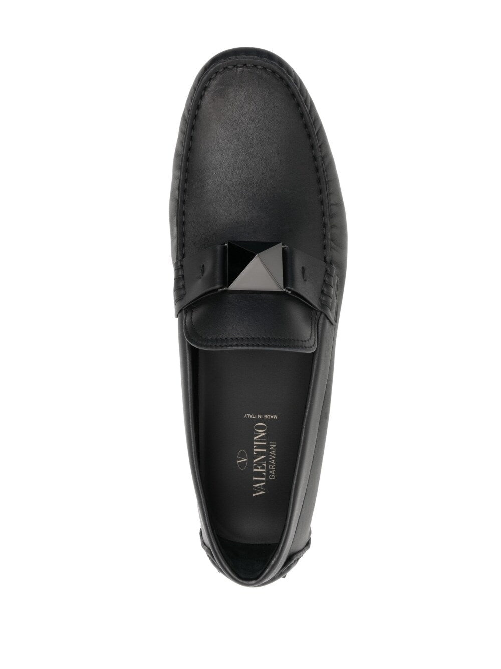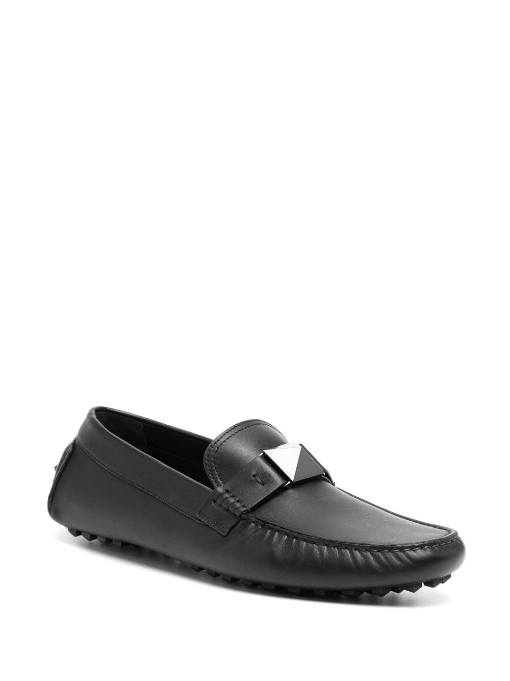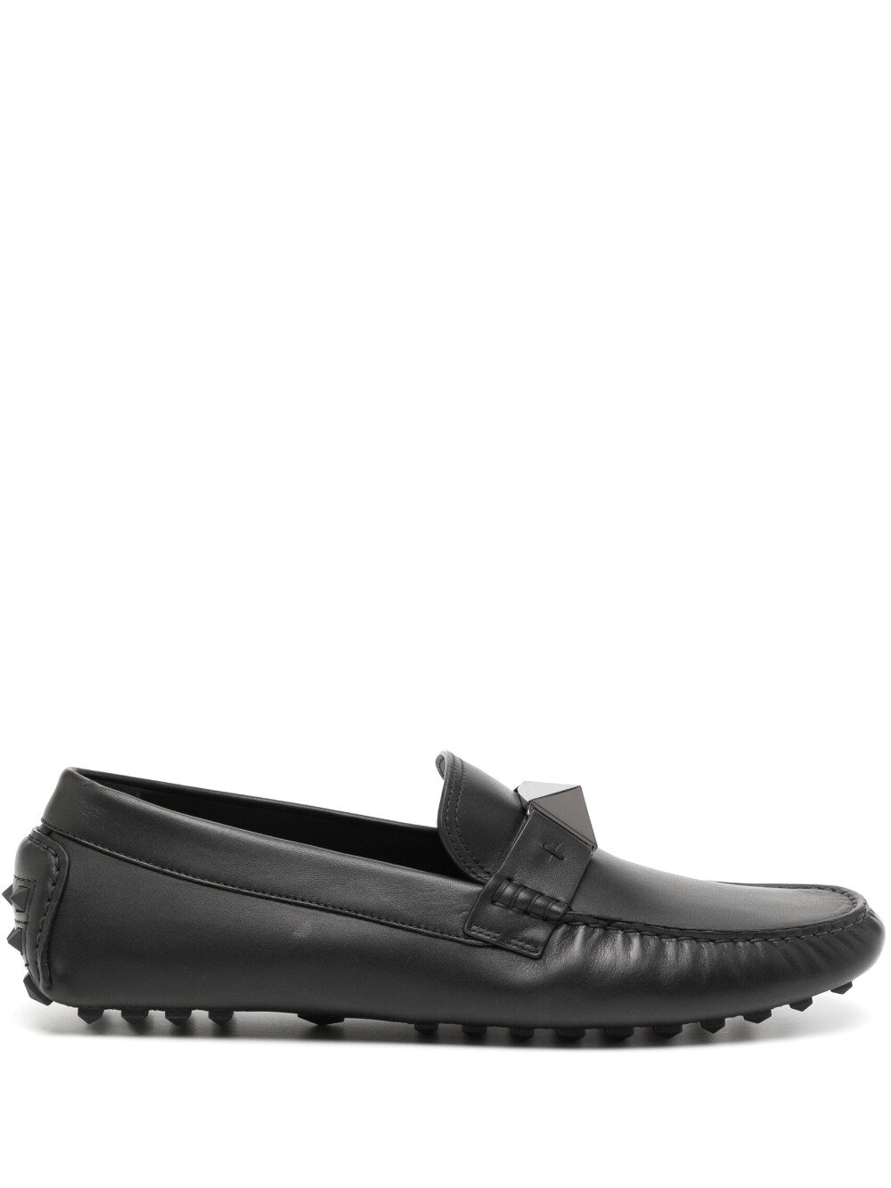 Rockstud upiększone buty do kierowcy Valentino Garavani z czarnym, skóry, charakterystycznym ozdobem rockstud, w stylu poślizgu, okrągłego palca i płaskiej gumowej podeszwy.
