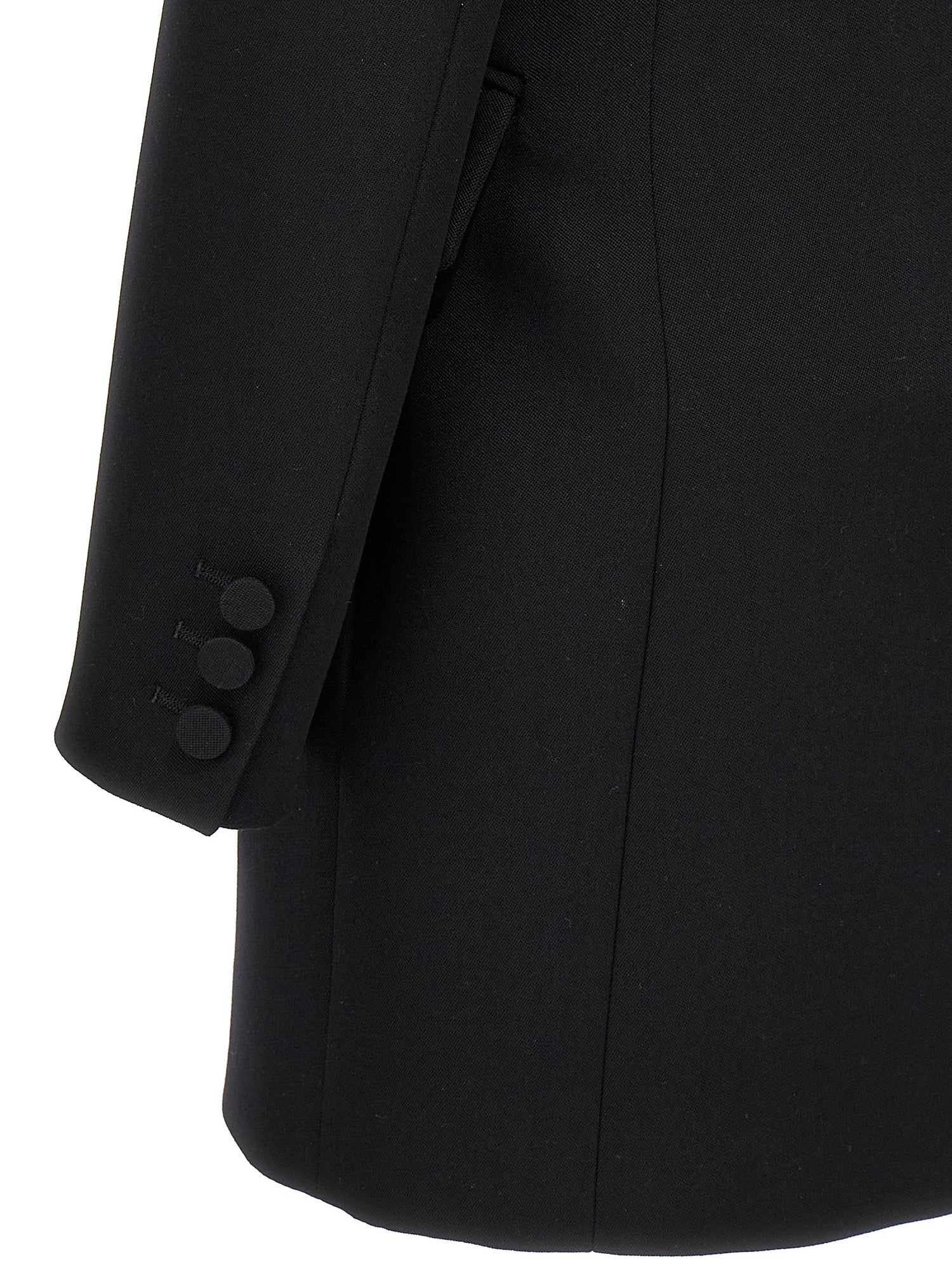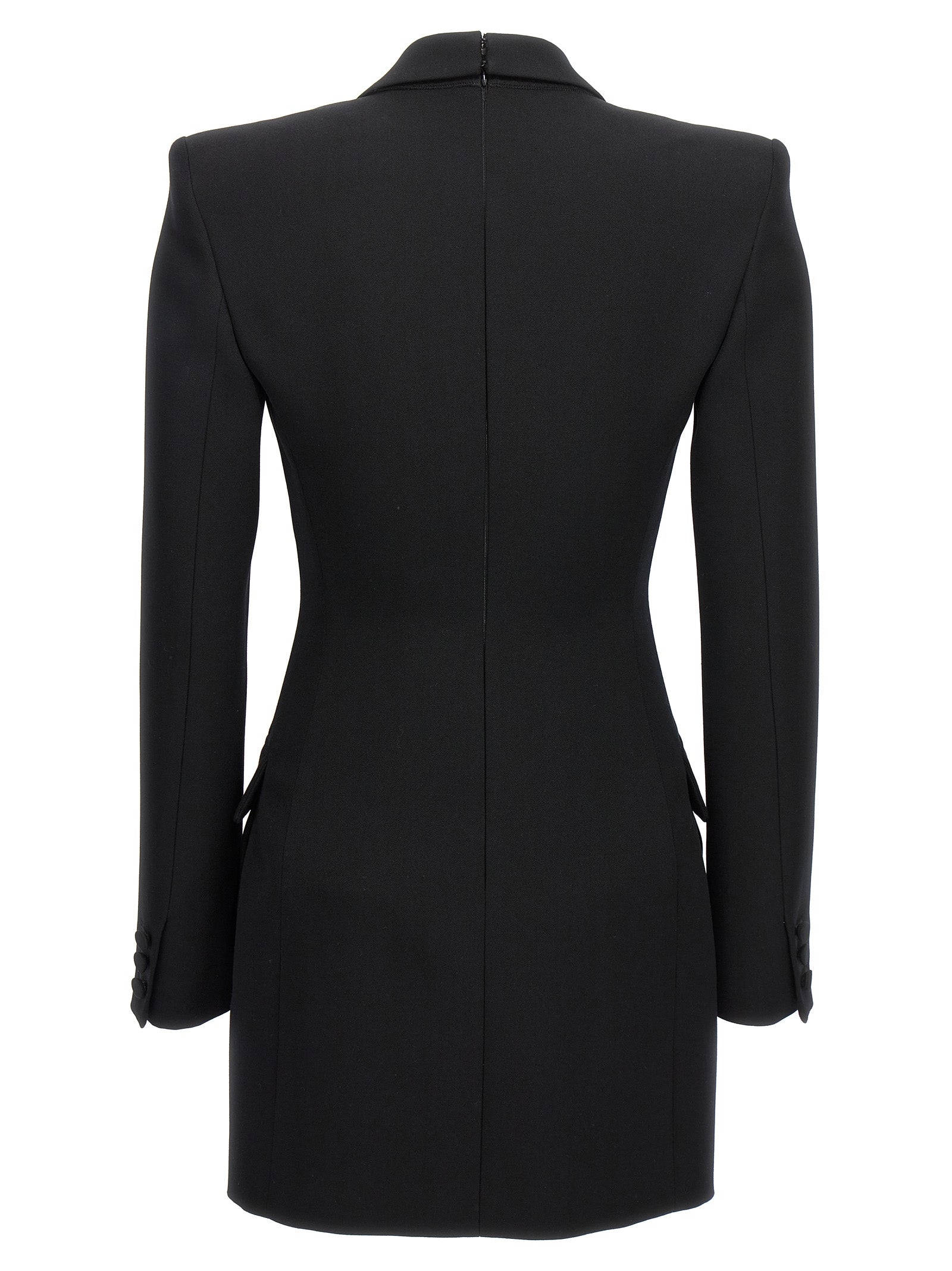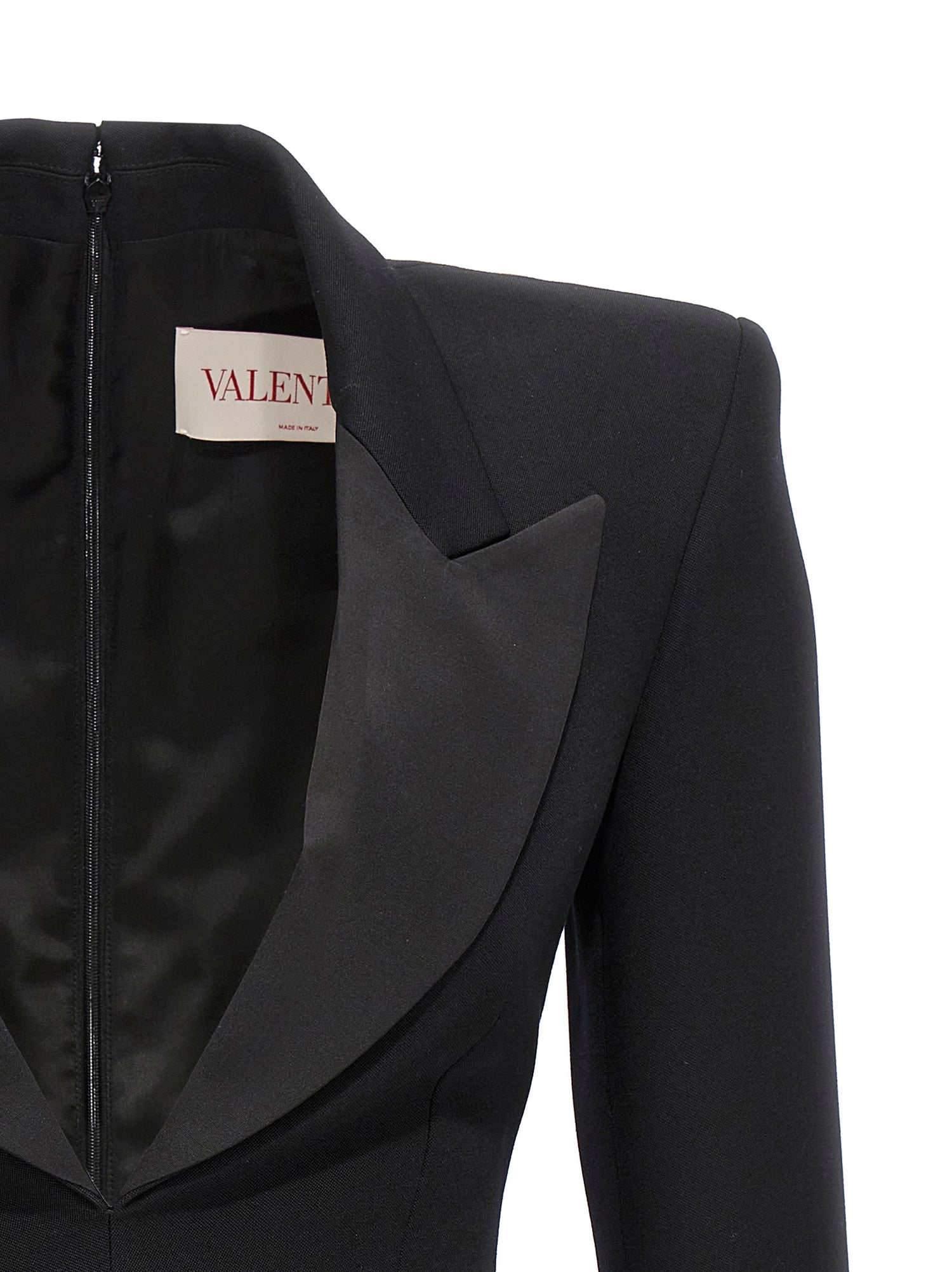 Sukienka wełniana smokingowa, dekolt z klapami, strukturalne ramiona, długie rękawy, kieszenie, zamknięcie zapinane na zamek.