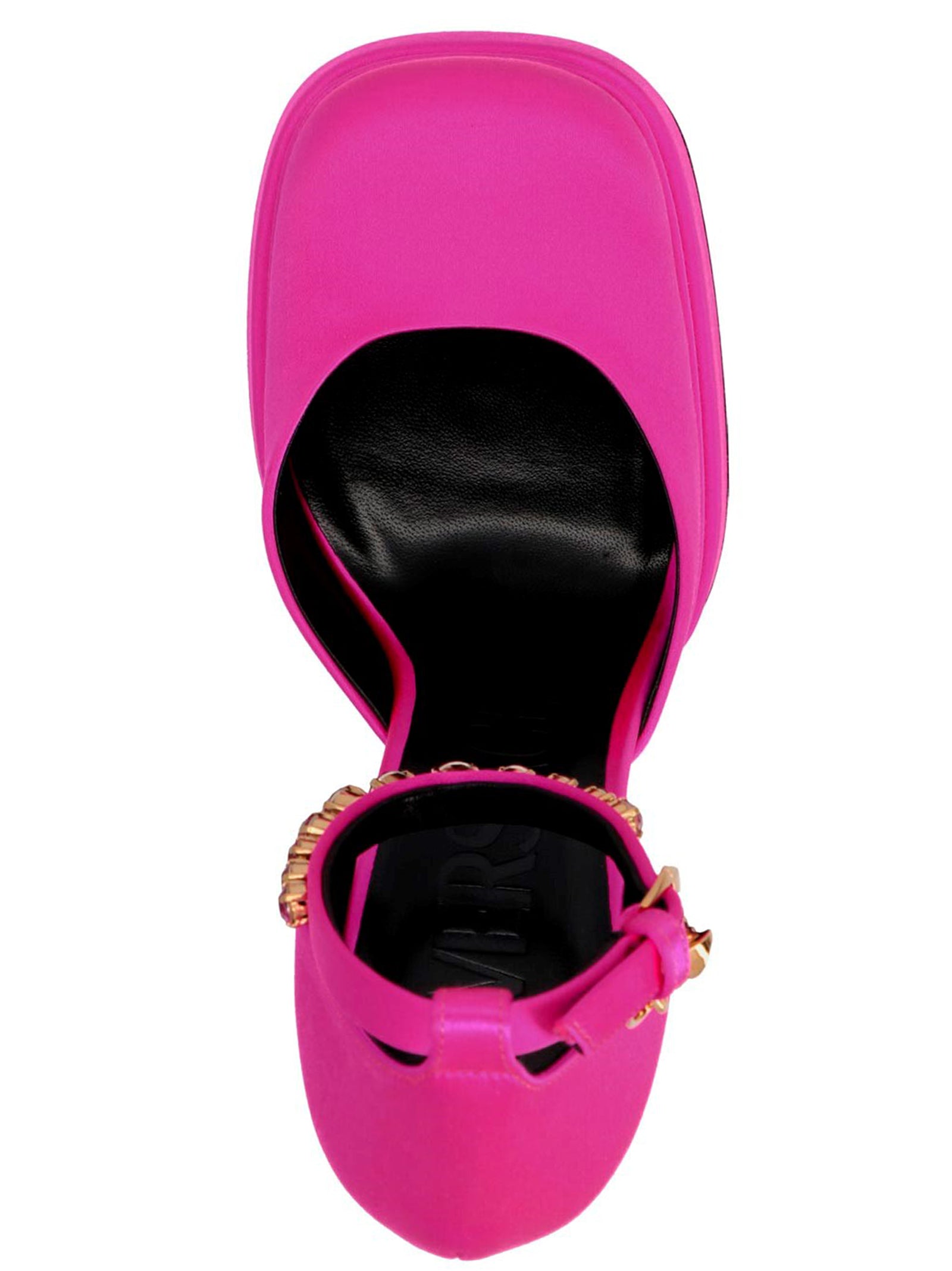 Satynowe pompy Medusa „Medusa Aevitas” z paskiem ozdobionym cekinami i urokiem Medusa.