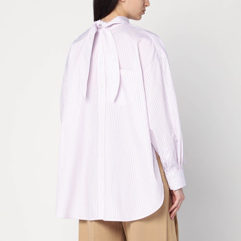 Szeroka koszula Victoria Beckham w ekologicznej bawełnie z białymi i liliowymi paskami, zawierającą wysoki kołnierz z łukiem z tyłu, na zewnątrz, z zamykaniem guzików, kieszeń z tyłu, długie rękawy z zapinanymi mankietami i zakrzywiony rąbek.