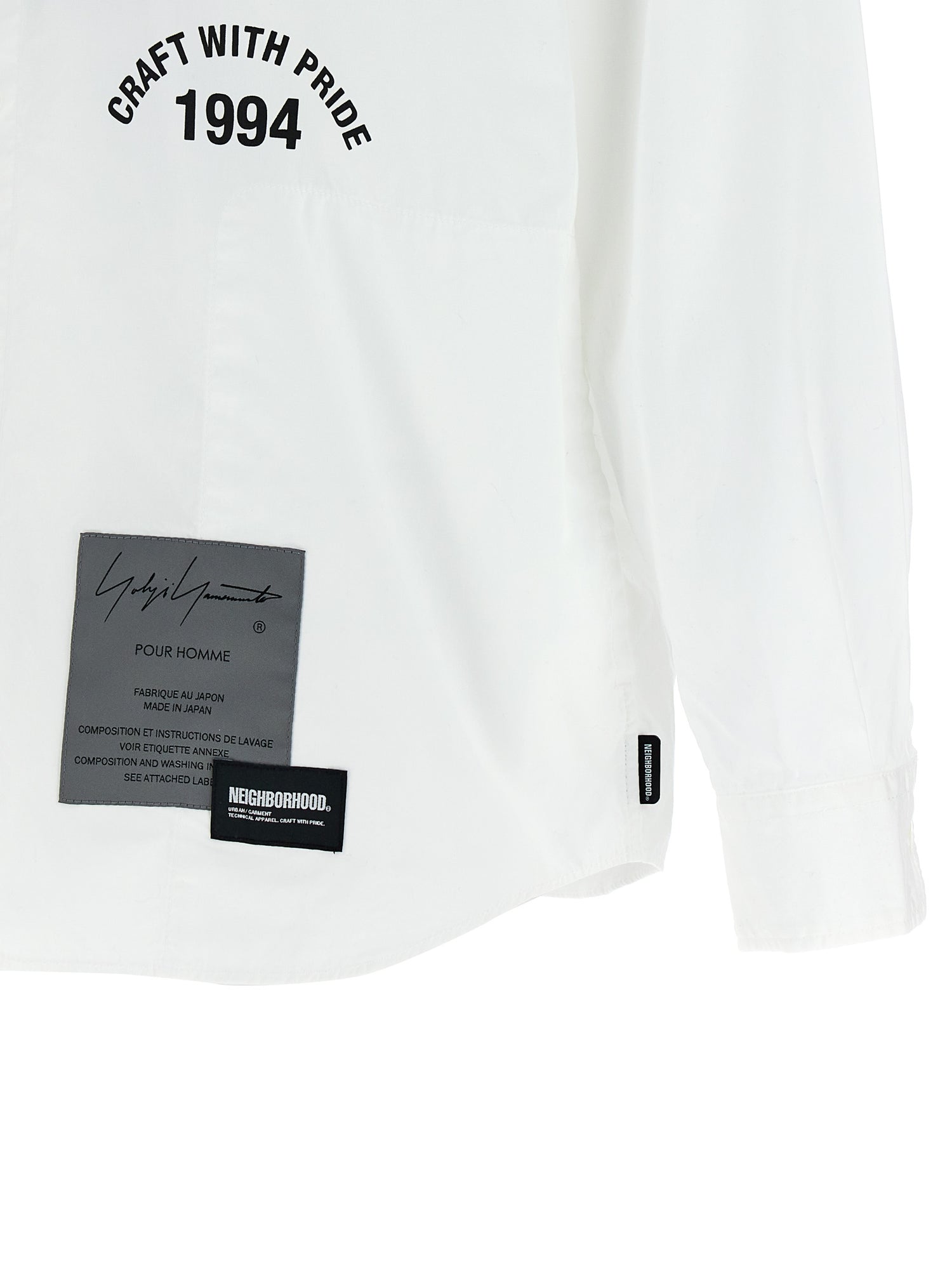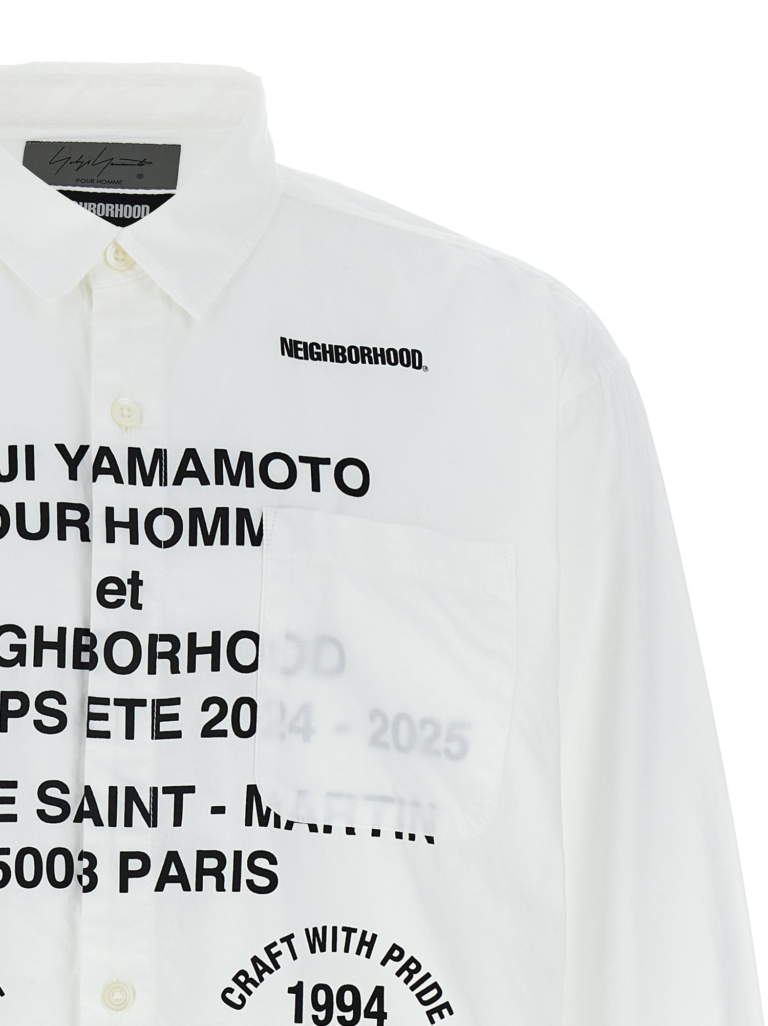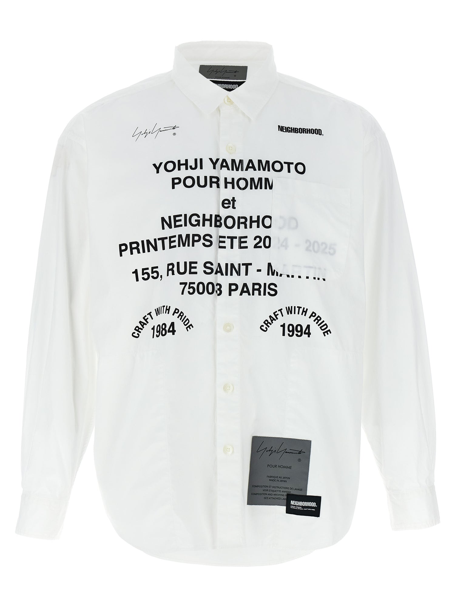 Yohji Yamamoto x Koszulka sąsiedzka w bawełnianym płótnie o wysokiej gęstości, wydruku i przednich logo, zamknięciu guzików, kieszenie, długie rękawy mankietowe.