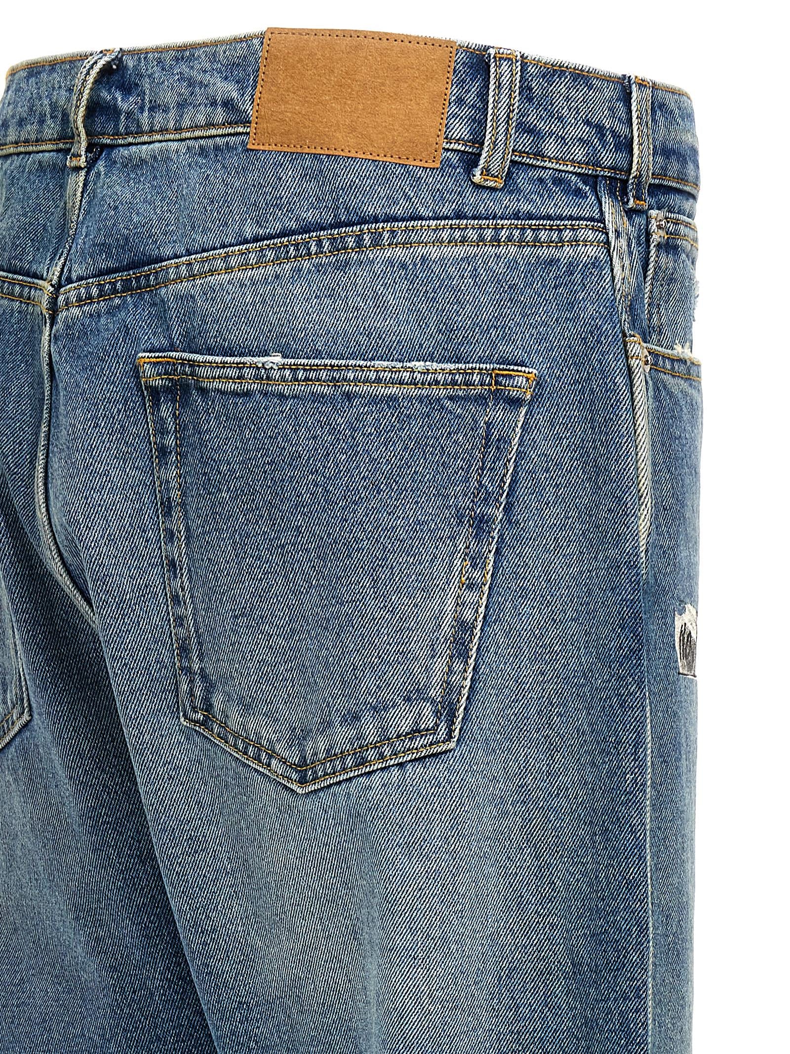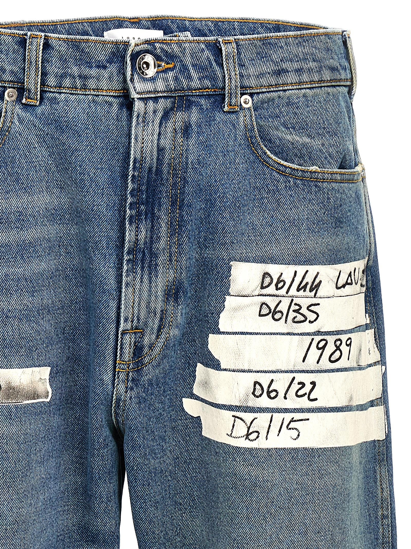 'Straight' straight leg denim jeans with front tape prints, zip and button closure.