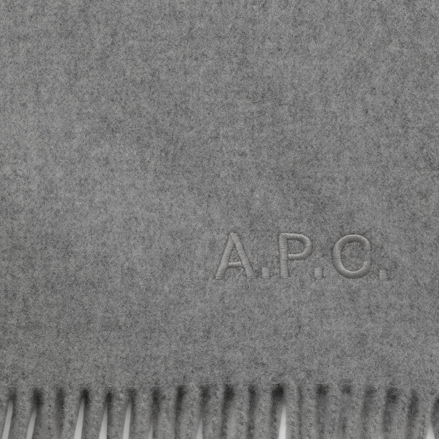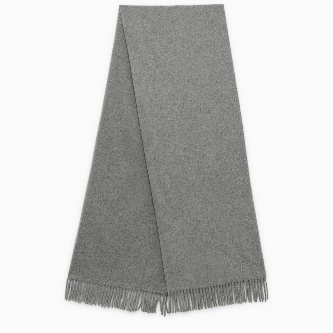 Grey virgin wool scarf by A.P.C., featuring decorative fringes at the ends and tone-on-tone embroidered logo.