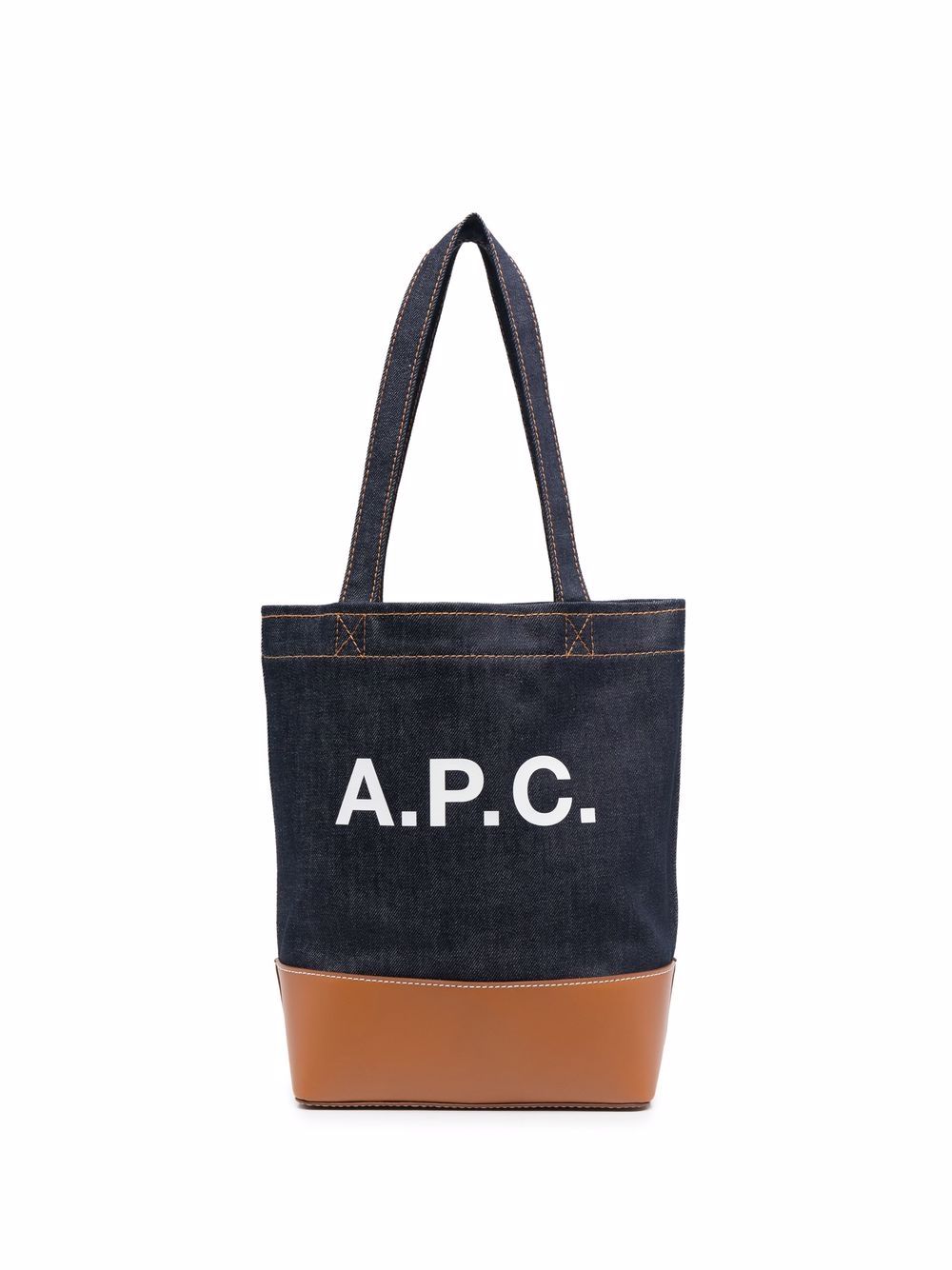logo-printed tote from A.P.C. featuring blue, brown, leather, logo print to the front, internal zip pocket, denim and two shoulder straps.