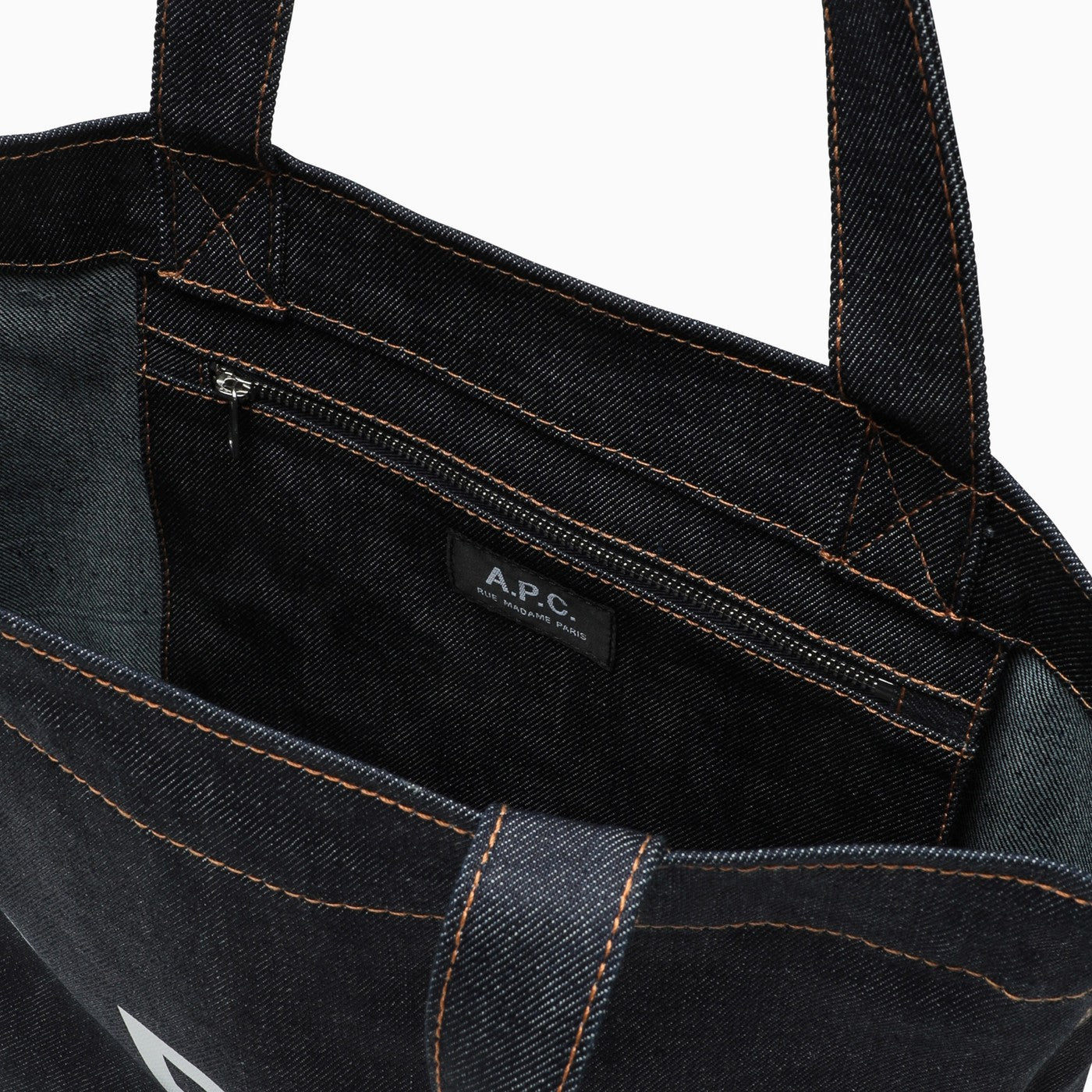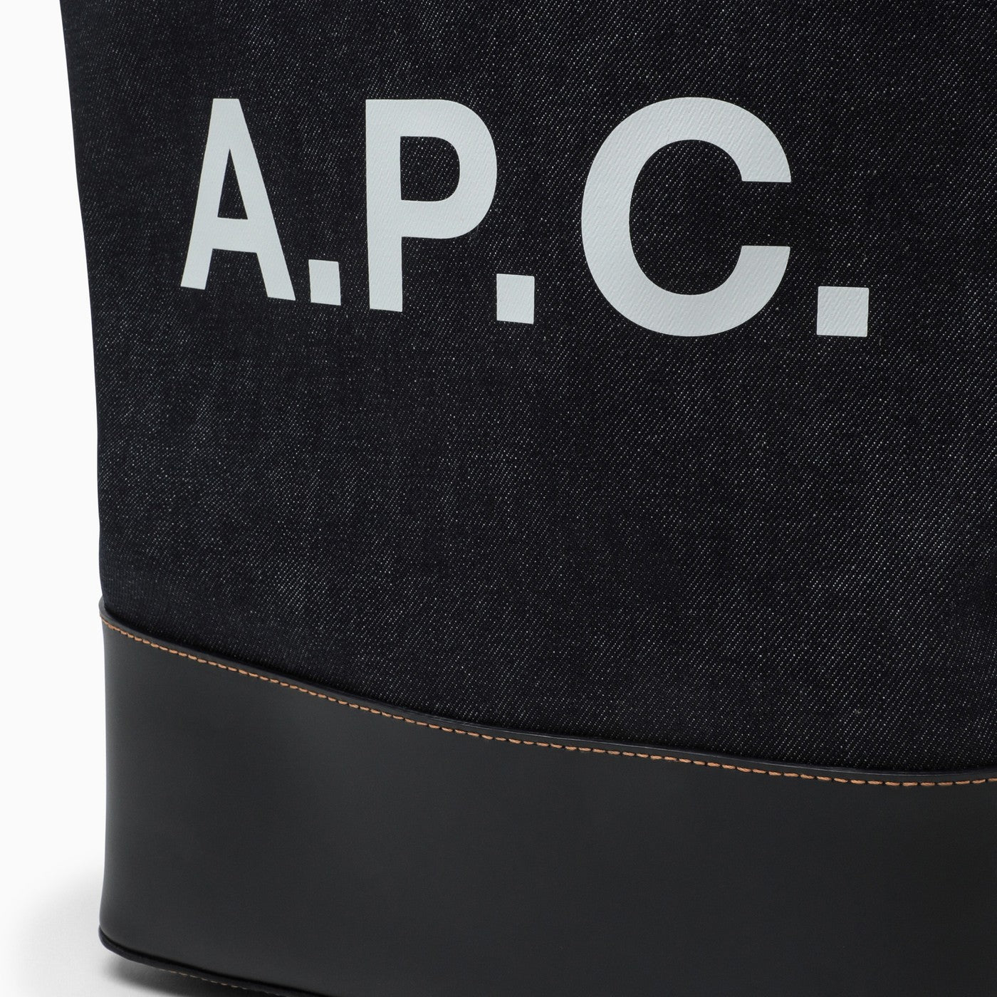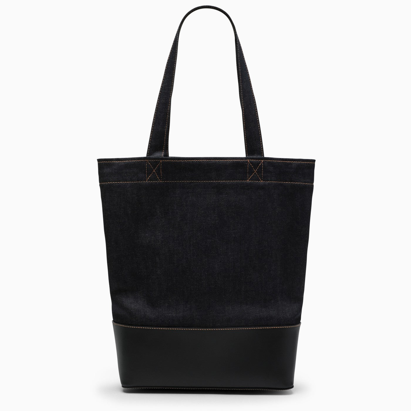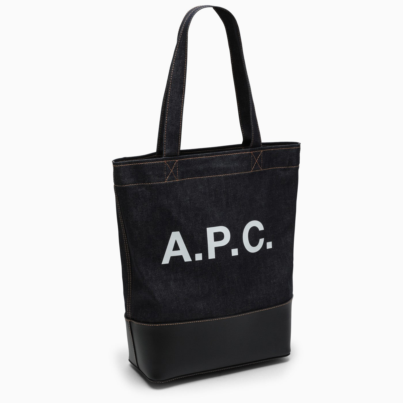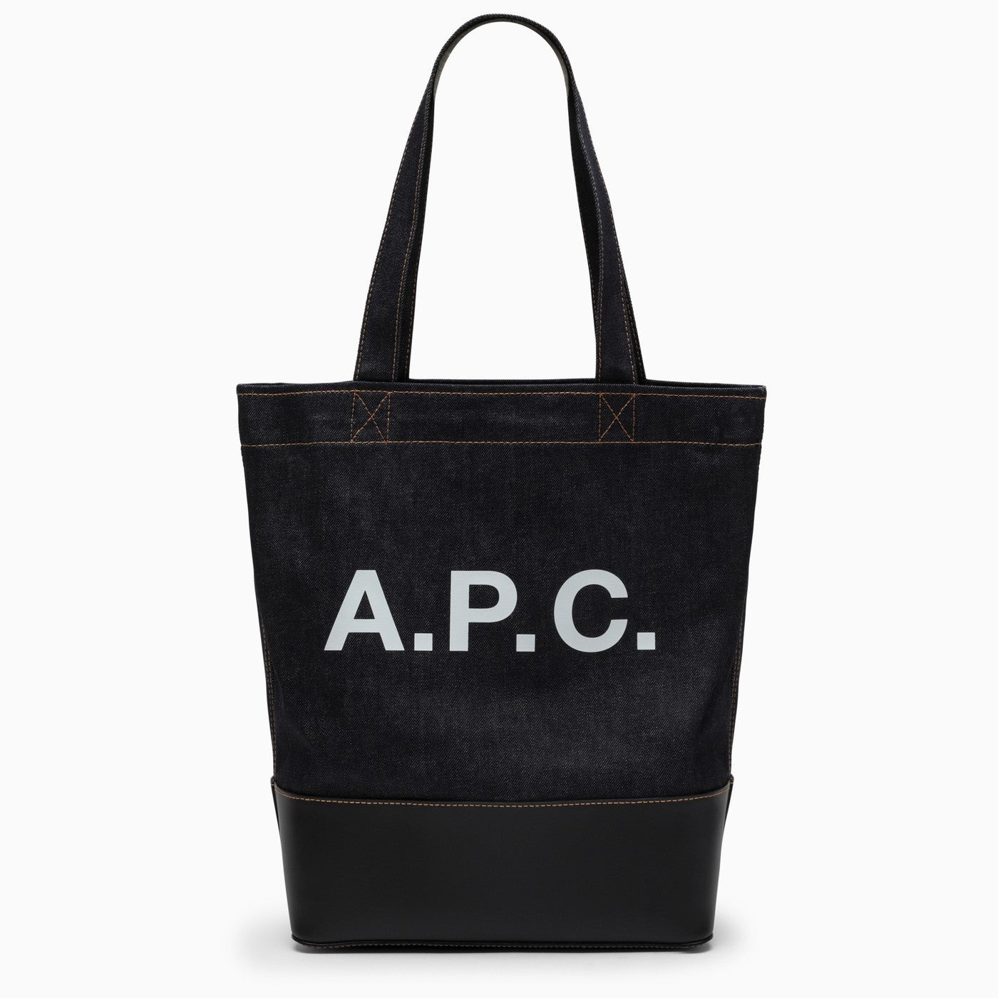 A.P.C. tote bag in blue cotton denim with a contrasting logo, black leather detail and two top handles.