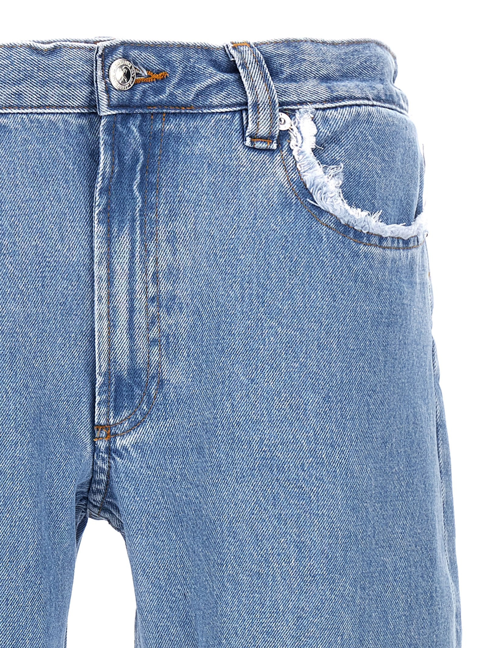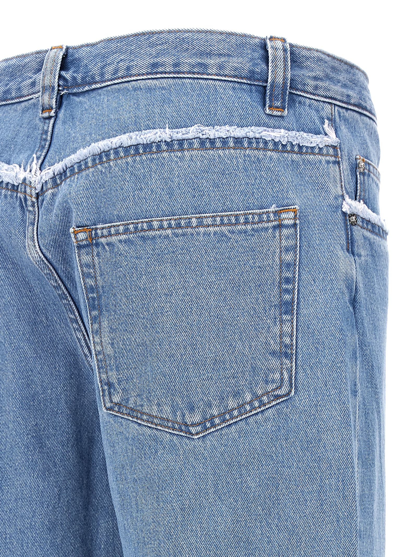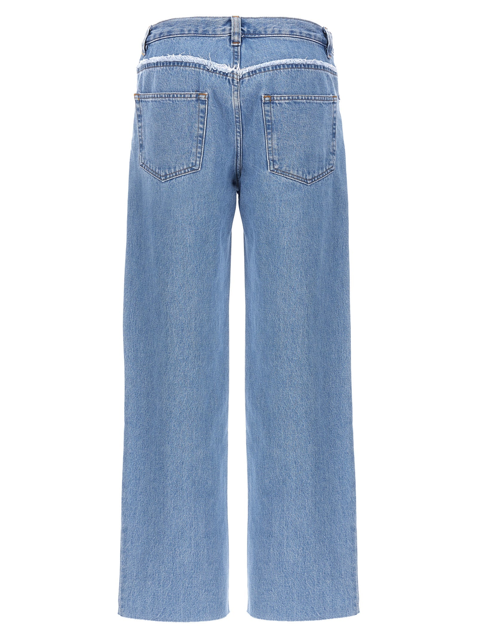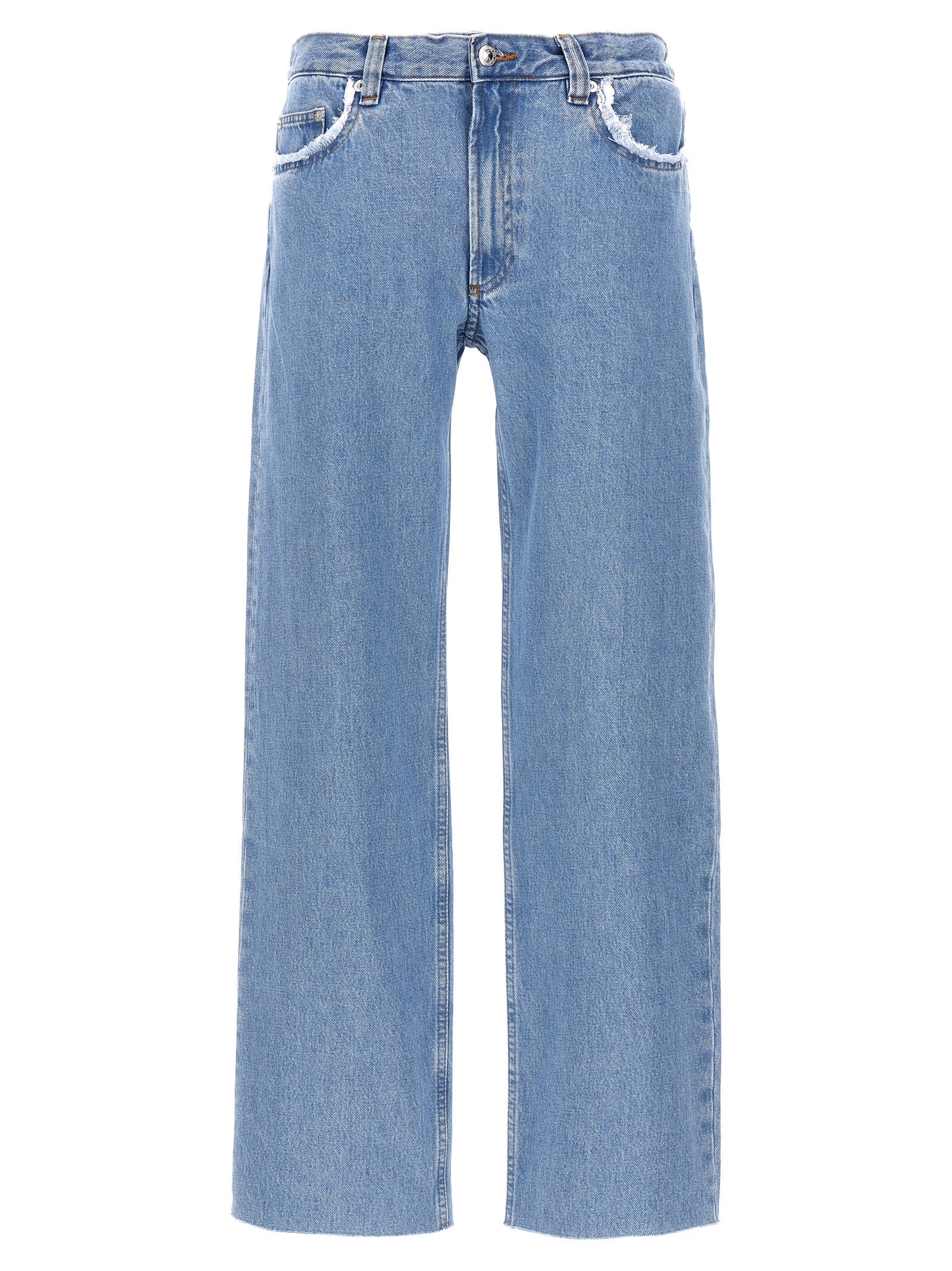 'Relaxed raw edge' cotton denim jeans with wide and straight leg with raw cut hem, mid waist with frayed details, zip and button closure.