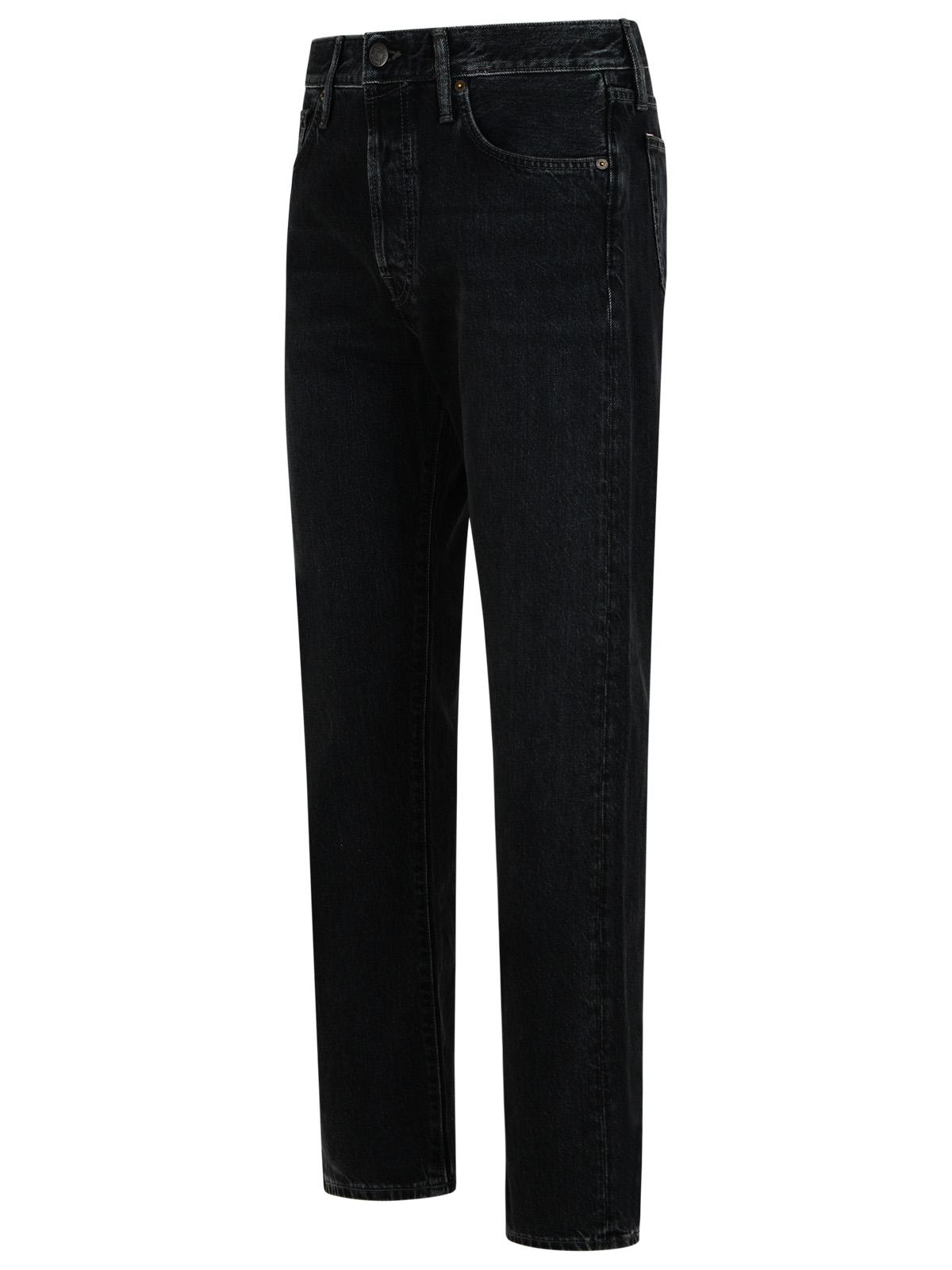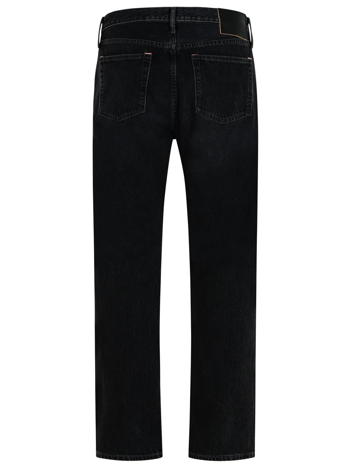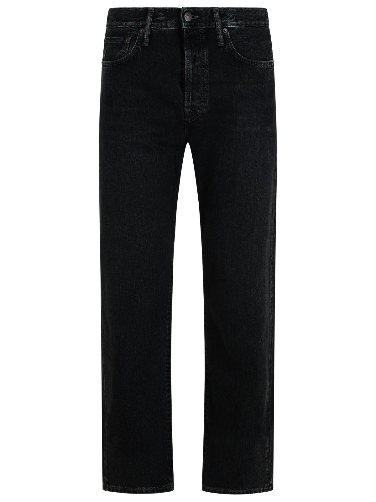 Belt loops, logo button closure and concealed flap zip, five pockets, soft cut