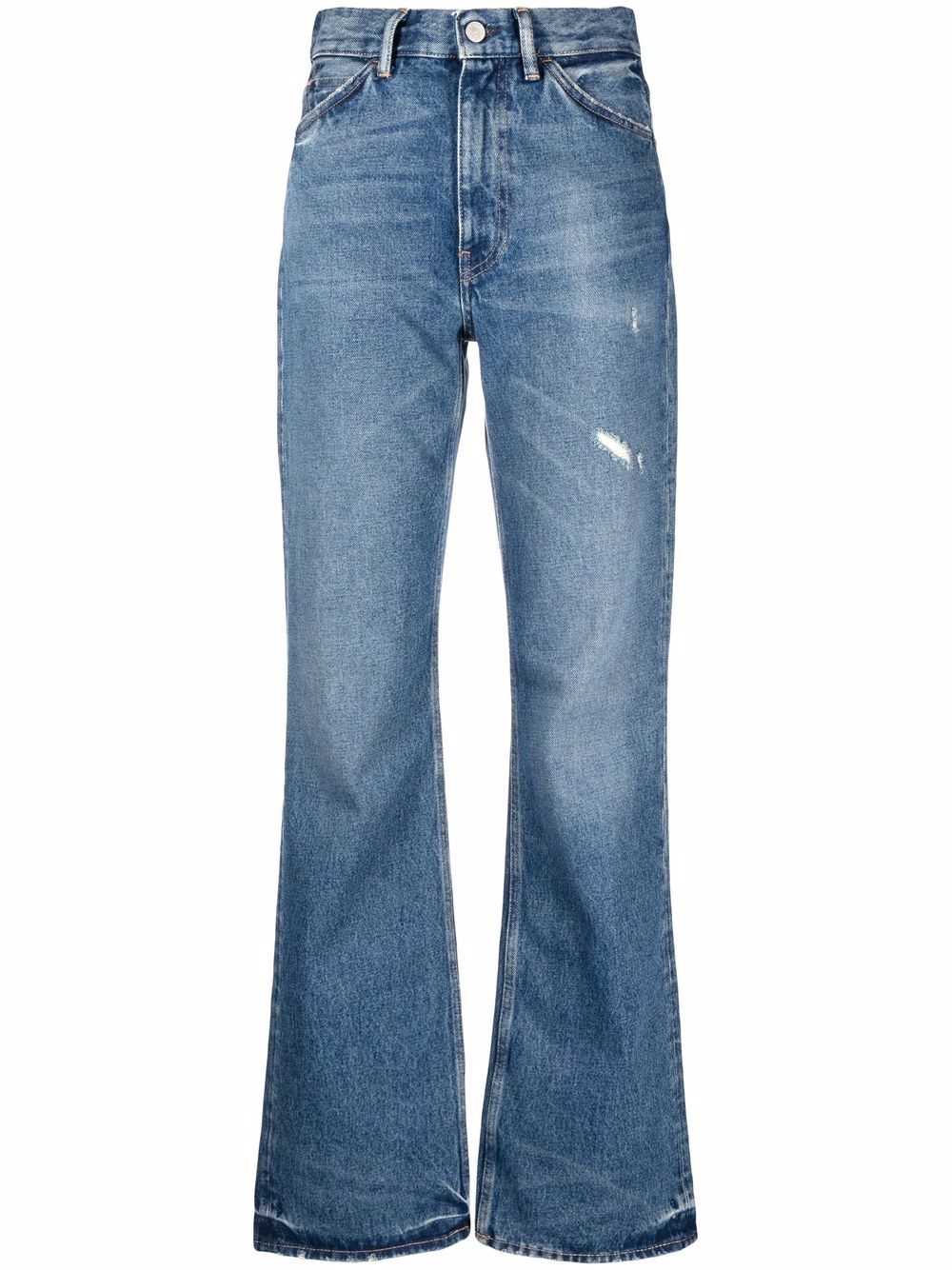 Faded blue organic cotton 1977 regular-fit jeans from ACNE STUDIOS featuring distressed effect, faded effect, bootcut, mid-rise, classic five pockets and front button fastening. POSITIVELY CONSCIOUS: This Planet Conscious product is made from at least 50% organic materials, which helps you support organic farming practices such as the restricted use of synthetic chemicals and genetically modified seeds, improved soil fertility and better livestock management..