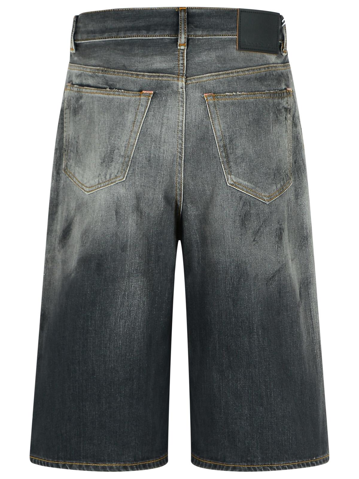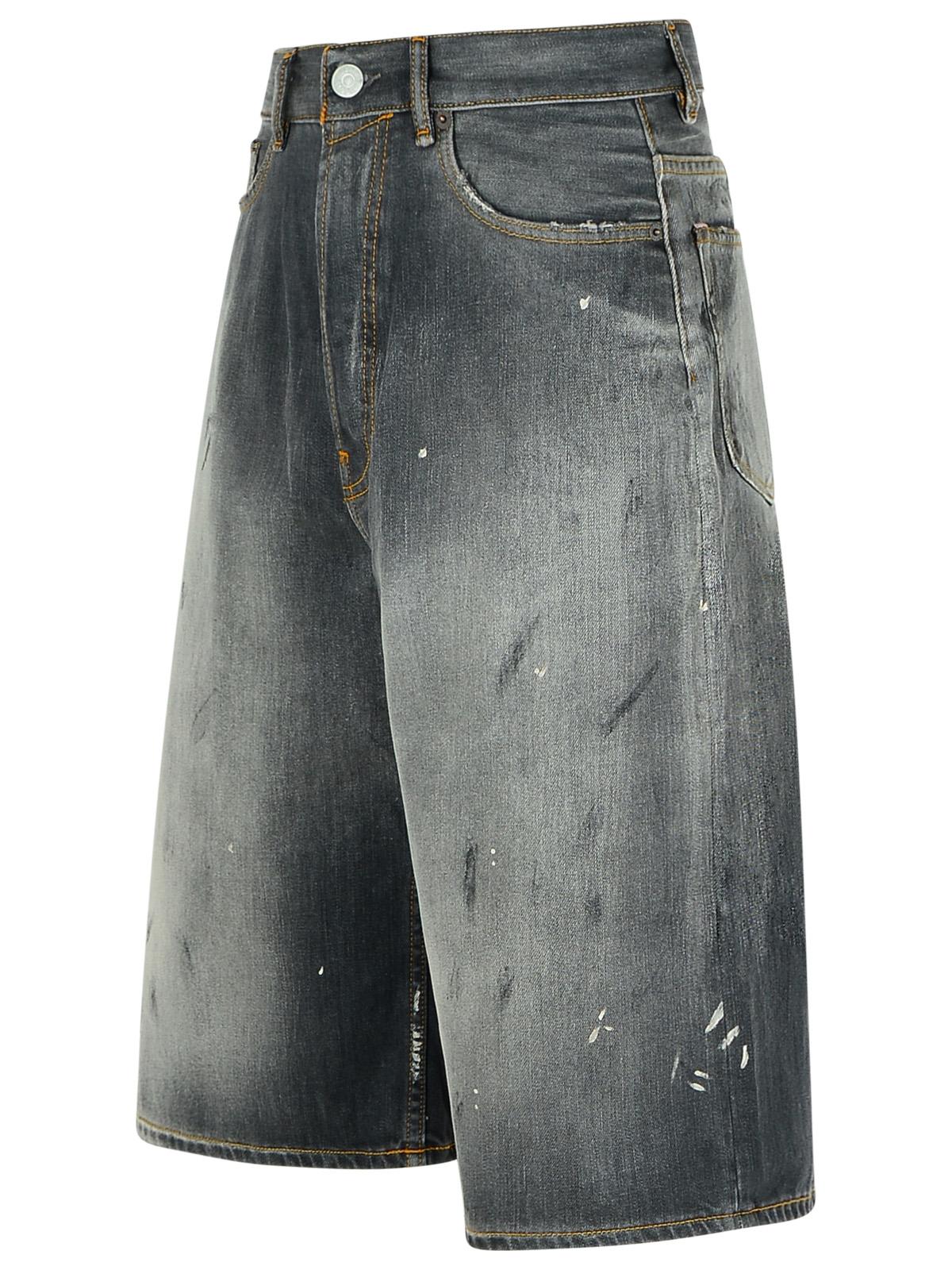 Belt loops, button and zipper closure concealed by flap, contrast double needle stitching, five-pocket style, painted effect, leather logo label