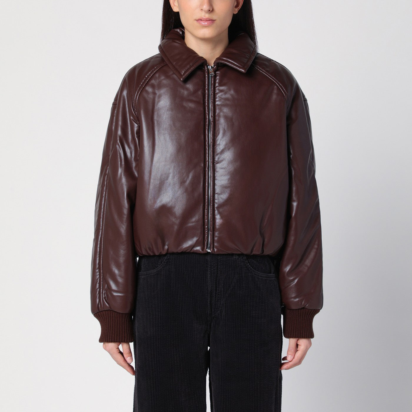 Brown faux leather cropped bomber jacket from Agolde featuring long sleeves with ribbed knit cuffs, shirt collar, front zip fastening, elasticated hem and two side welt pockets.