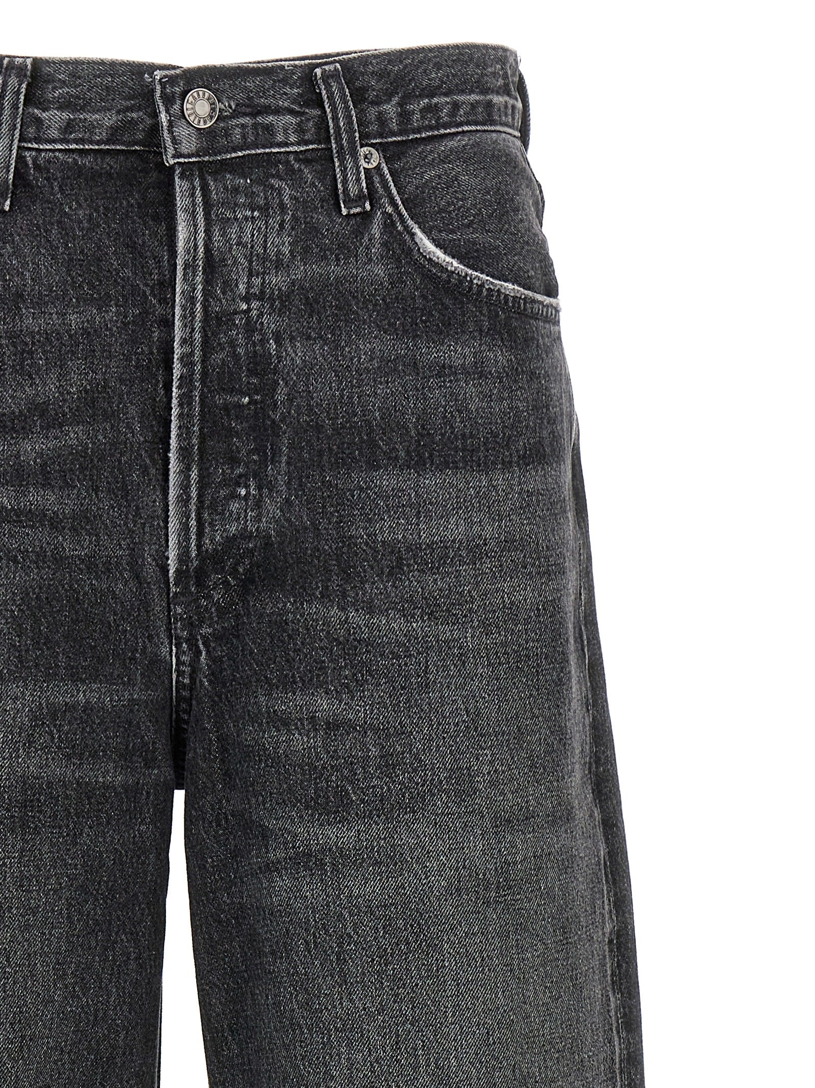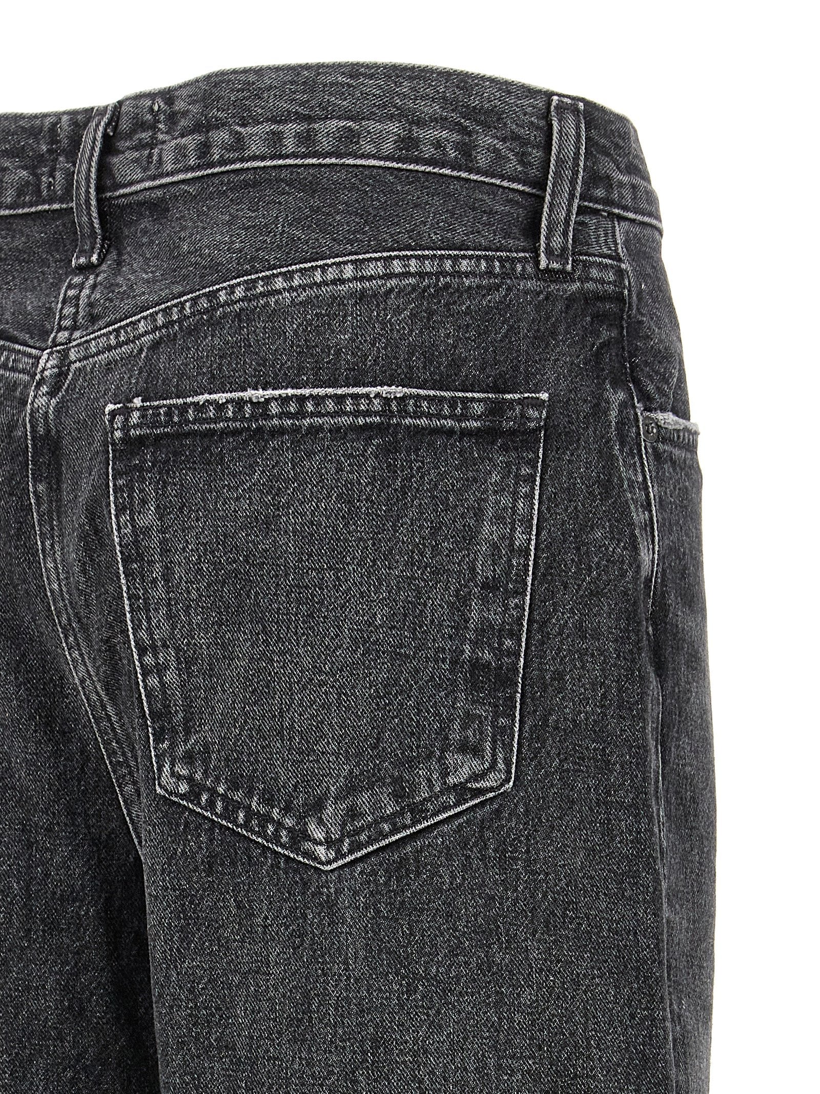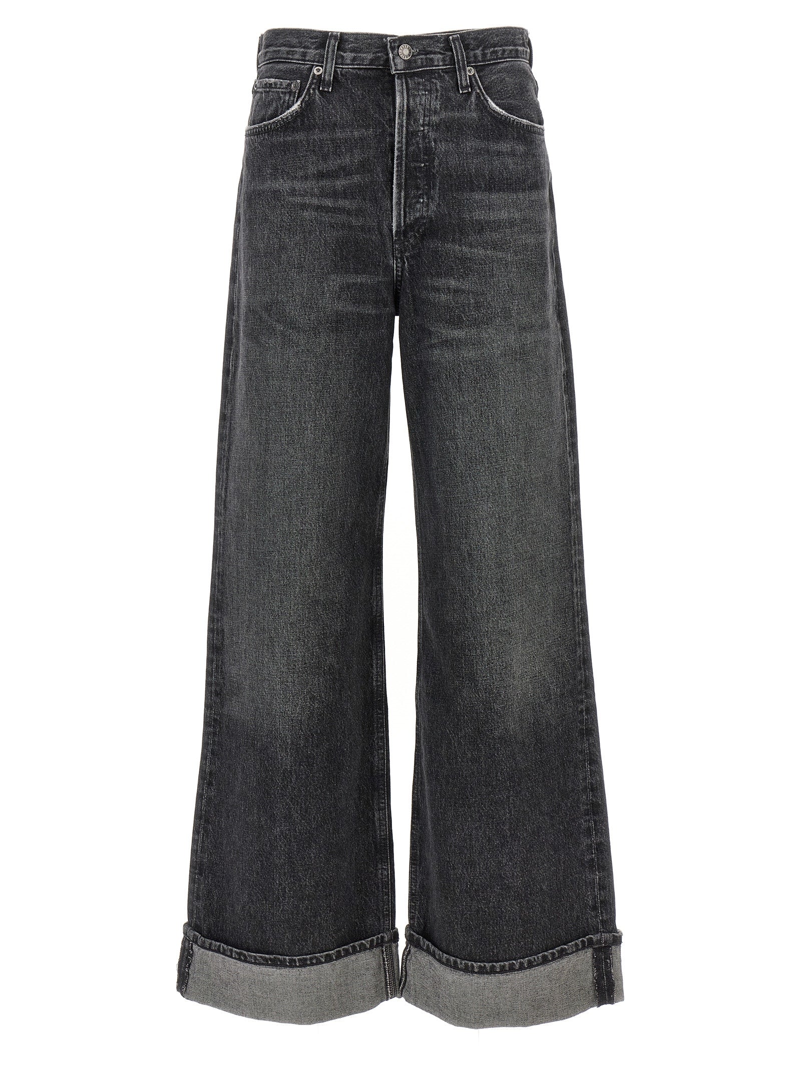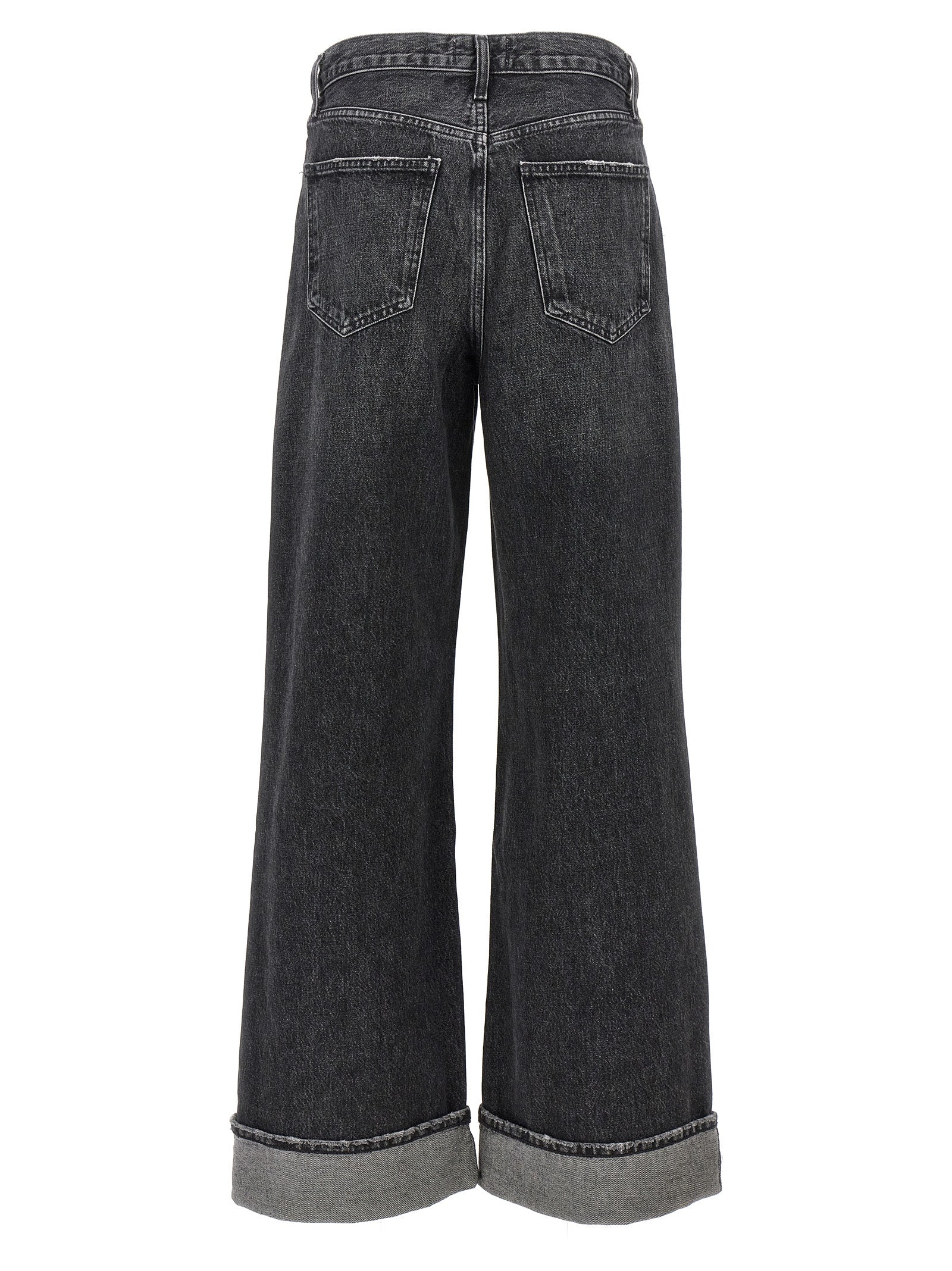 'Dame' cotton denim jeans with used-effect details, button closure, five pockets, high-waisted model with wide leg, turned-up hem.