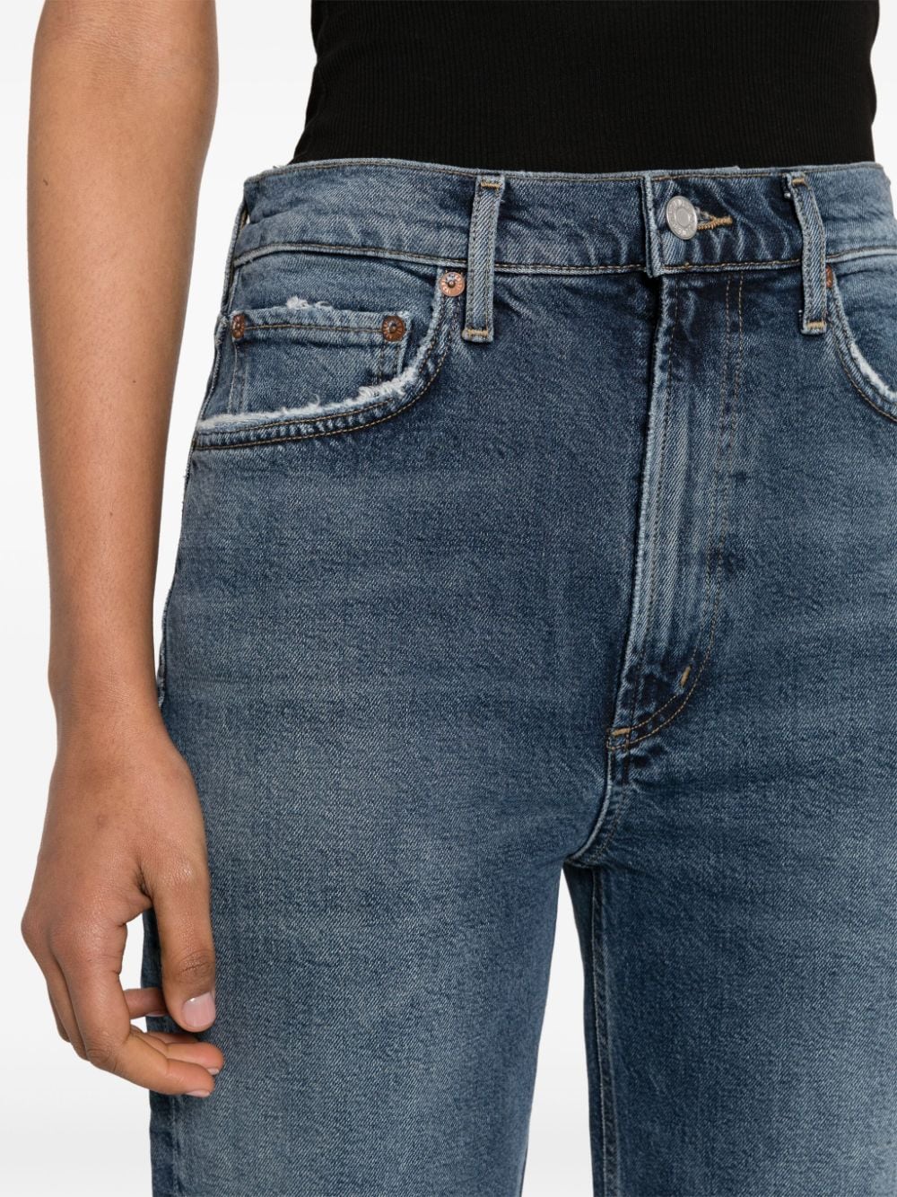 blue organic cotton blend denim stonewashed high-rise belt loops classic five pockets distressed effect internal logo tag stovepipe leg front button and zip fastening