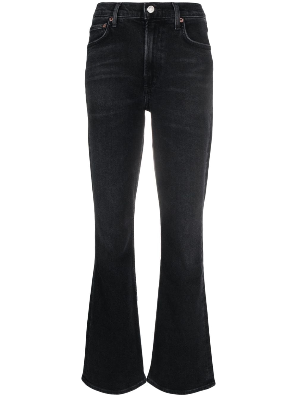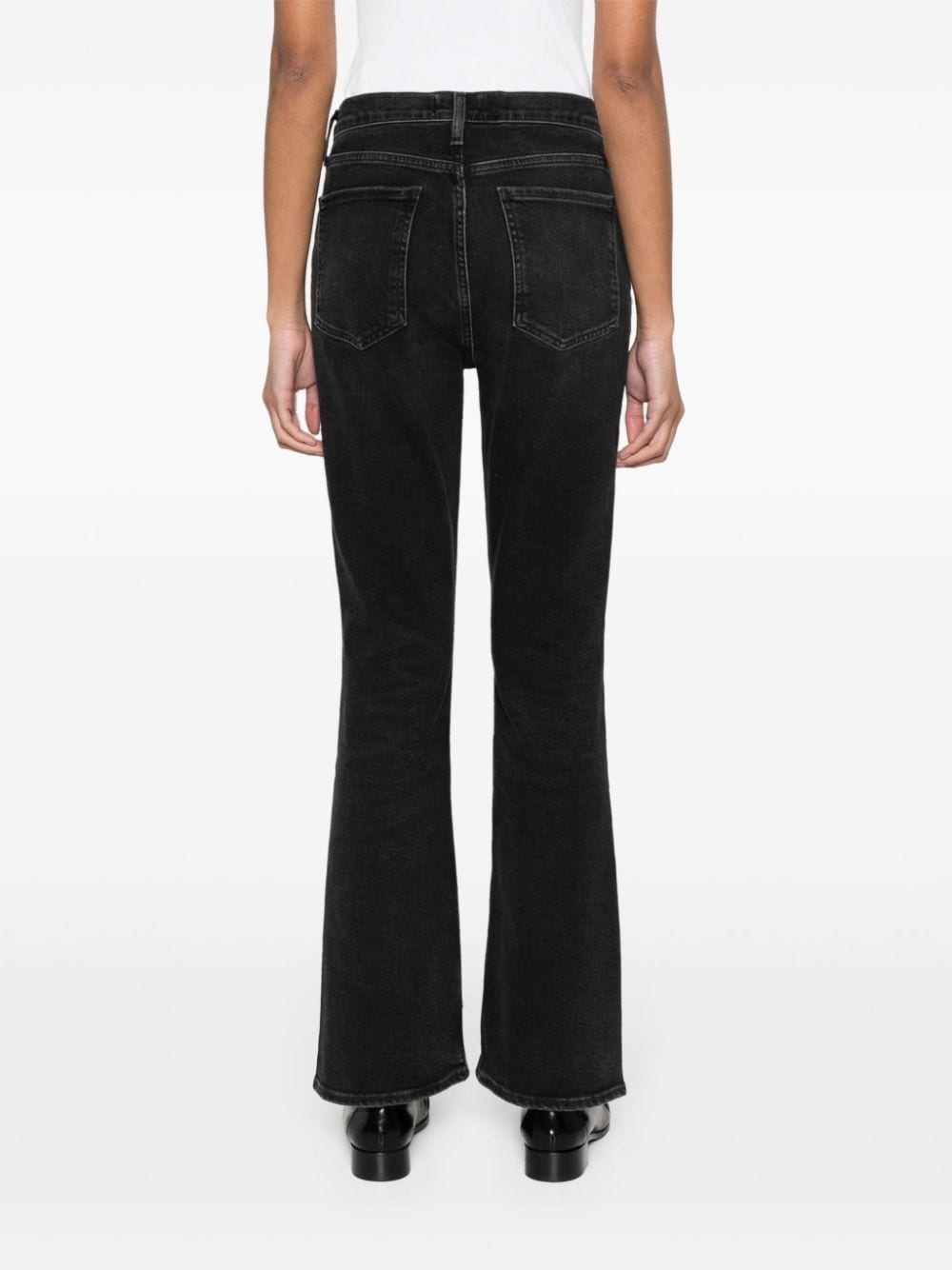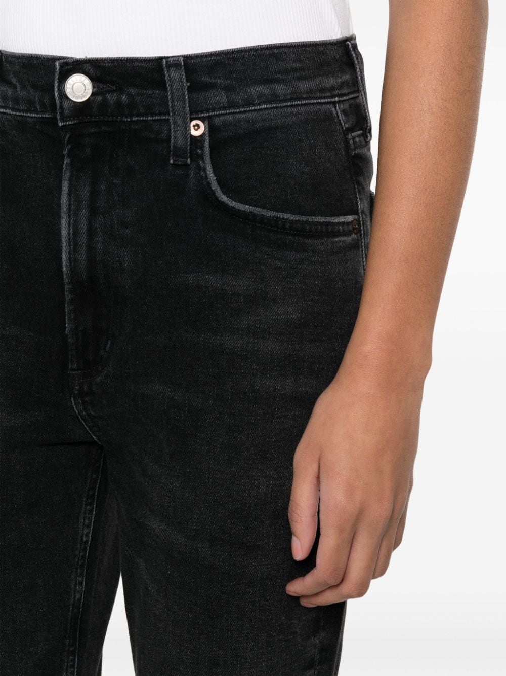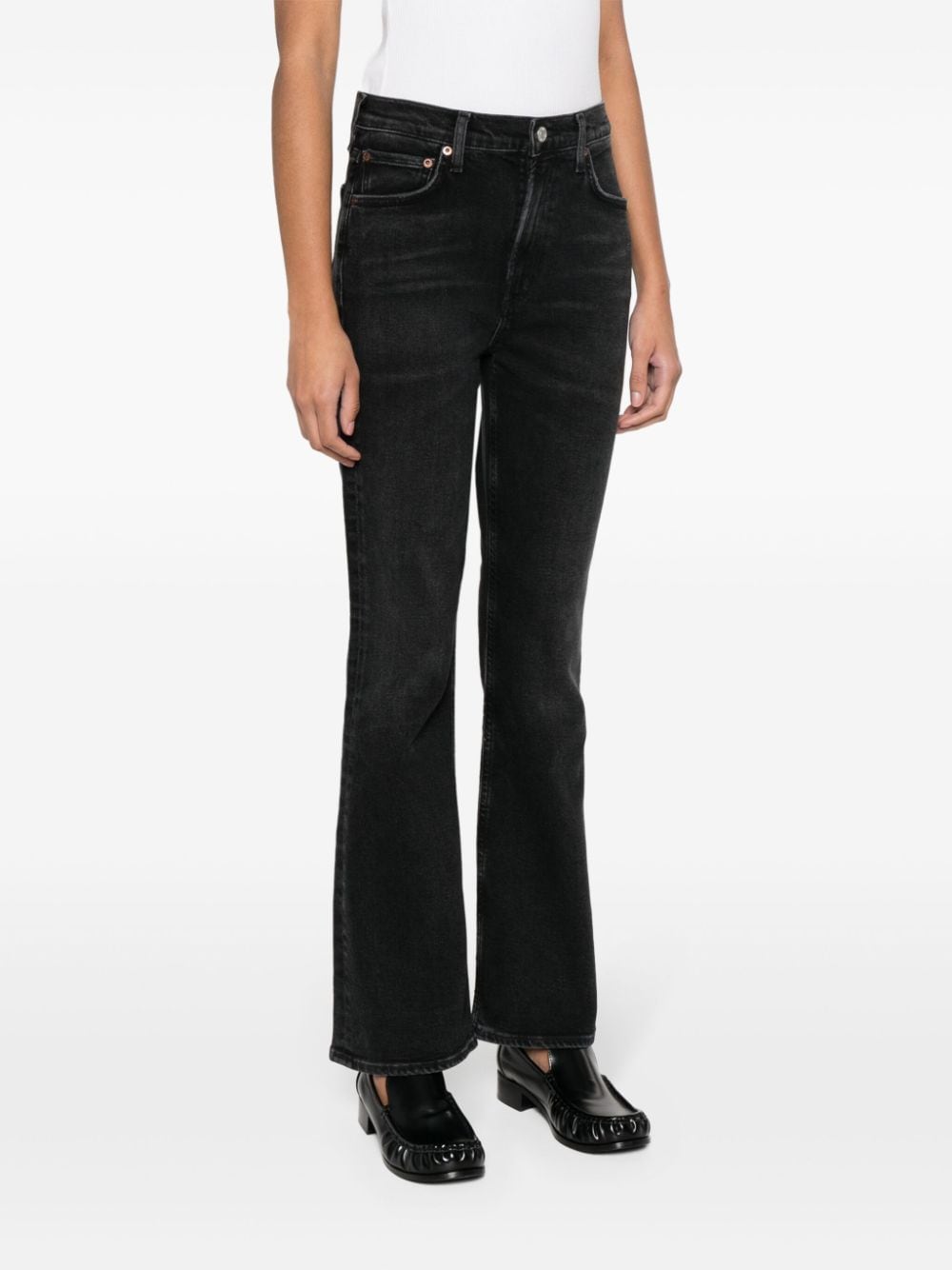 black organic cotton blend washed denim whiskering effect belt loops concealed fly and button fastening high-waisted bootcut classic five pockets straight hem This item is made from at least 50% organic materials. Learn more about what makes a product Conscious on our Conscious Criteria page