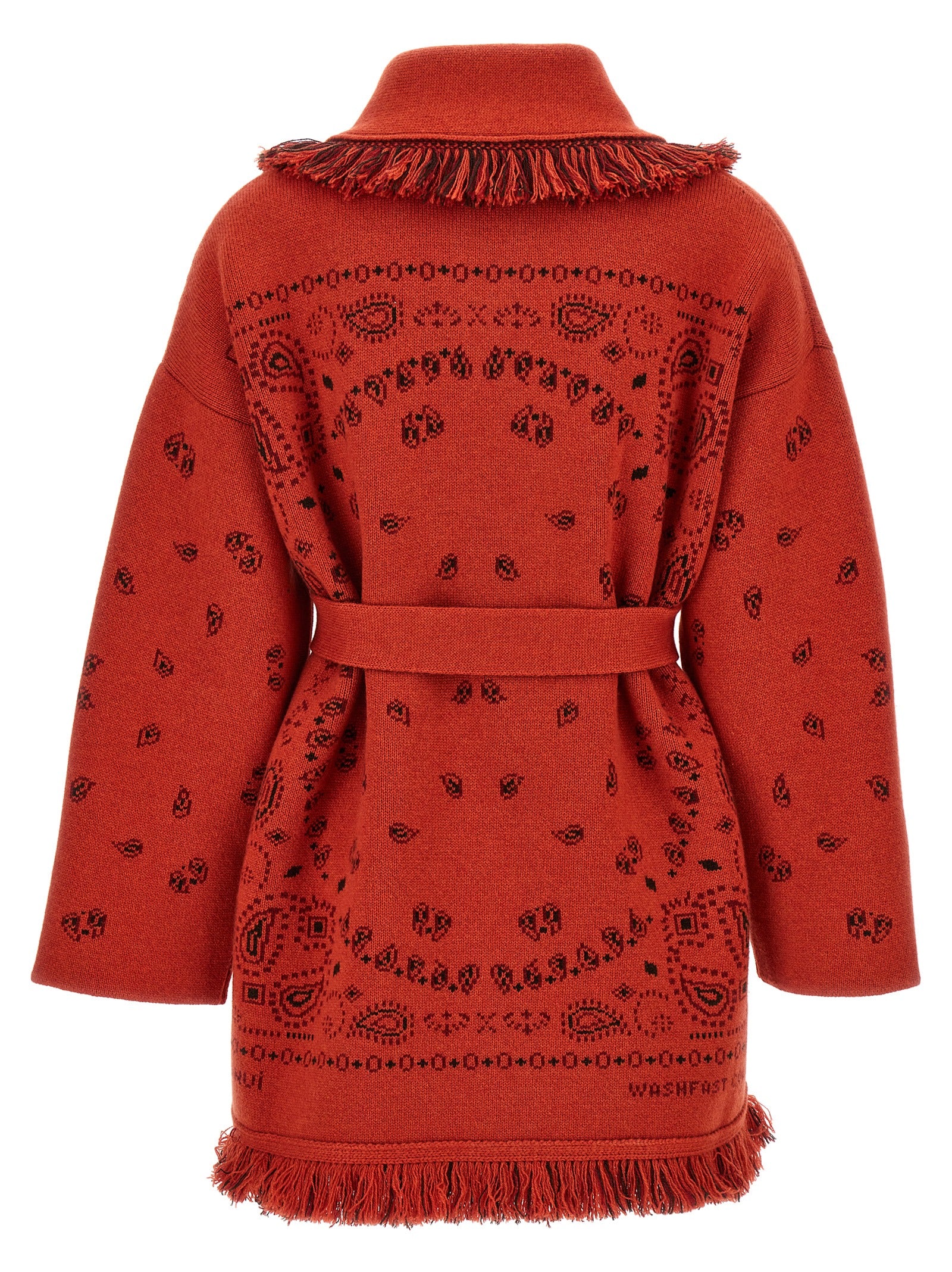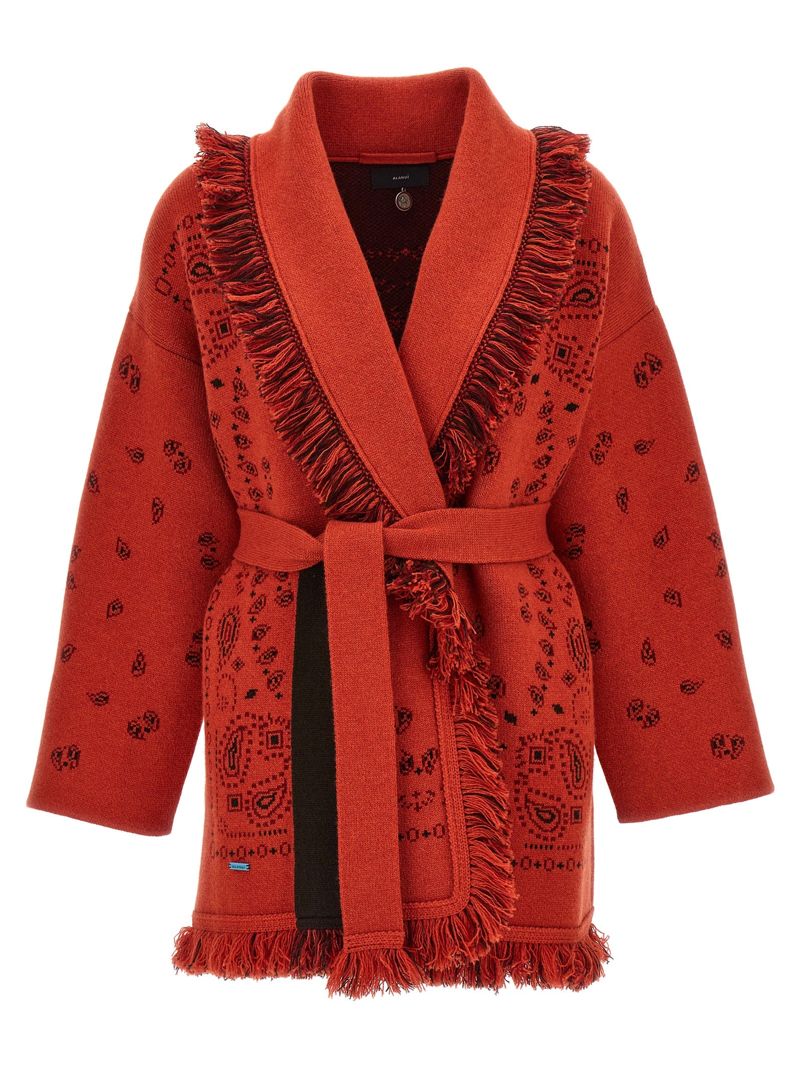 'Bandana' cashmere cardigan with all-over jacquard pattern, fringed trimming, belt at the waist, pockets, long sleeves.