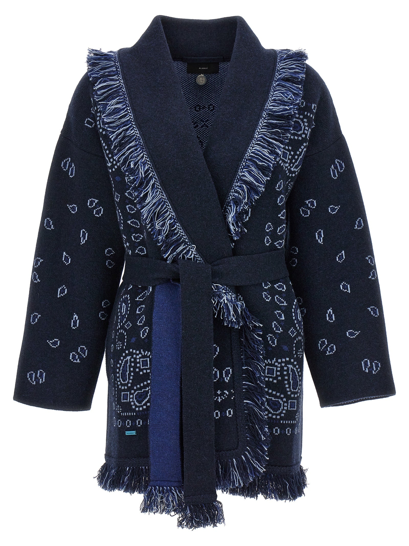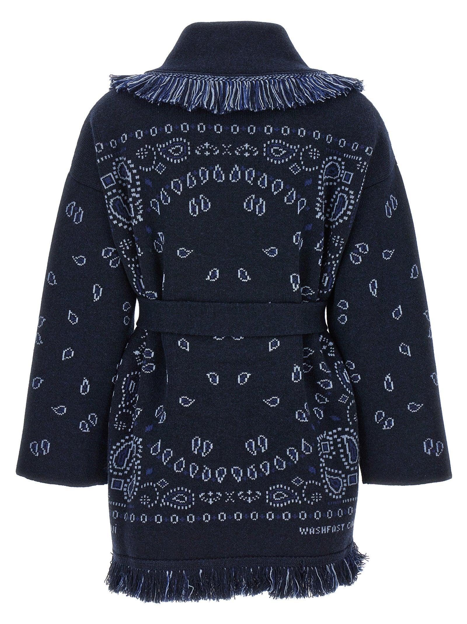 'Bandana' cashmere cardigan with all-over jacquard pattern, fringed trimming, belt at the waist, pockets, long sleeves.