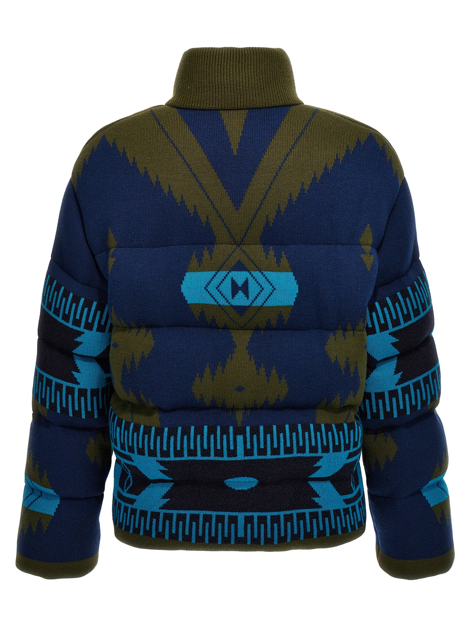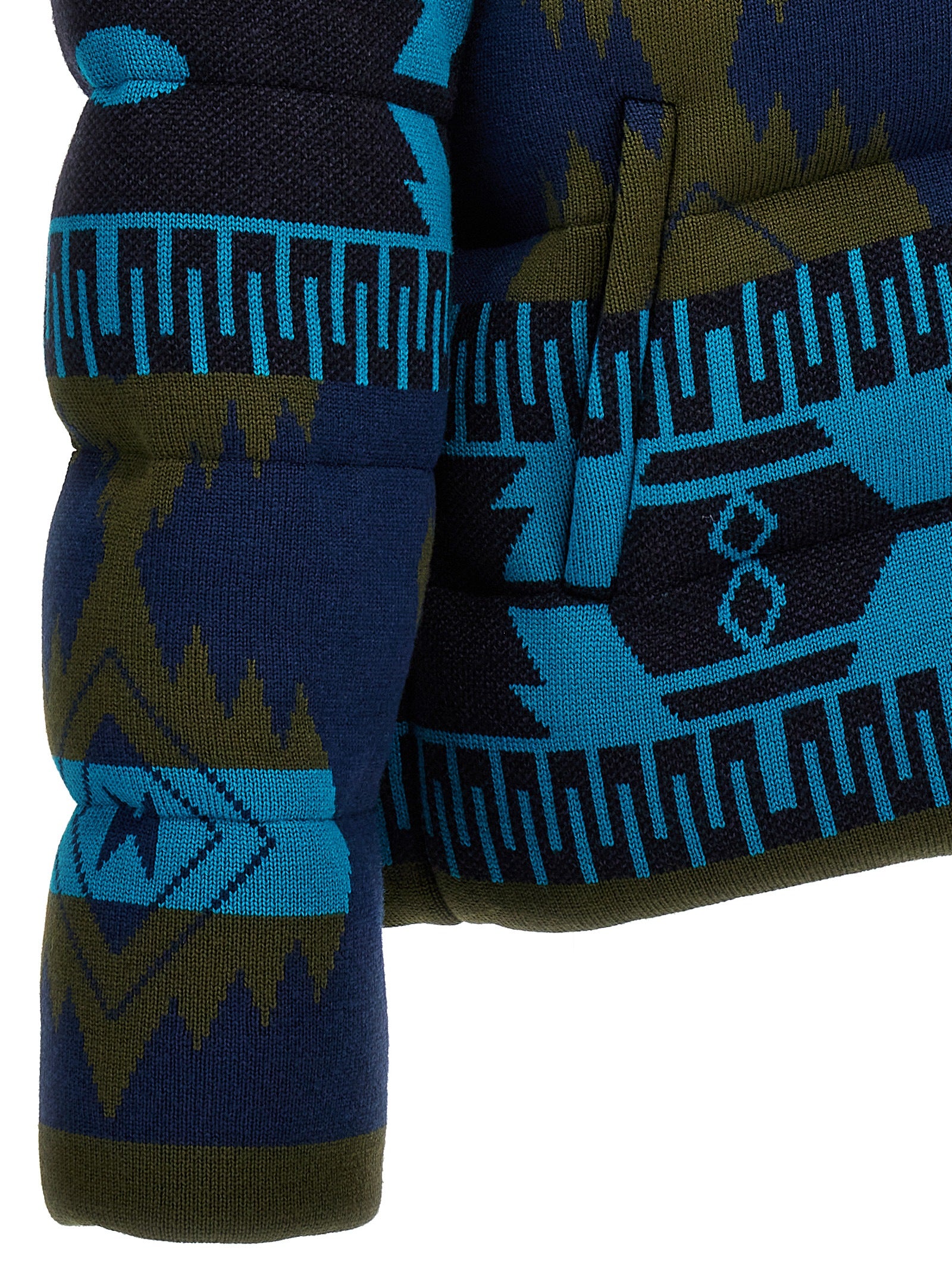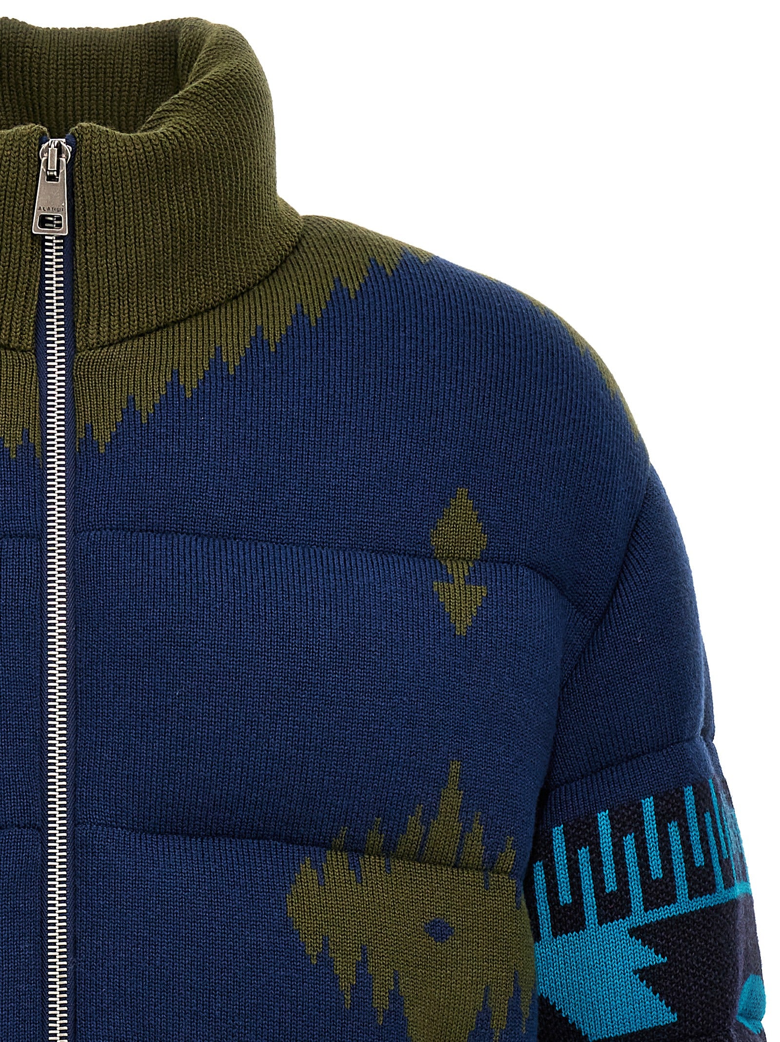 Padded wool down jacket, all-over 'Icon' print, zip closure, high collar, long cuffed sleeves, pockets.