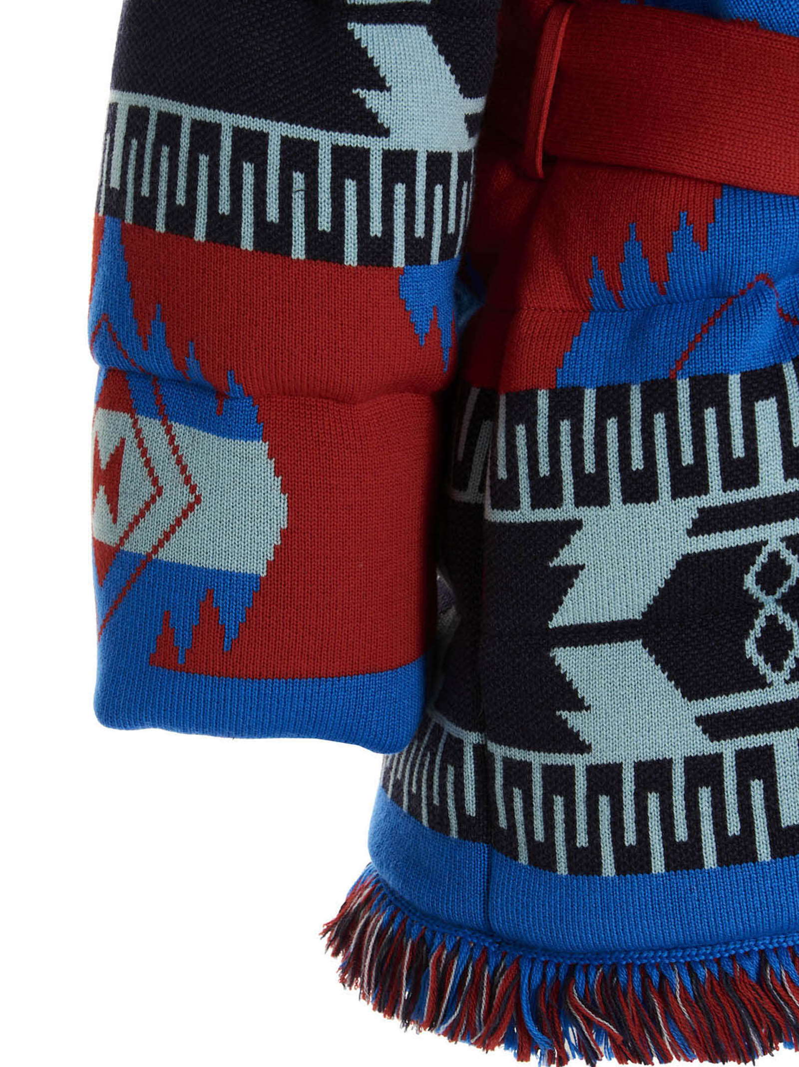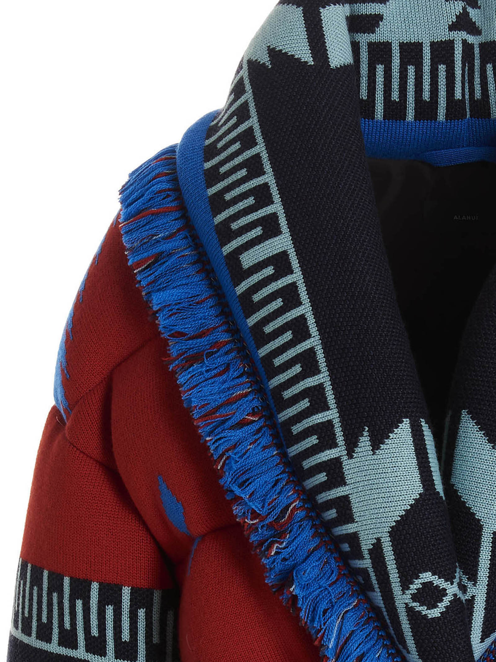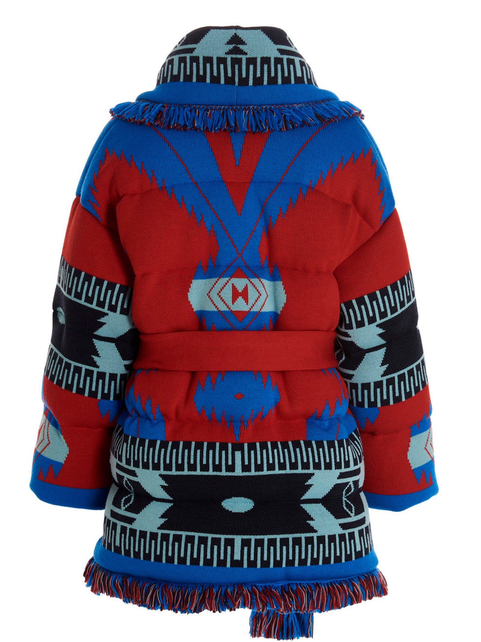 ‘Icon' long wool down jacket with an all-over print, down padding, button closure, belt at the waist, pockets, long sleeves, a V-neck and fringes on the edging.