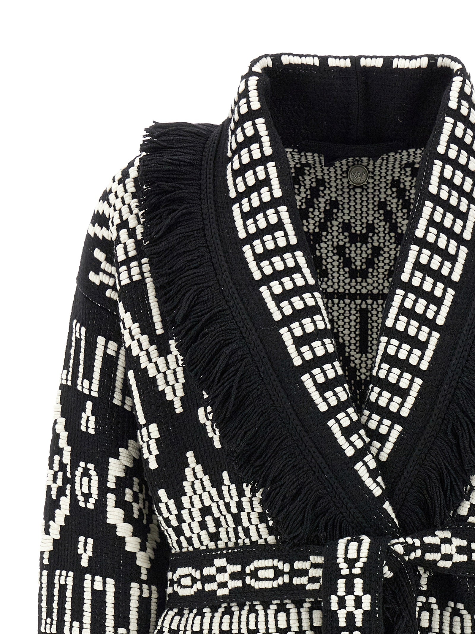 'Jungle beat' wool and cotton blend cardigan, V-neck, belt closure at the waist, pockets, fringes on the edges, long sleeves.