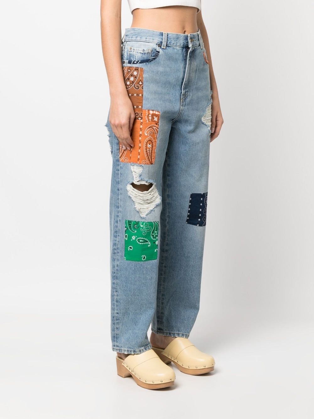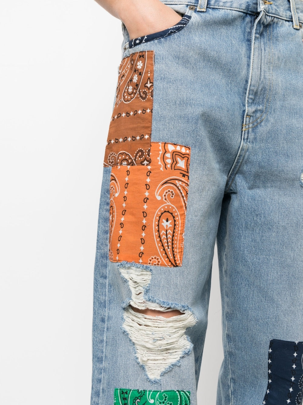 bandana-patchwork distressed jeans from ALANUI featuring light blue, multicolour, cotton, denim, distressed finish, bandana print, patchwork detailing, logo patch to the rear, high waist, belt loops, front button and zip fastening, classic five pockets and straight leg.