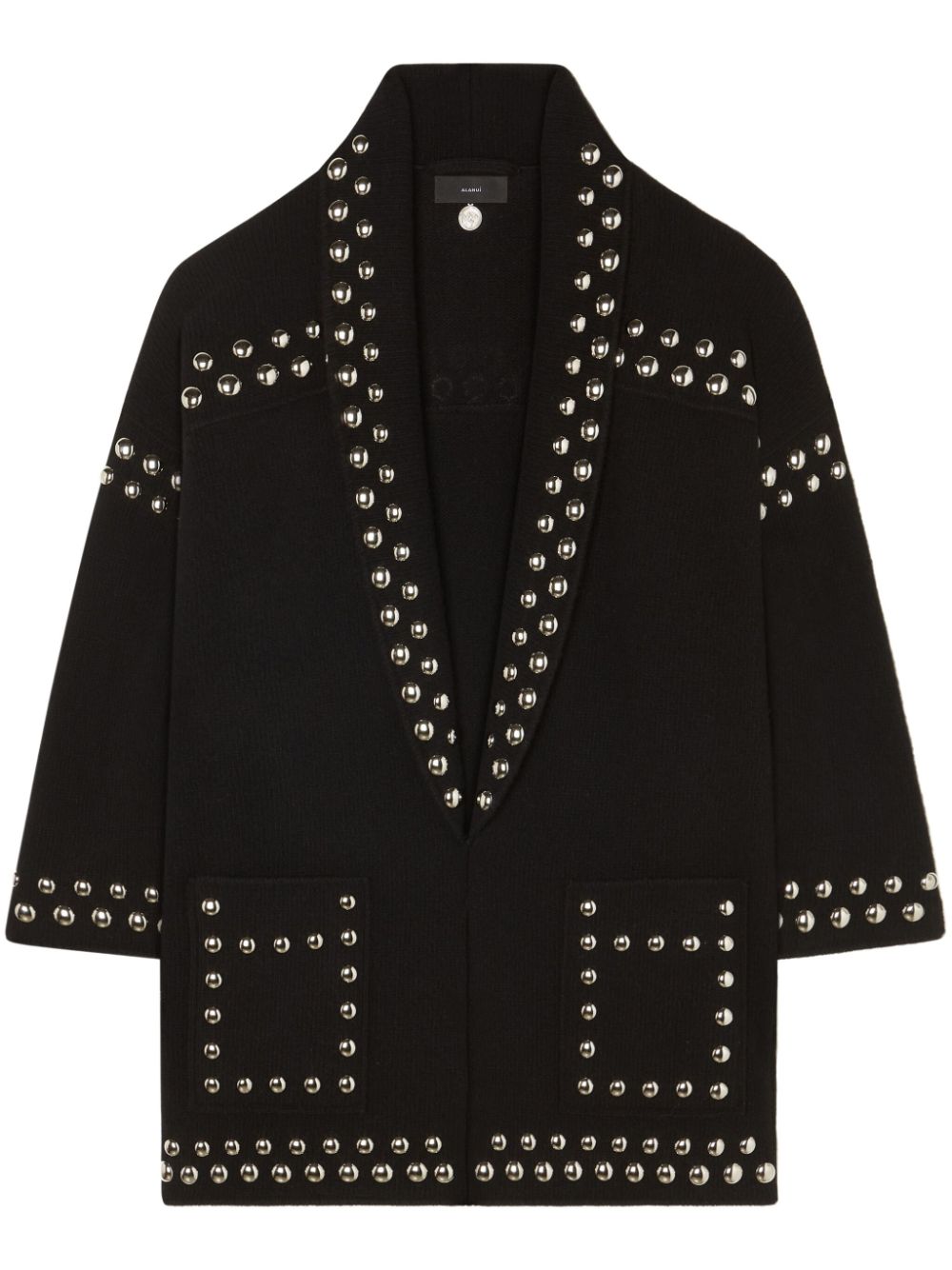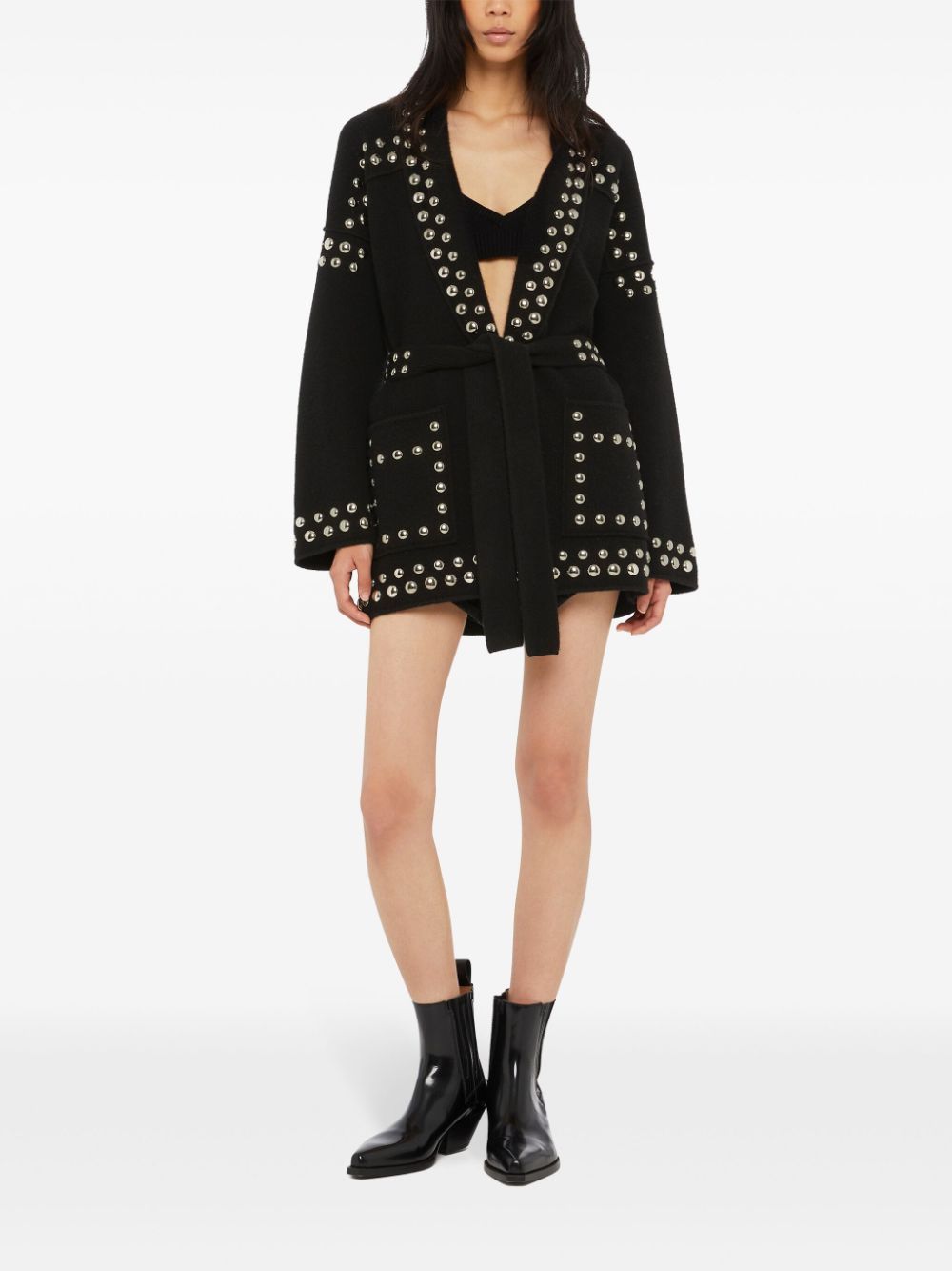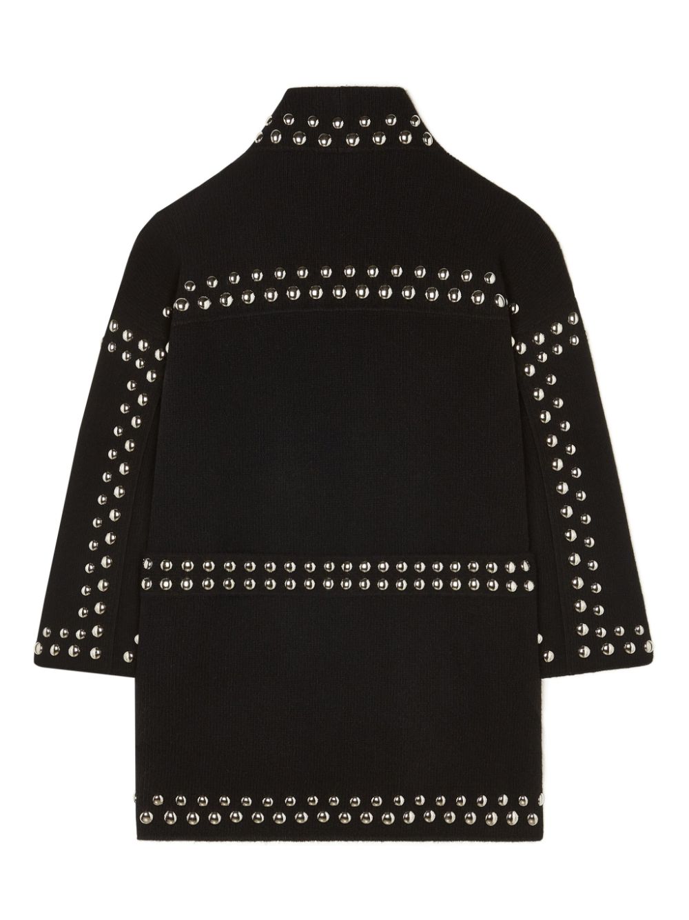 black virgin wool knitted construction stud embellishment shawl lapels plunging V-neck detachable and adjustable waist belt drop shoulder long sleeves straight hem
