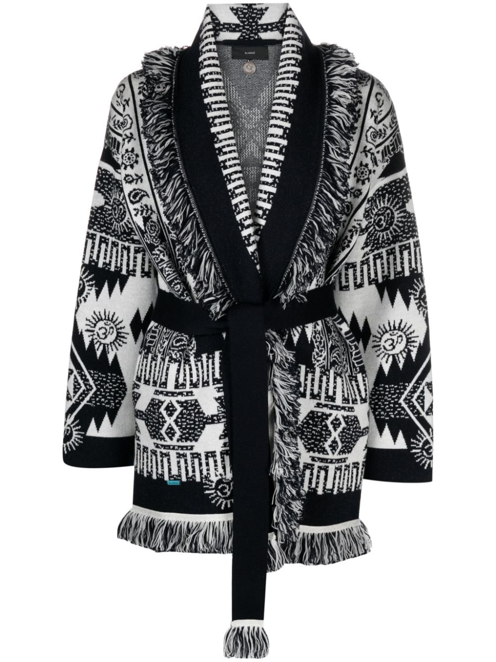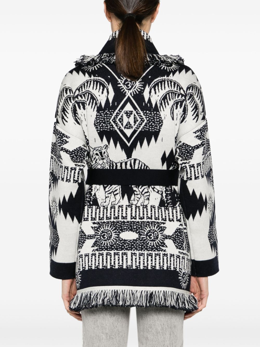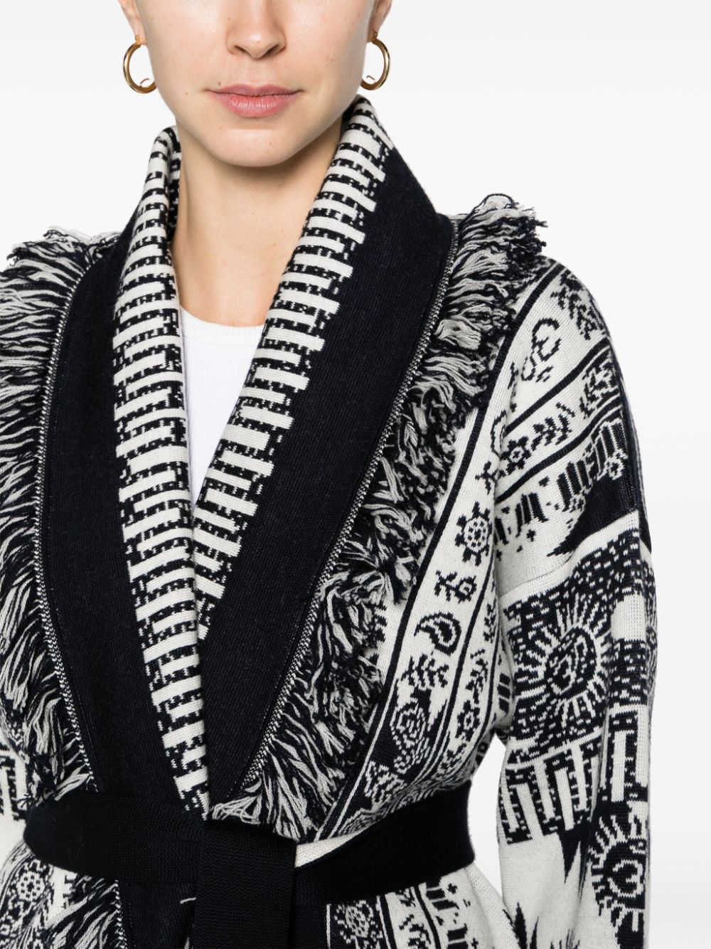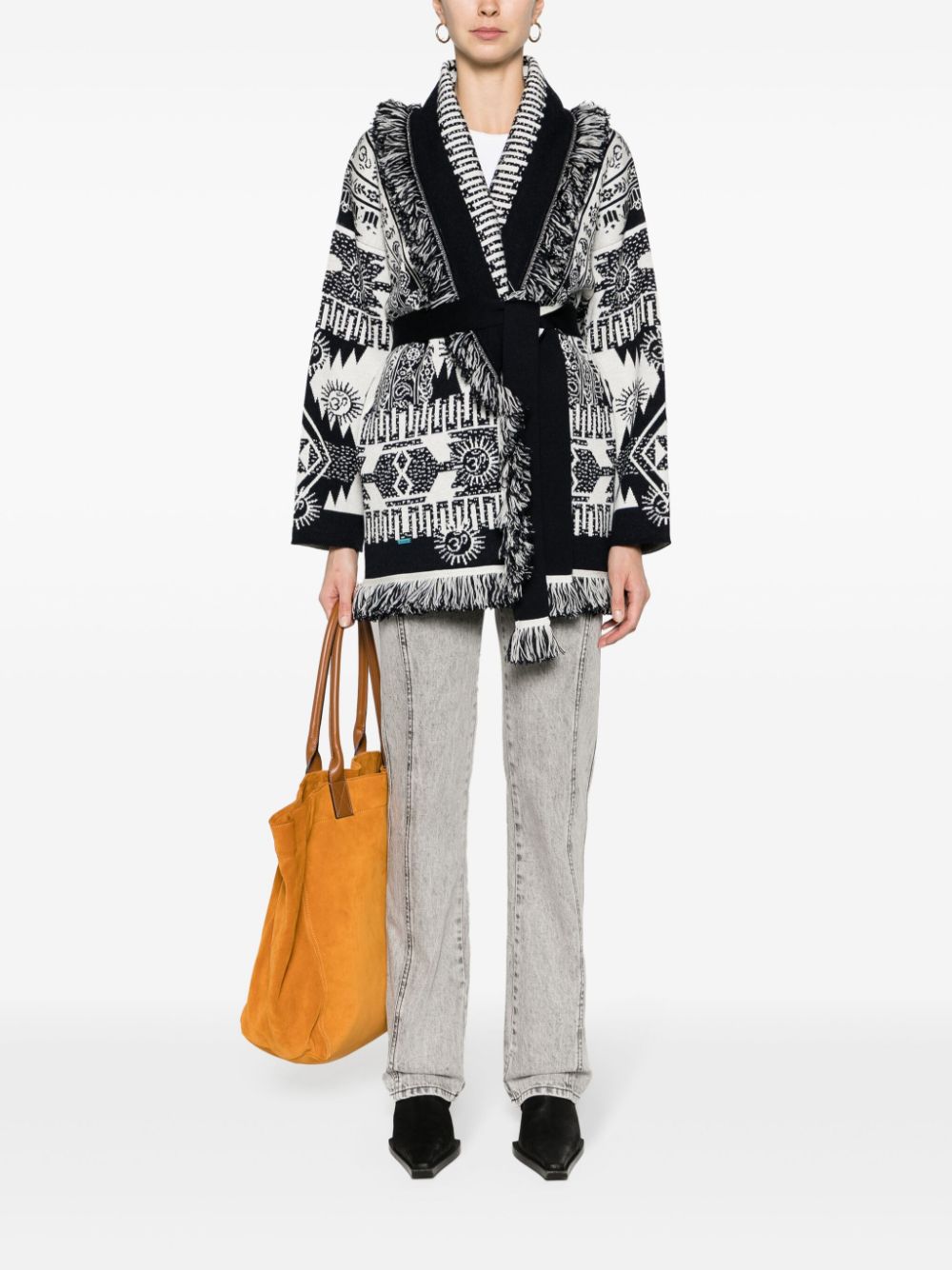navy blue/white wool blend patterned jacquard fringed edge shawl lapels self-tie fastening long sleeves straight hem