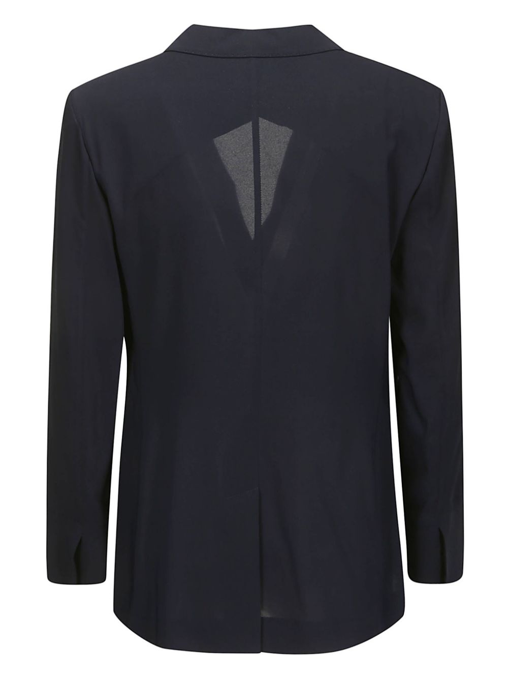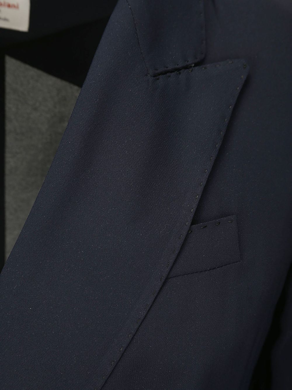 navy blue peak lapels long sleeves buttoned cuffs chest welt pocket two front flap pockets American rear vent unlined double-breasted button fastening