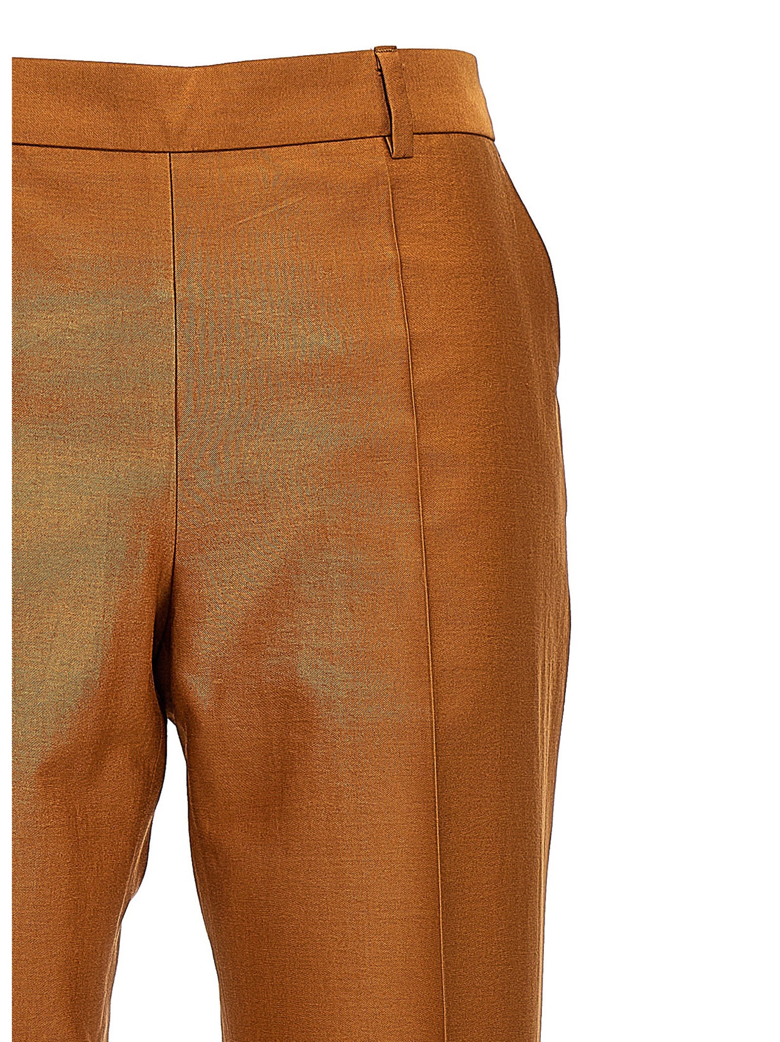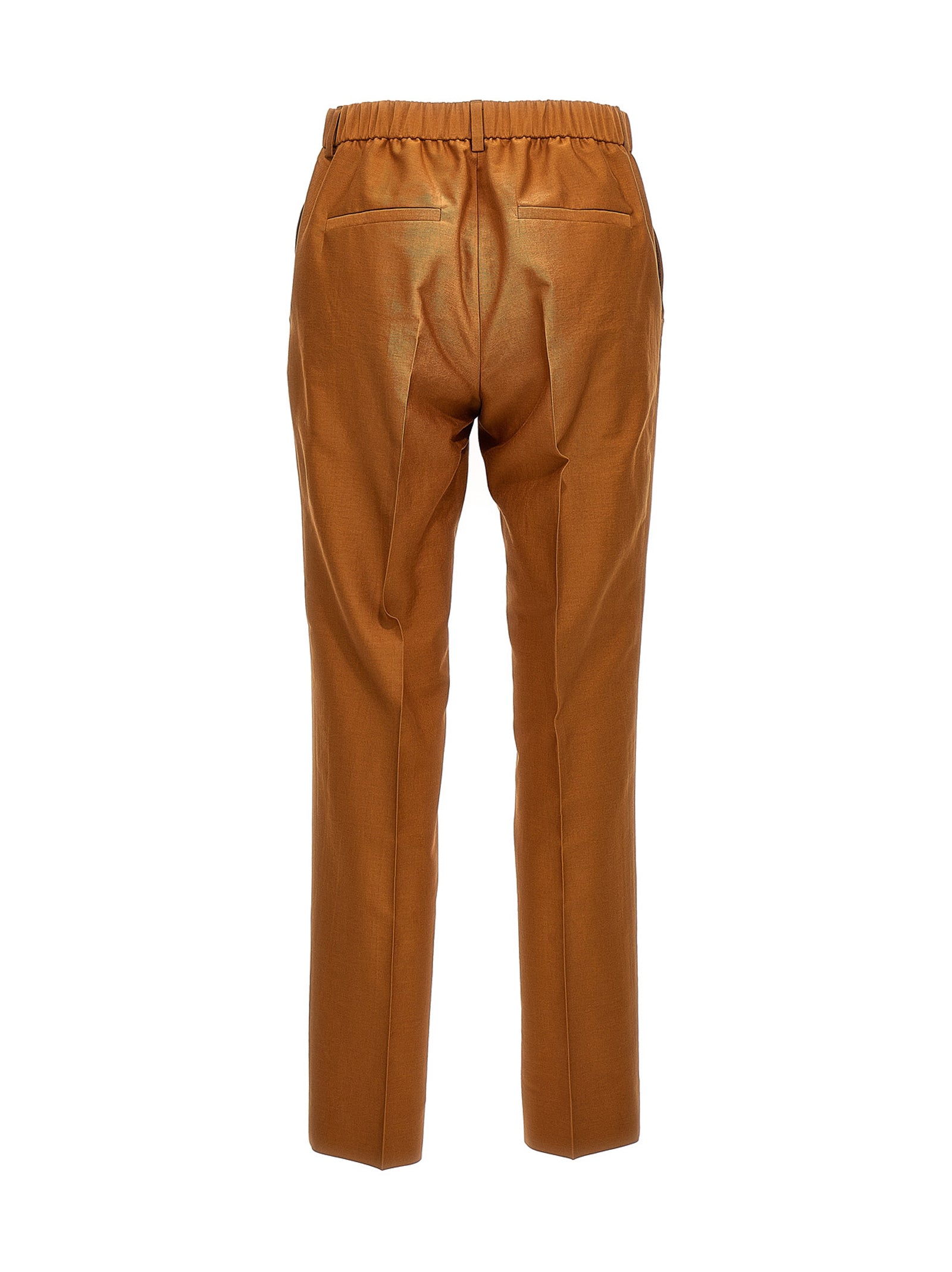 Cotton pants with elastic half at the waist, a side zip closure, pockets and a central crease.