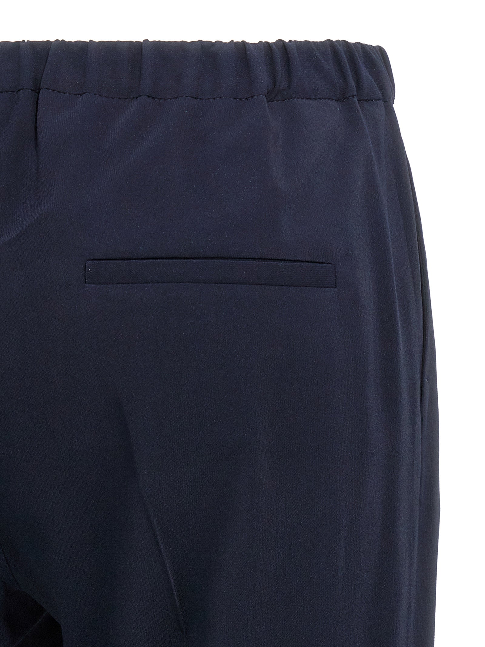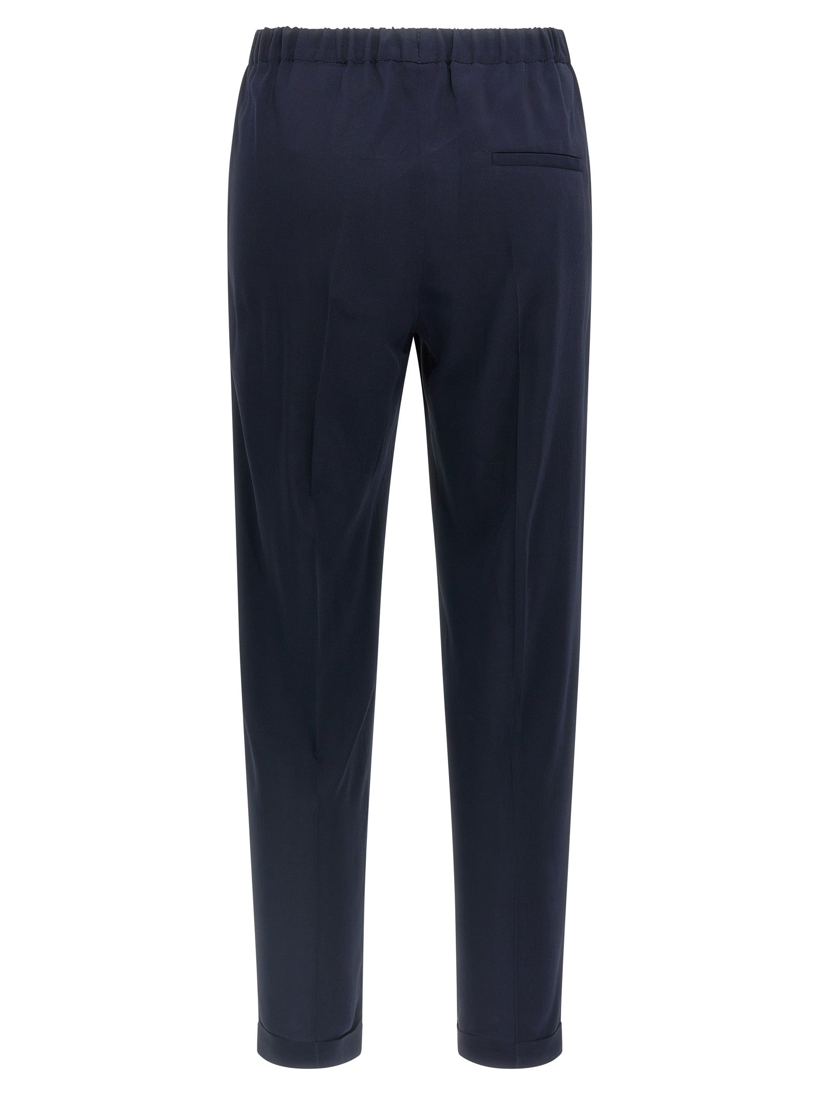 Stretch crepe georgette viscose pants, pleat and stretched crease, elastic waistband, pockets.