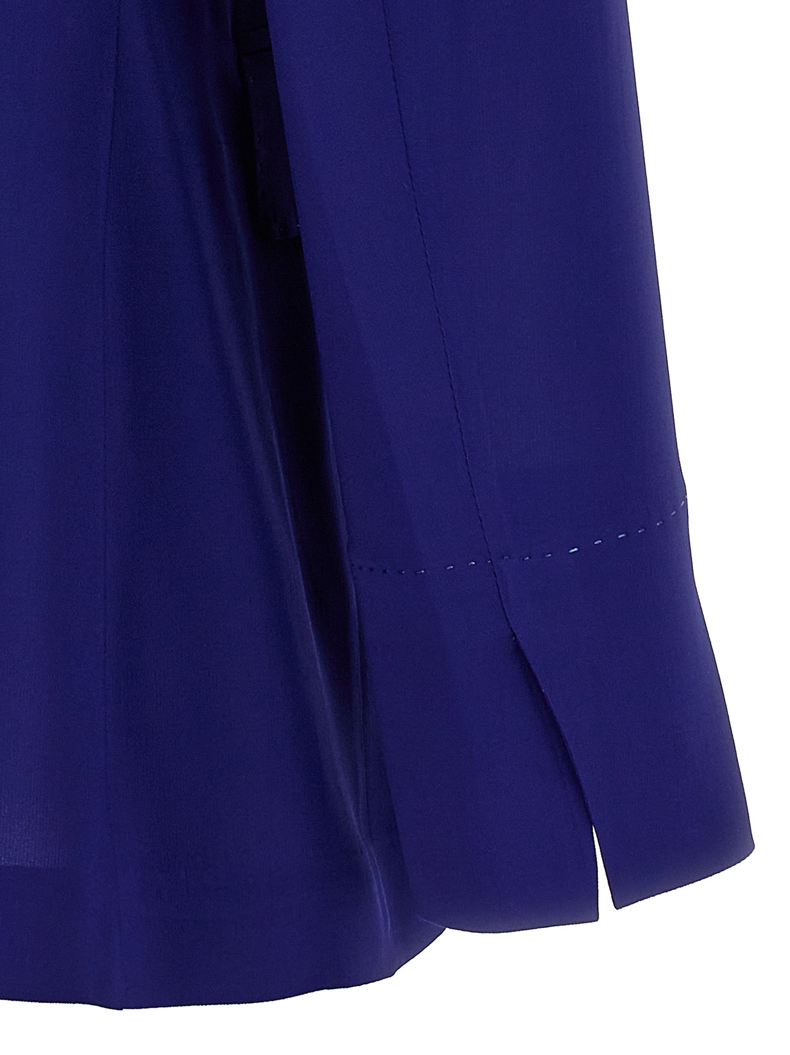 Semi-transparent lightweight viscose blazer with contrast stitching, double-breasted style with button closure, peak lapels, pockets, long sleeves, slightly padded shoulder straps, back split.