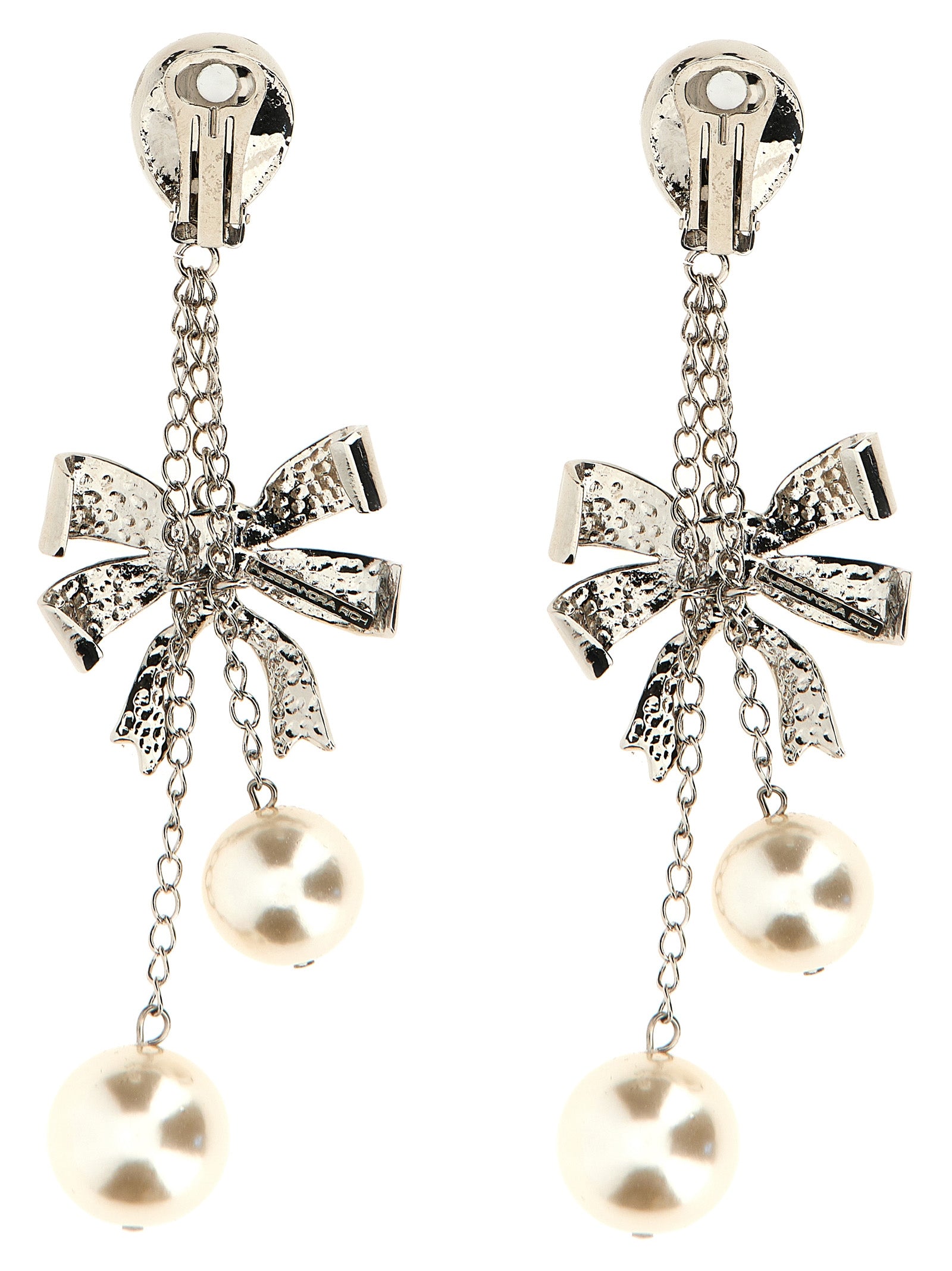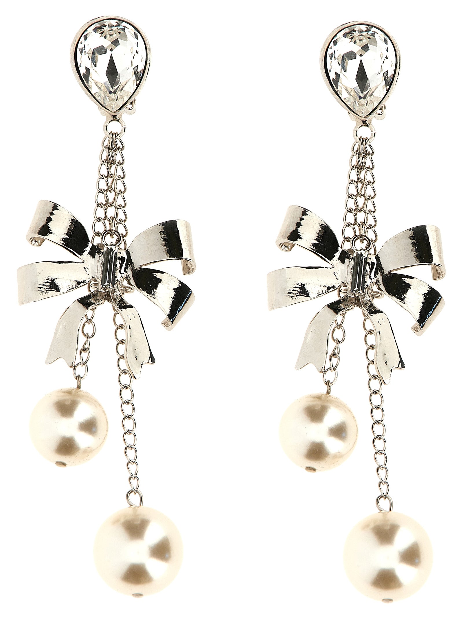 Bow' metal earrings featuring maxi pearls, bows and crystals. ITEM CANNOT BE RETURNED
