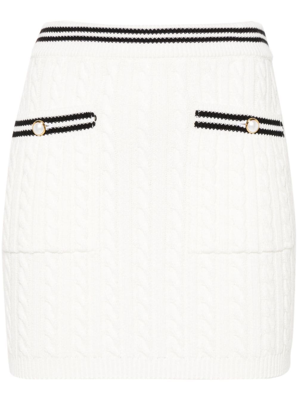 white, black cotton chunky cable knit striped edge elasticated waistband two front buttoned patch pockets unlined ribbed hem mother-of-pearl buttons pull-on style