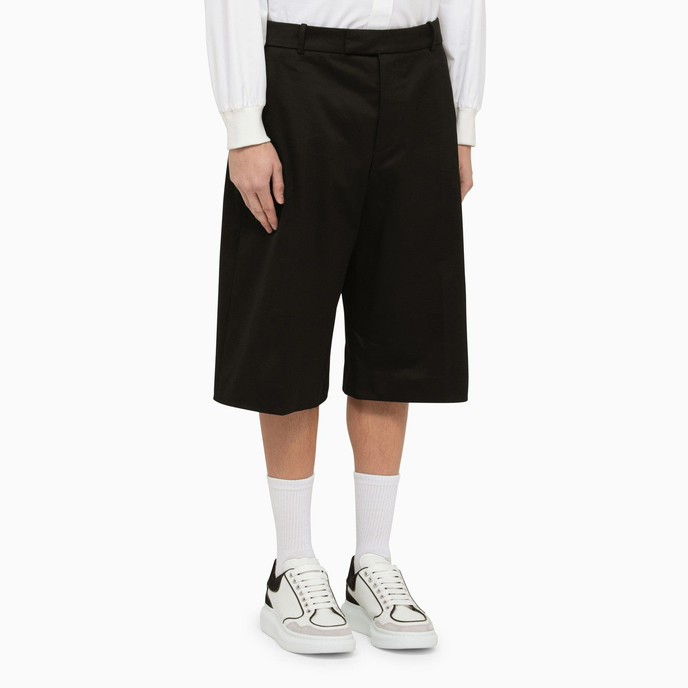 Black baggy Bermuda shorts by Alexander McQueen featuring a concealed zip and hook fastening, belt loops, two side pockets and two flap pockets on the back.