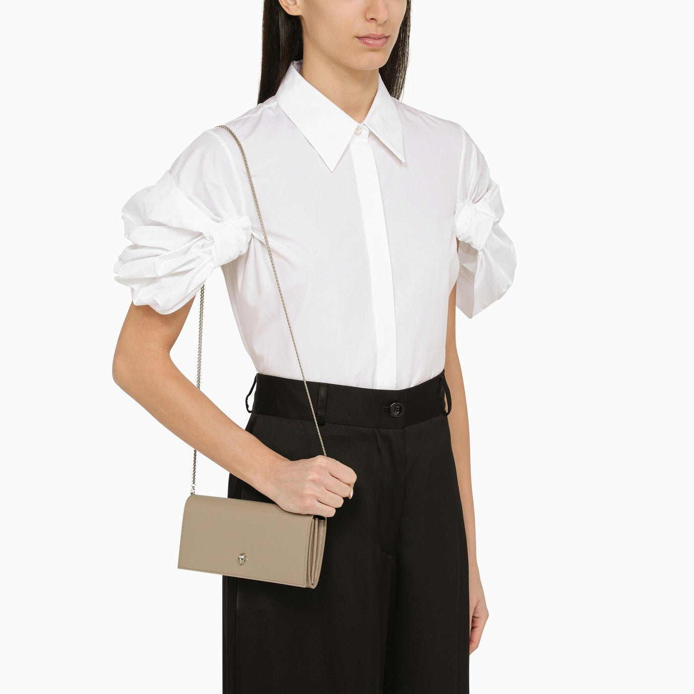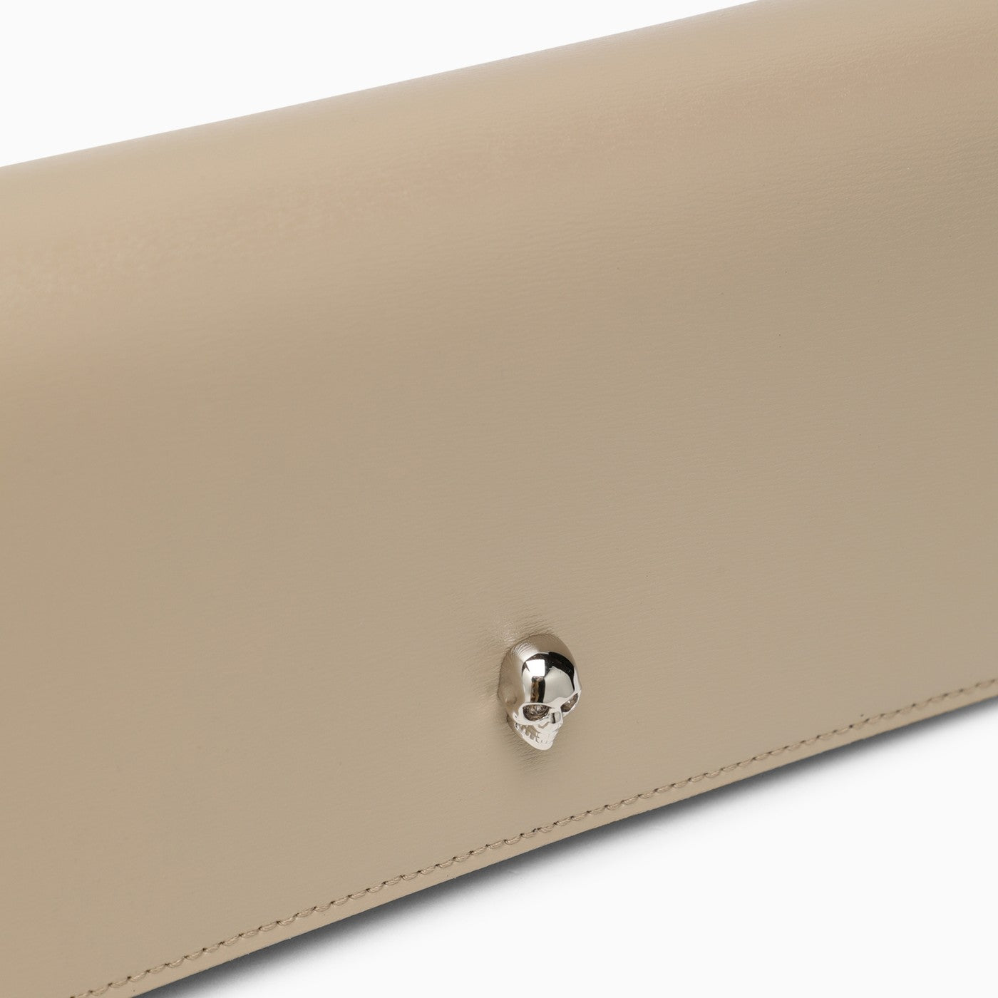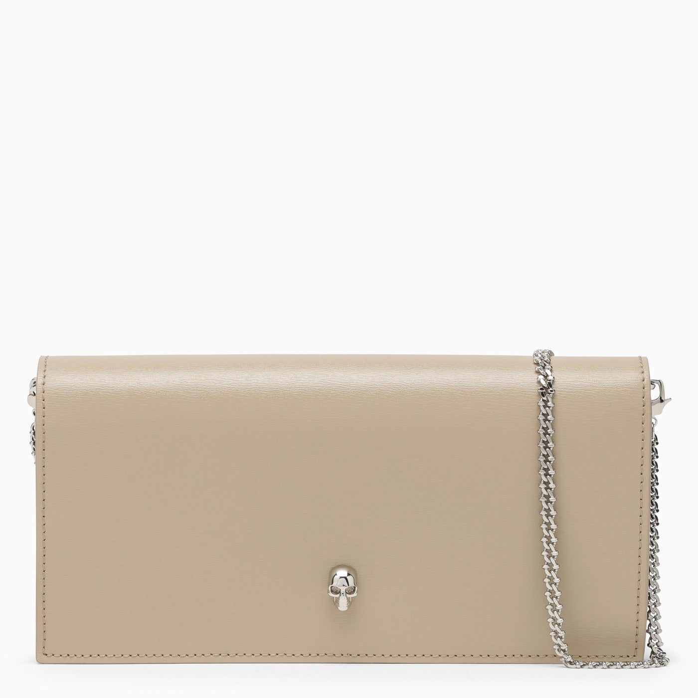 Chain wallet by Alexander McQueen in camel beige leather featuring a detachable metal chain shoulder strap with a silver-tone finish, a front flap with a press stud Skull button, an internal central zip pocket and an engraved logo on the back.