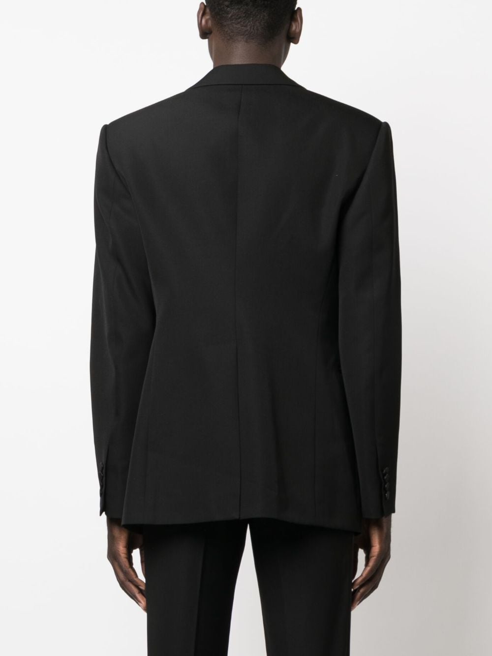 single-breasted blazer from Alexander McQueen featuring black, wool, peak lapels, front button fastening, long sleeves, buttoned cuffs and two side welt pockets.