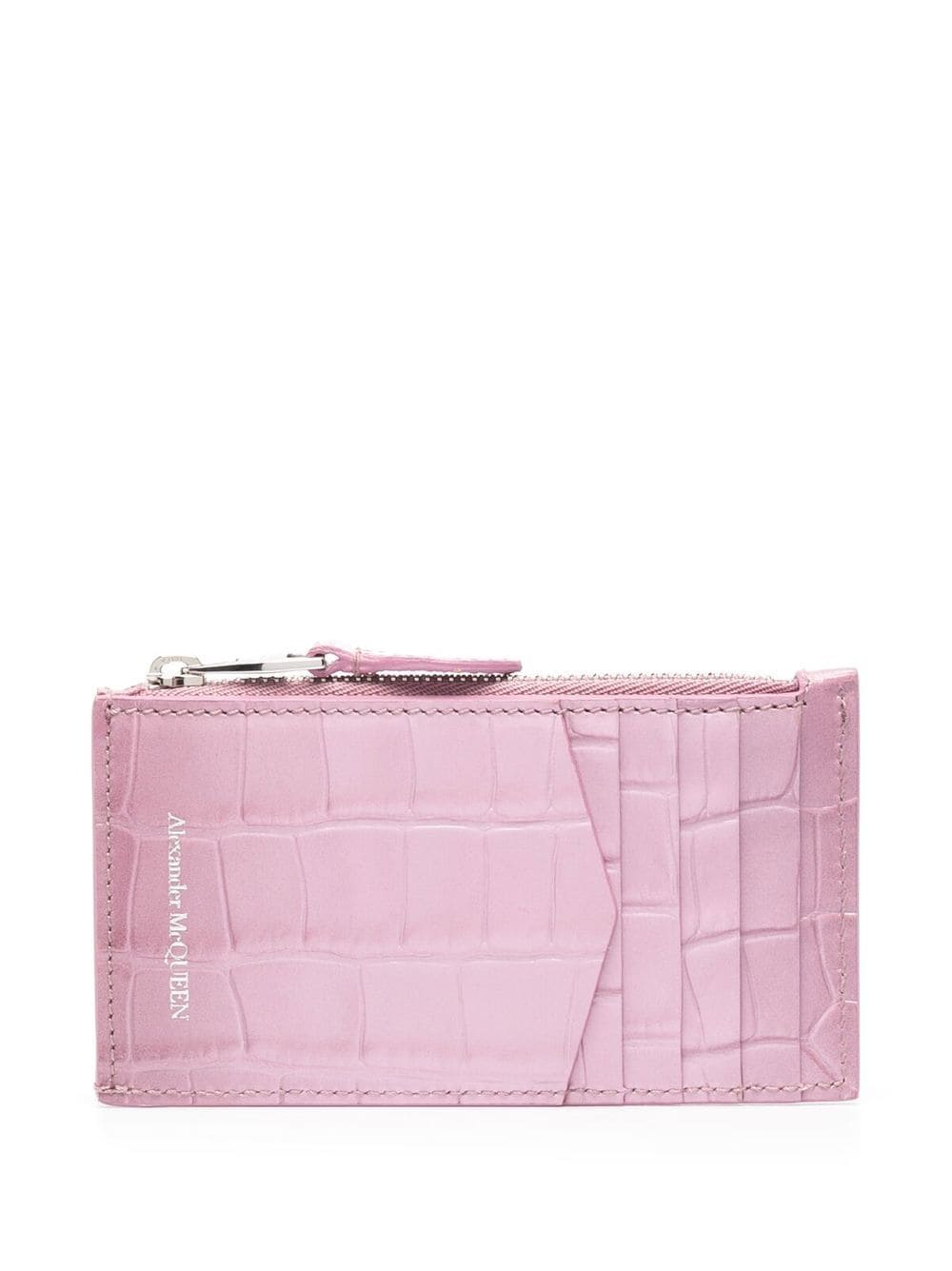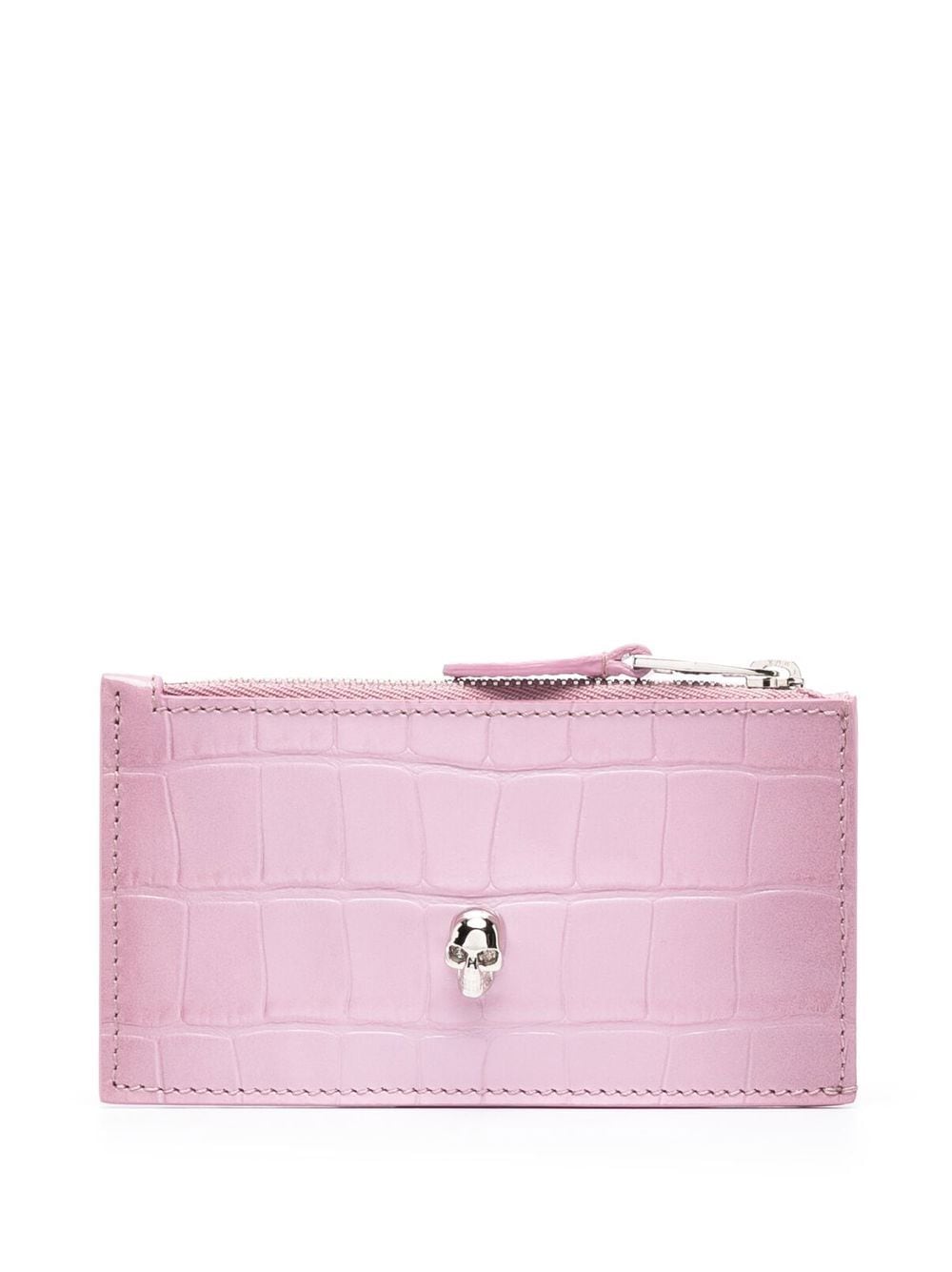 Skull-charm leather wallet from Alexander McQueen featuring flamingo pink, calf leather, embossed crocodile effect, skull charm and top zip fastening.