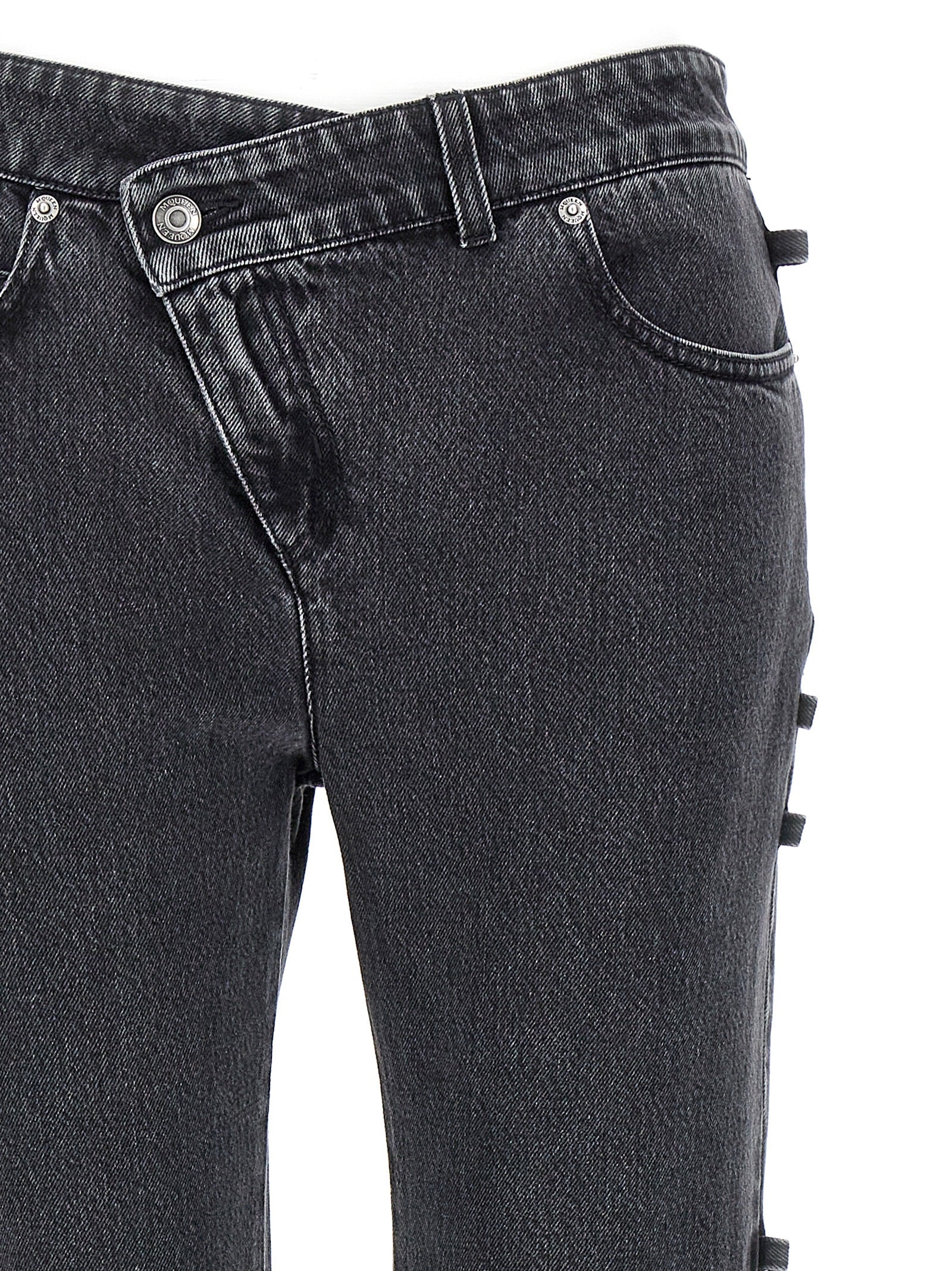 Jeans in black cotton denim délavé, zip and asymmetric button closure, five pockets, leather logo tag.