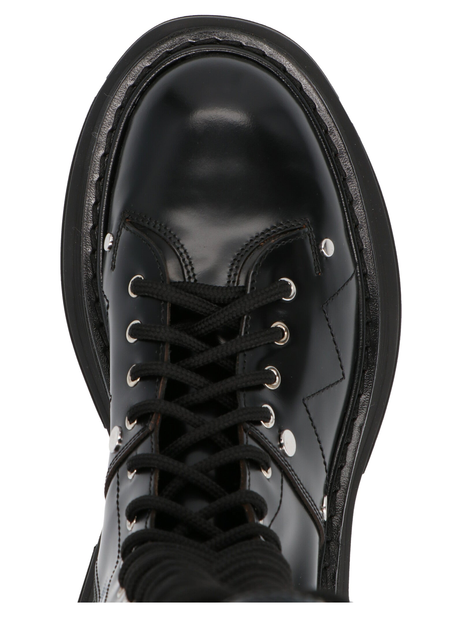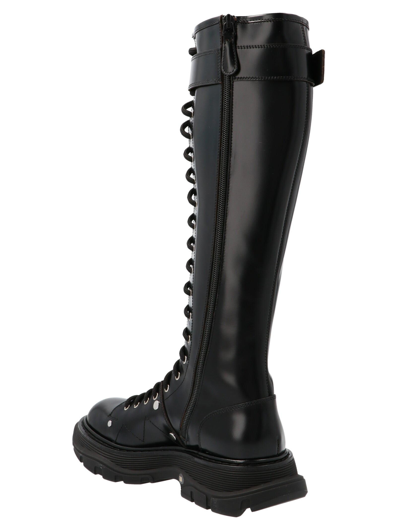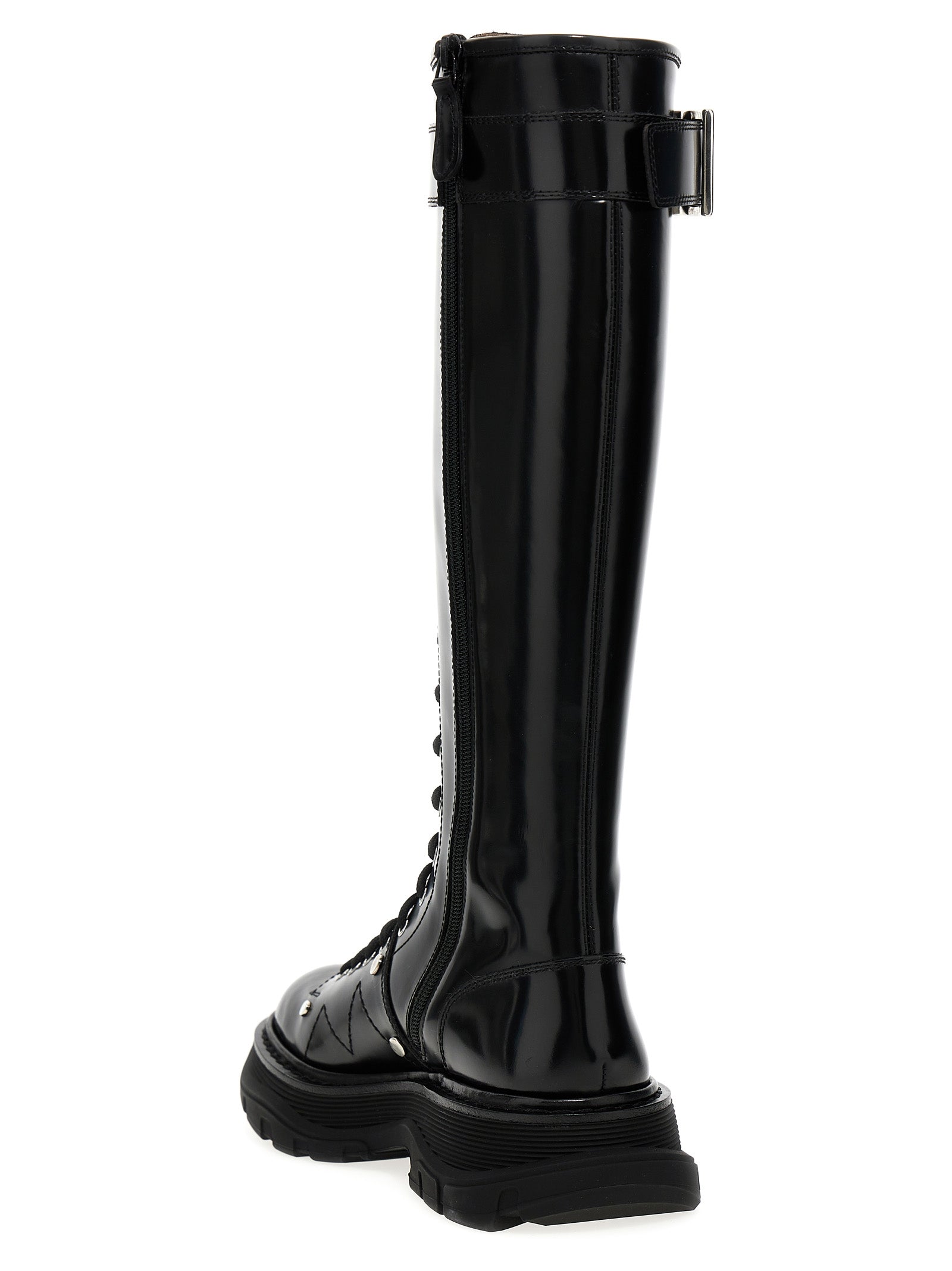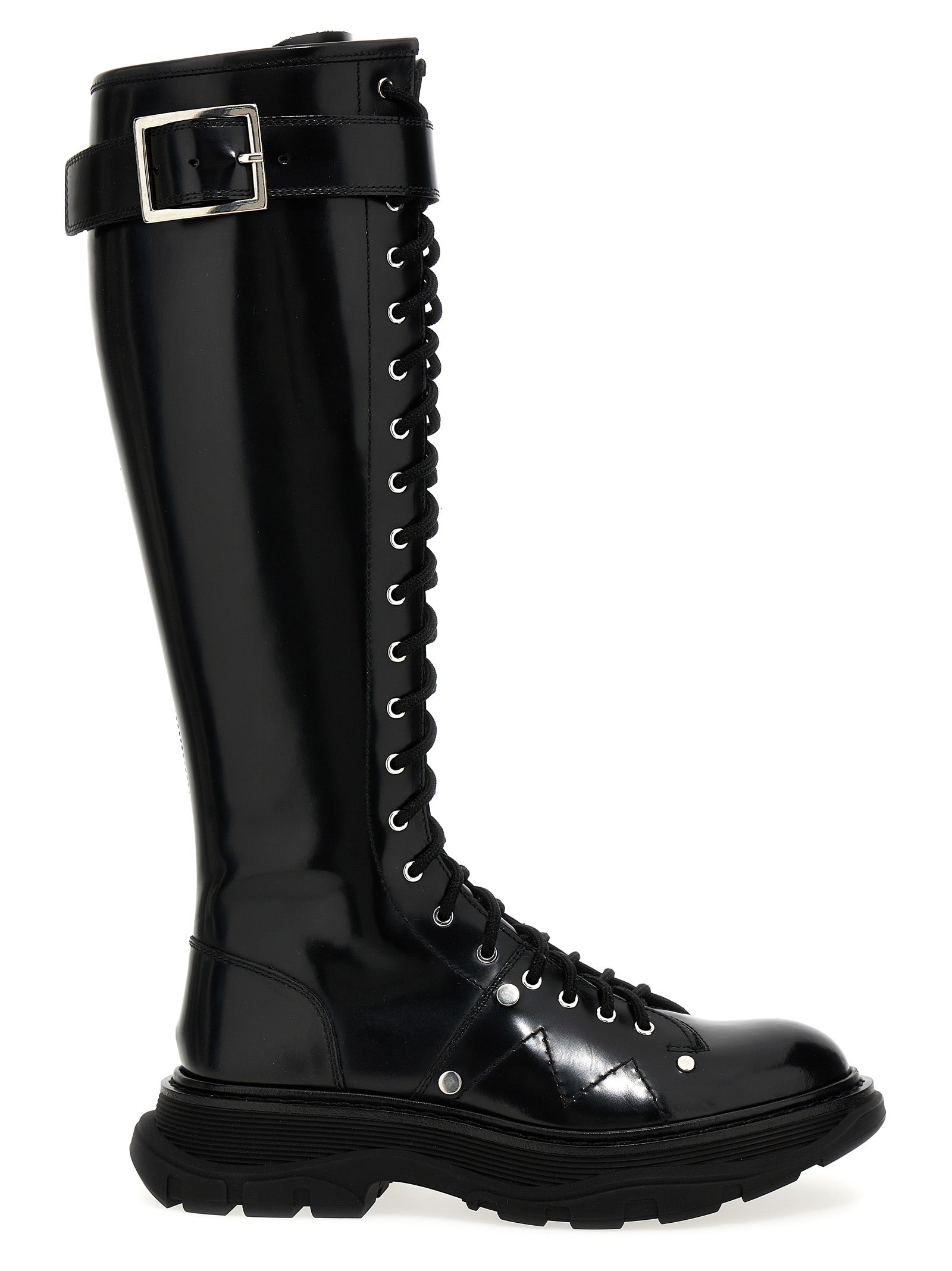 Alexander McQueen iconic 'Tread sole' black patent leather knee-high boots with tone-on-tone laces, iconic oversize sole, silver hardware and buckle.
