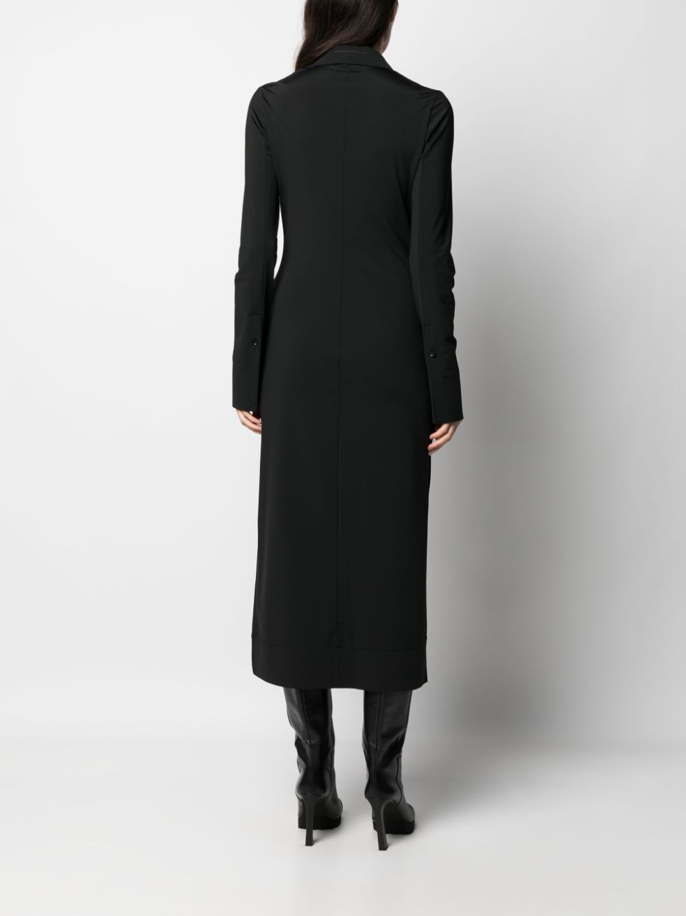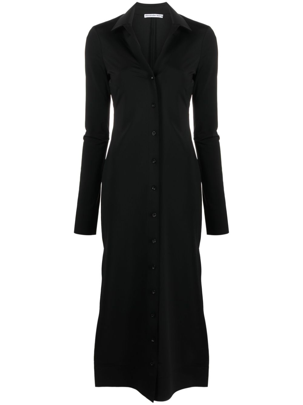 embossed-logo midi shirtdress from ALEXANDER WANG featuring embossed logo to the rear, side slits, buttoned-cuff sleeves, camp collar, V-neck, front button fastening, long sleeves, mid-length and black.