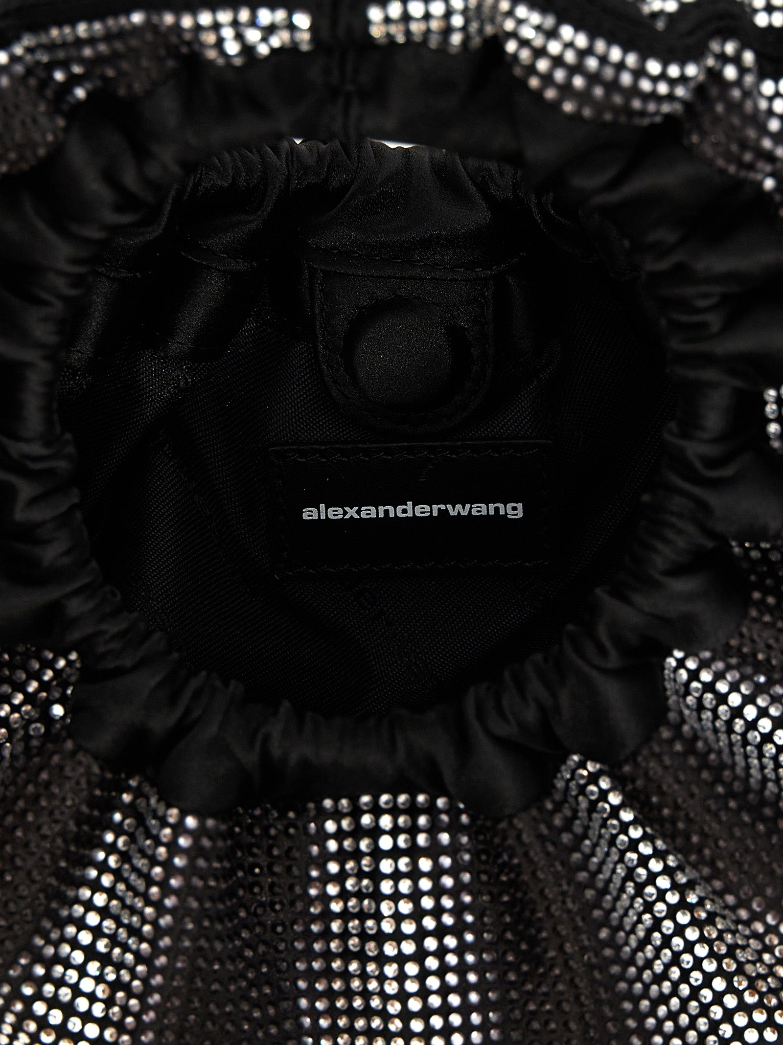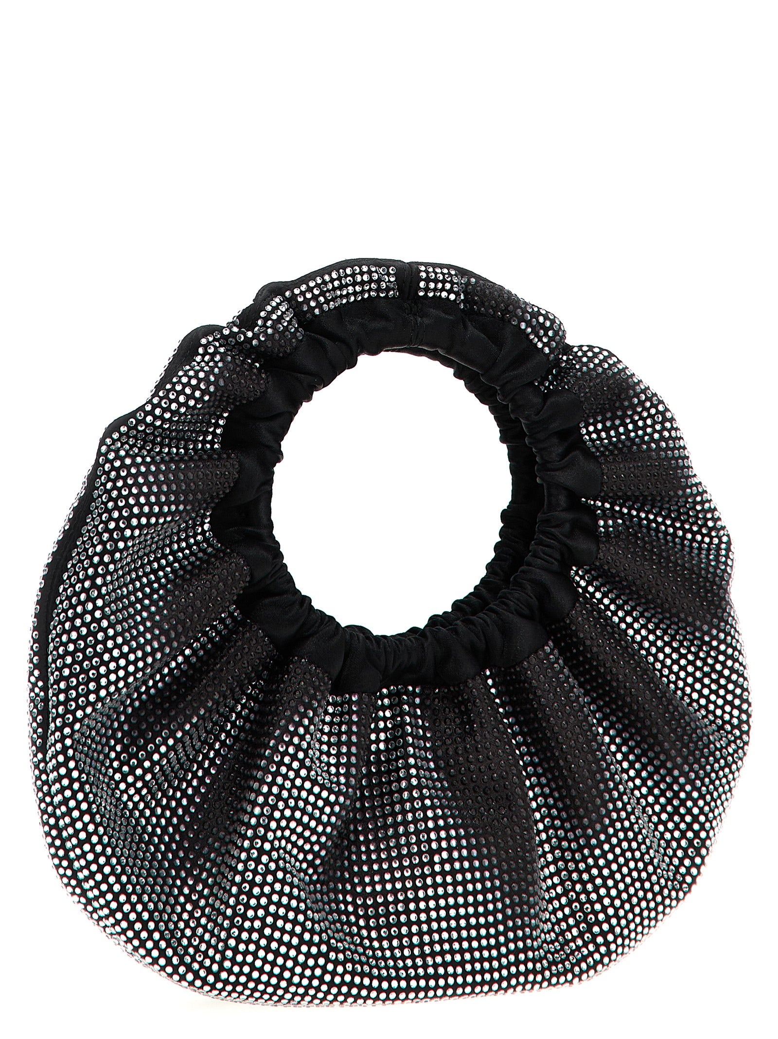 'Crescent Mini' satin handbag with all-over rhinestone application, magnetic closure, front metal logo.