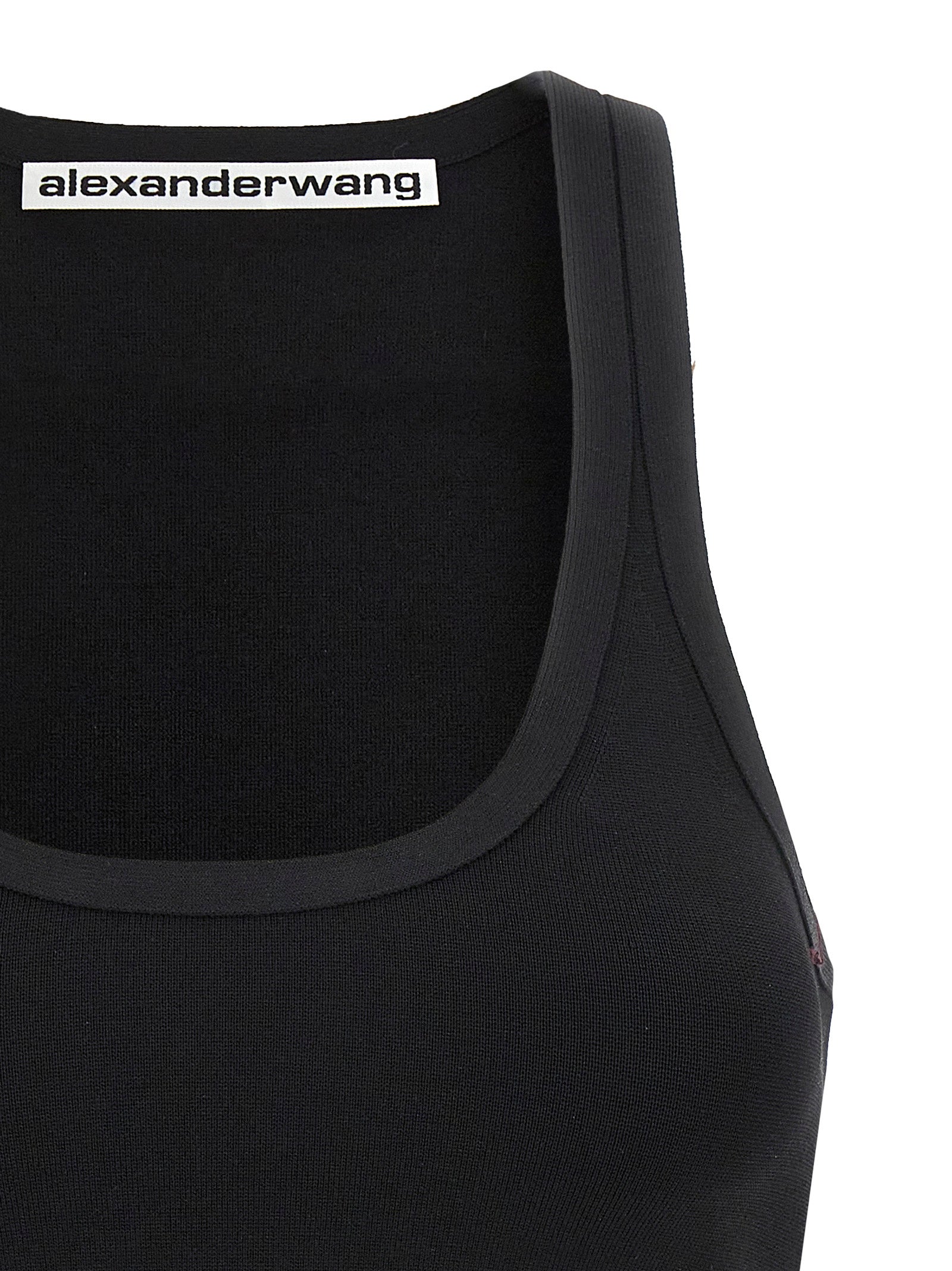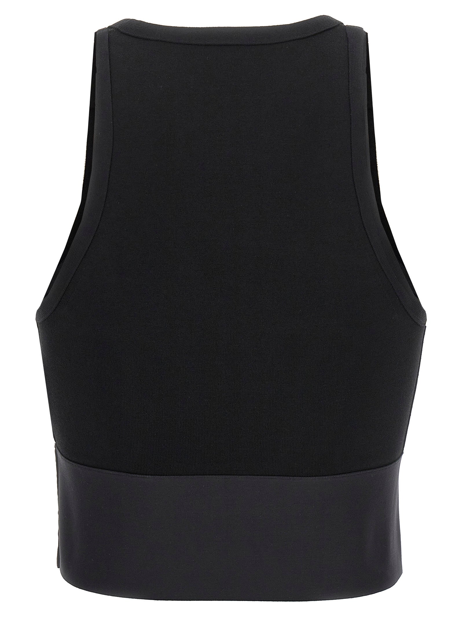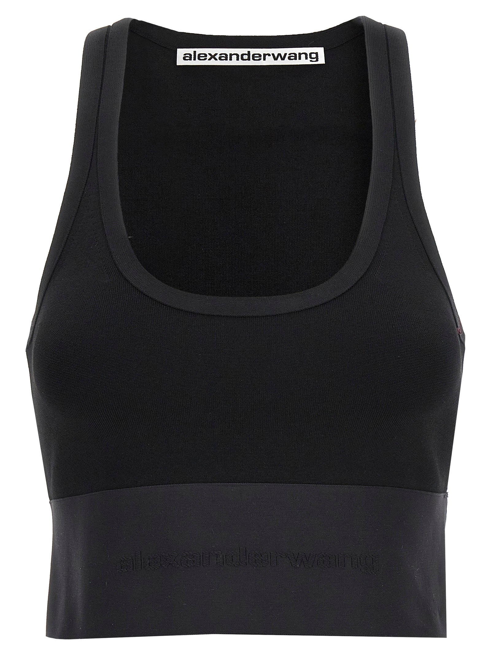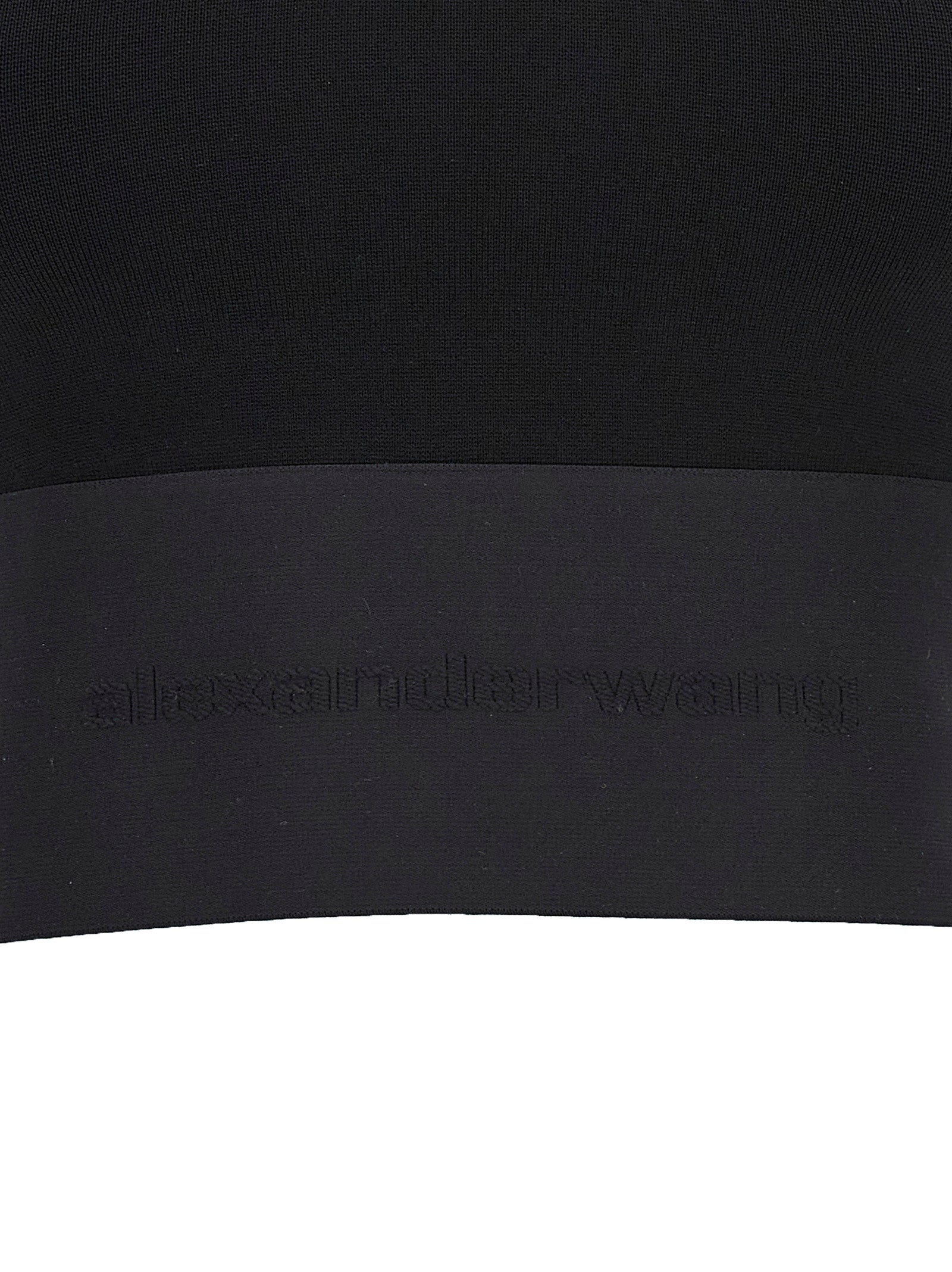 'Scoop Neck Bra' stretch fabric top with wide elastic band with logo, round neckline, cropped model.
