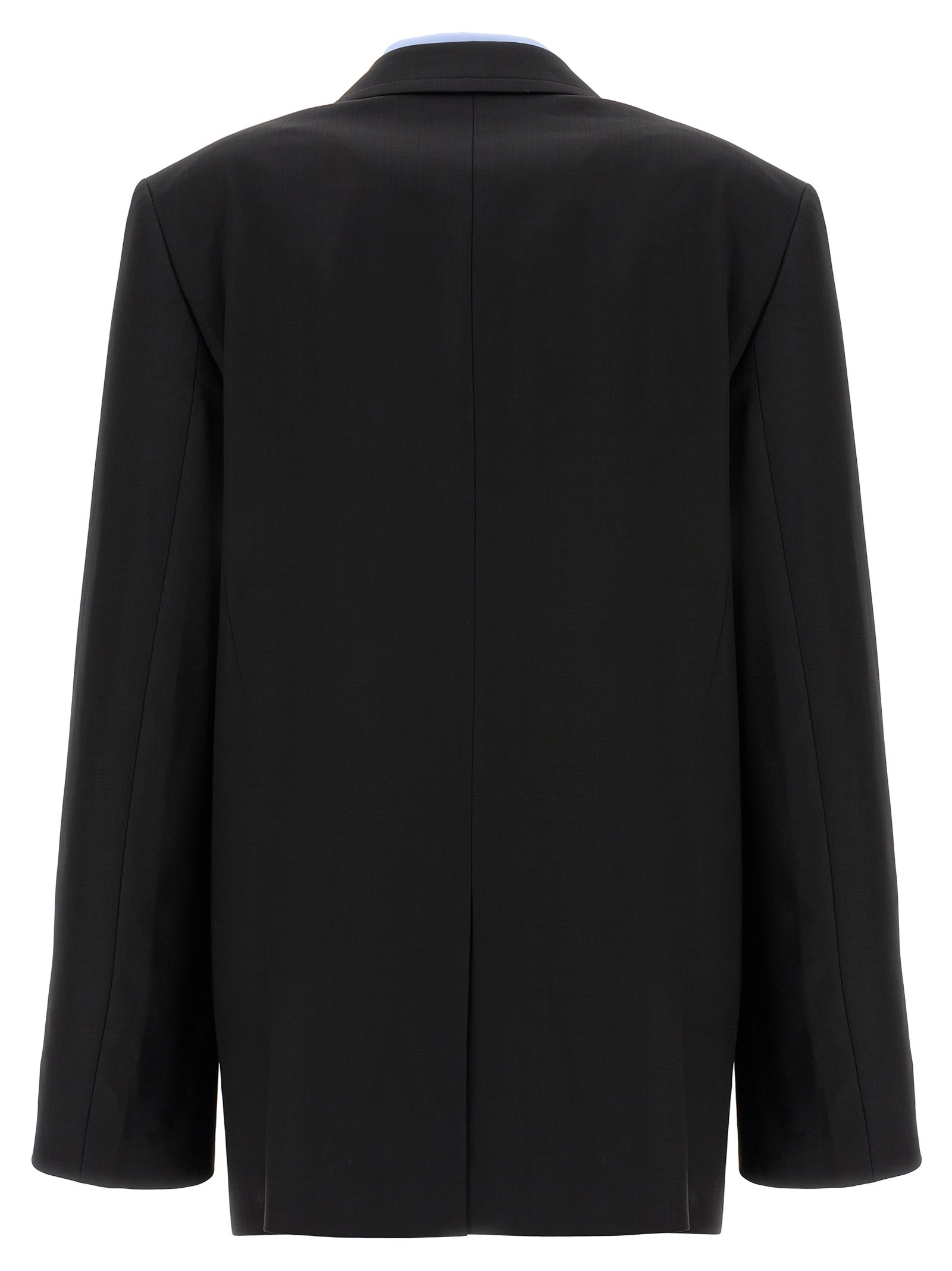 Wool blend blazer with removable front poplin shirt insert, peak lapels, flap pockets, long sleeves, back vent.
