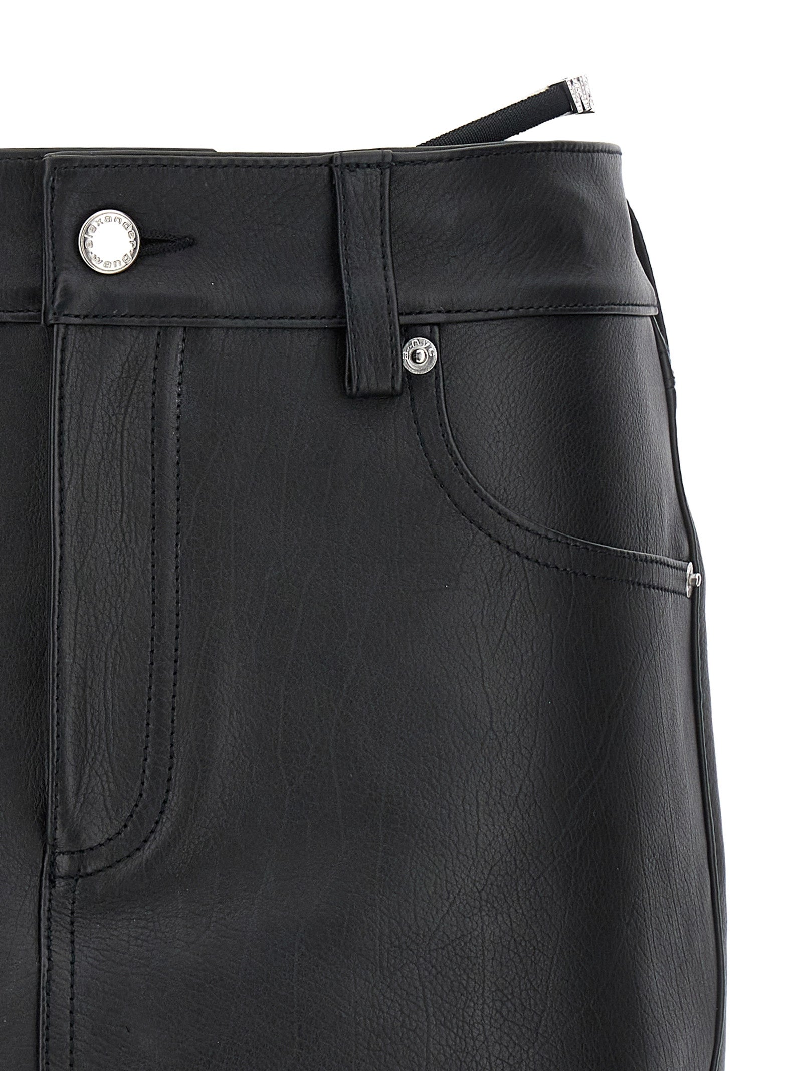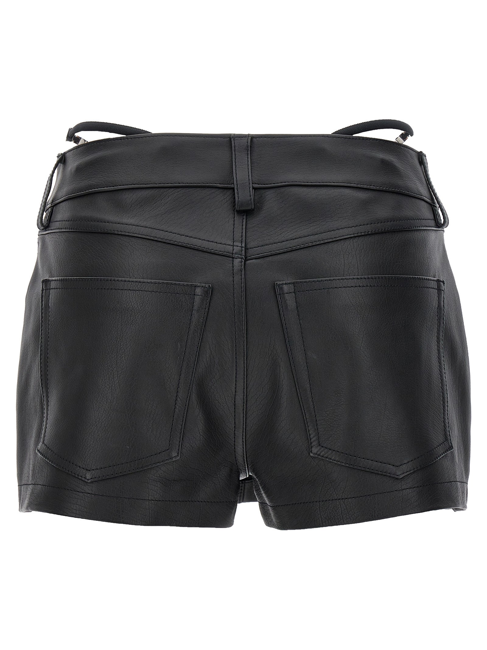 Leather skort with visible thong detail, zip and button closure, five pockets.