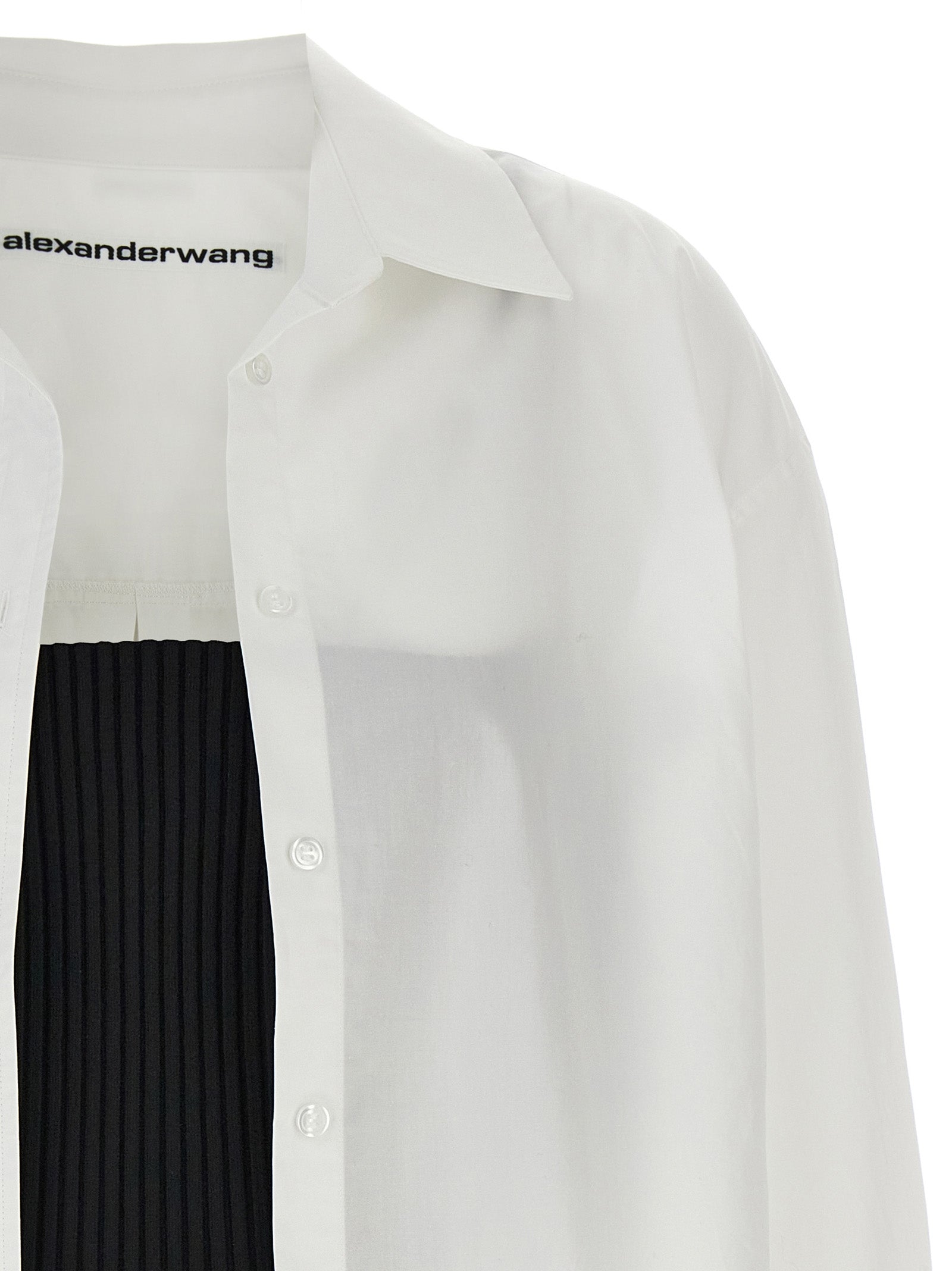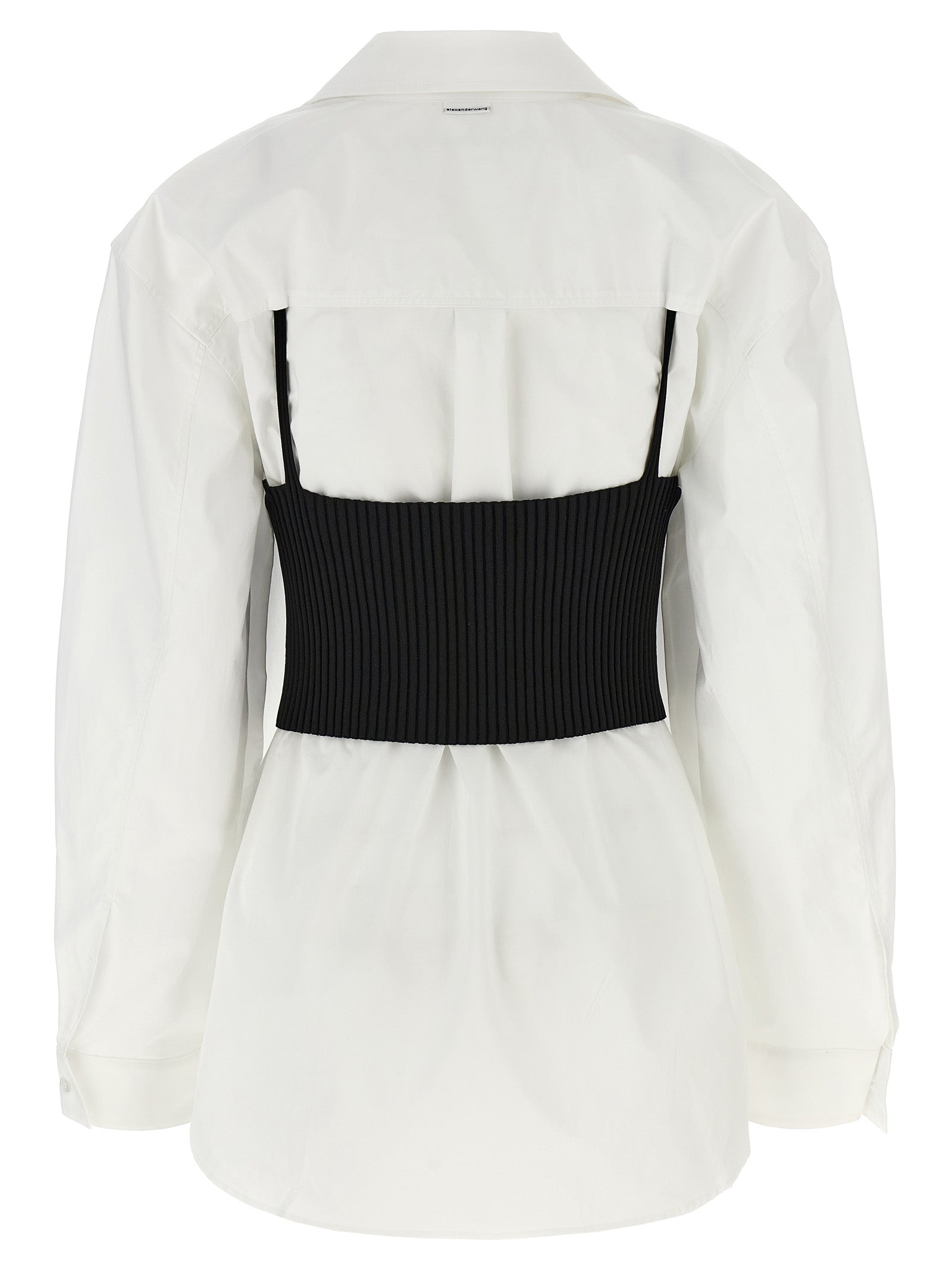 Twin set consisting of cotton shirt and ribbed crop top, thin straps, long cuffed sleeves, and front button closure.