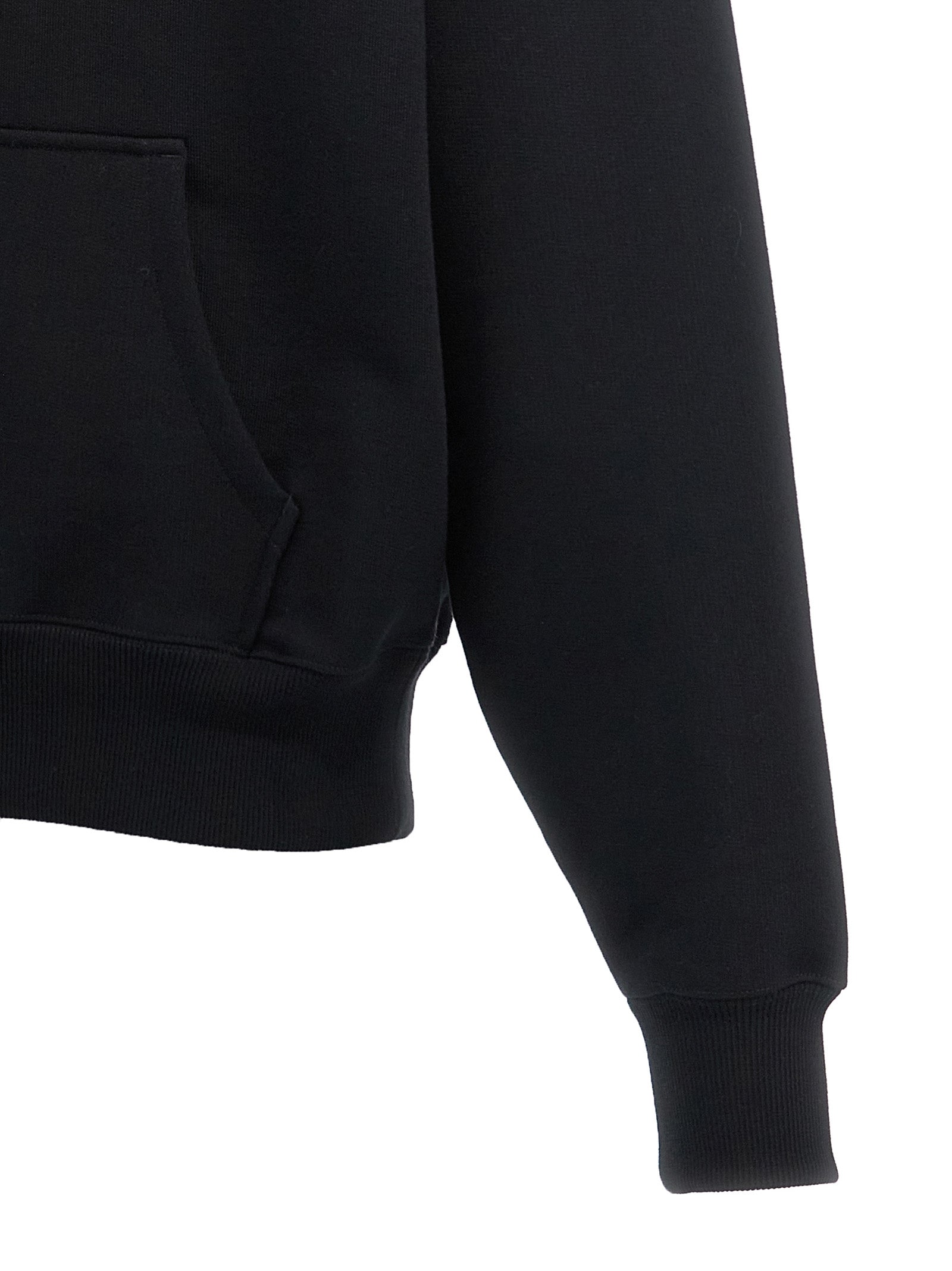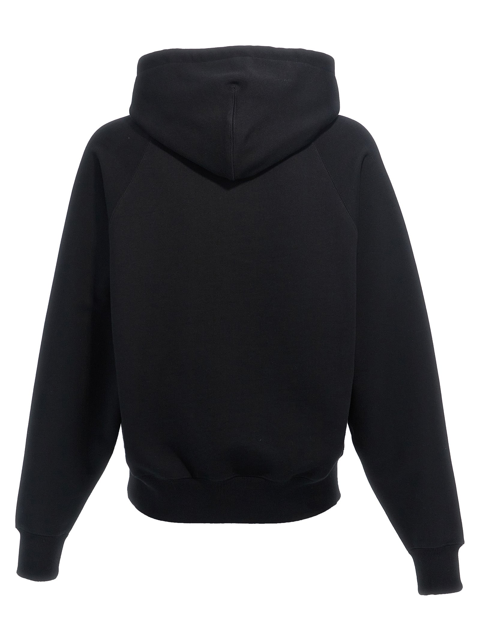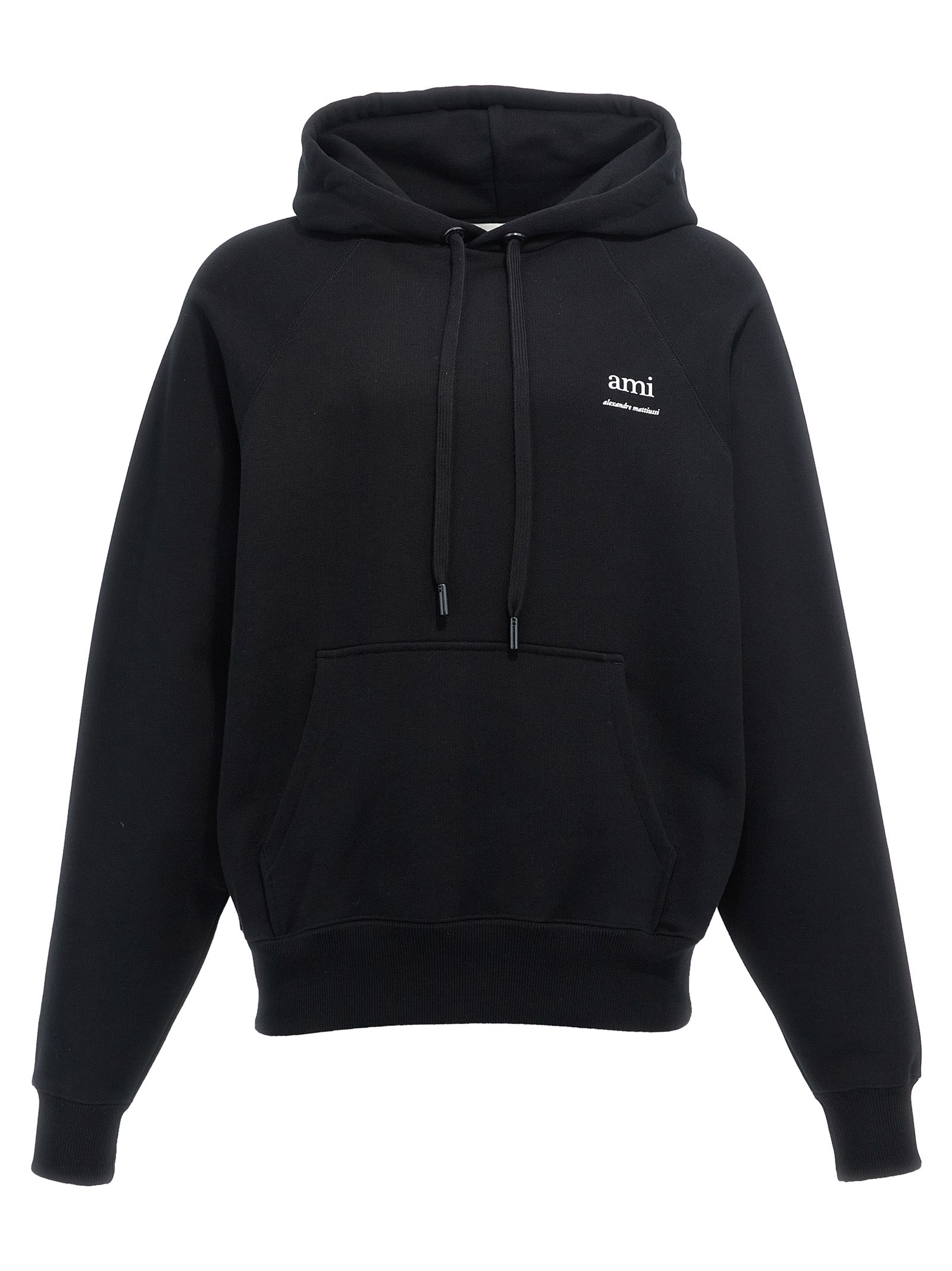 'Ami AM' cotton hoodie with front logo print, kangaroo pocket, long cuffed sleeves.
