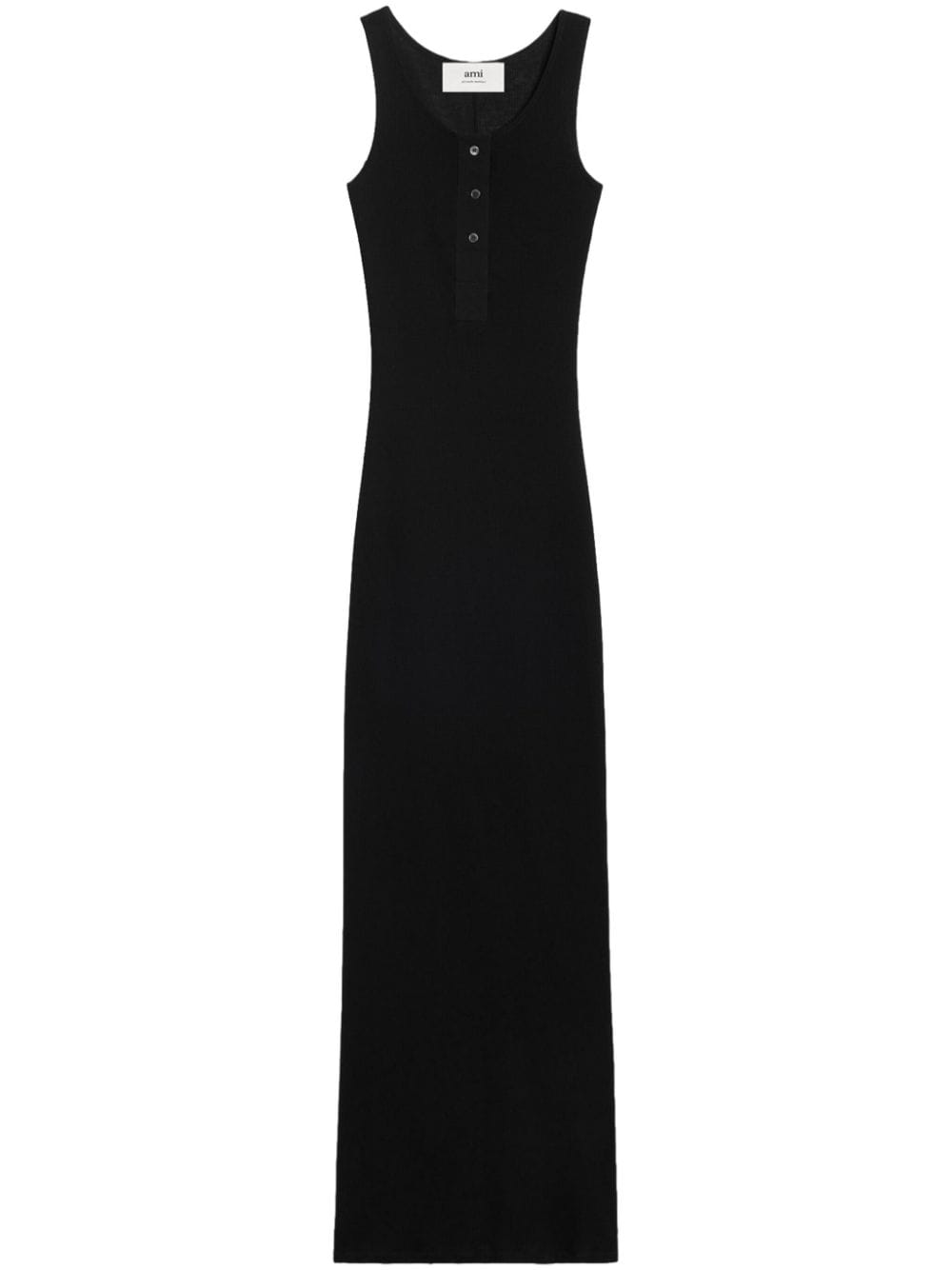 black cotton fine ribbed round neck short front button fastening sleeveless floor-length straight hem
