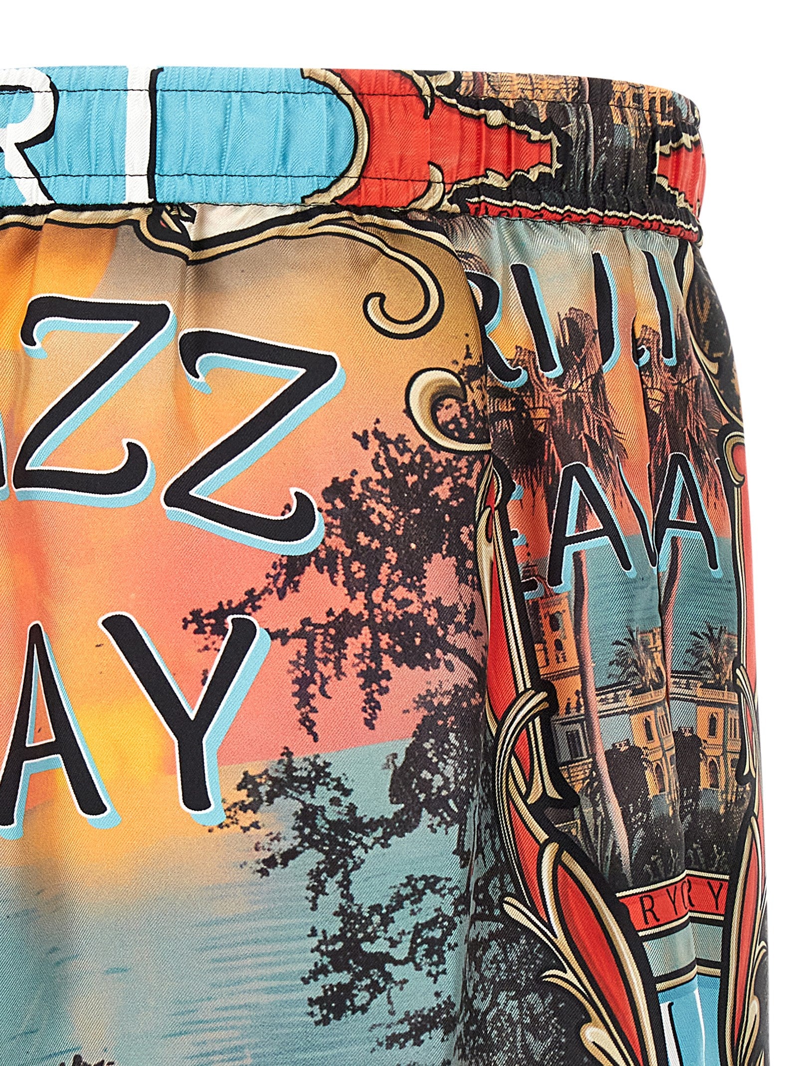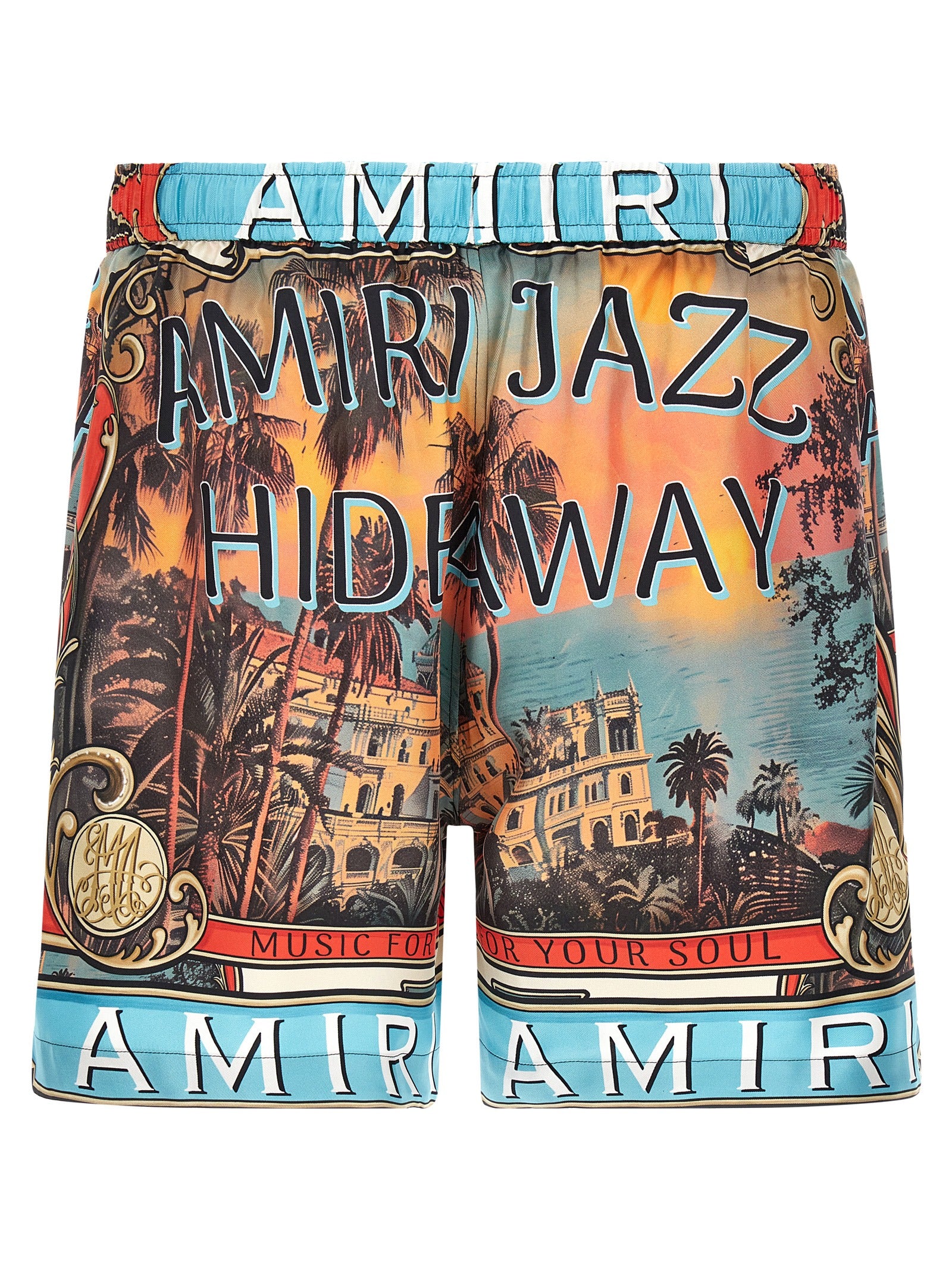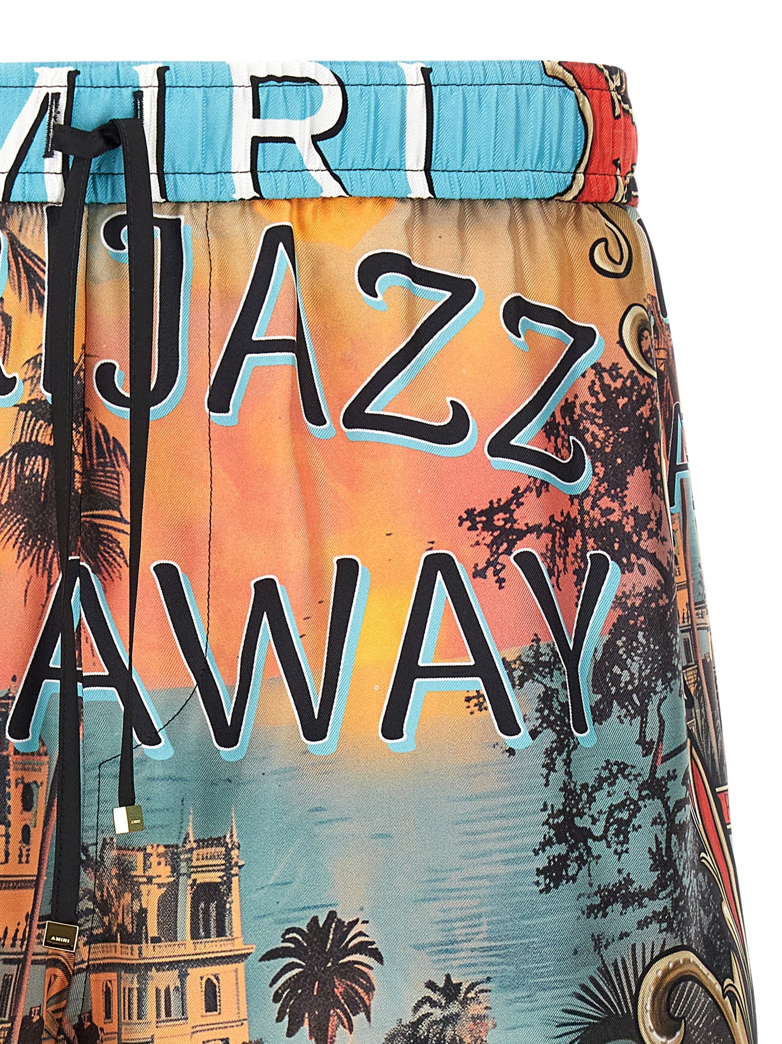 All over 'Amiri Jazz Hideaway' print silk bermuda shorts, adjustable drawstring elastic waistband, pockets.